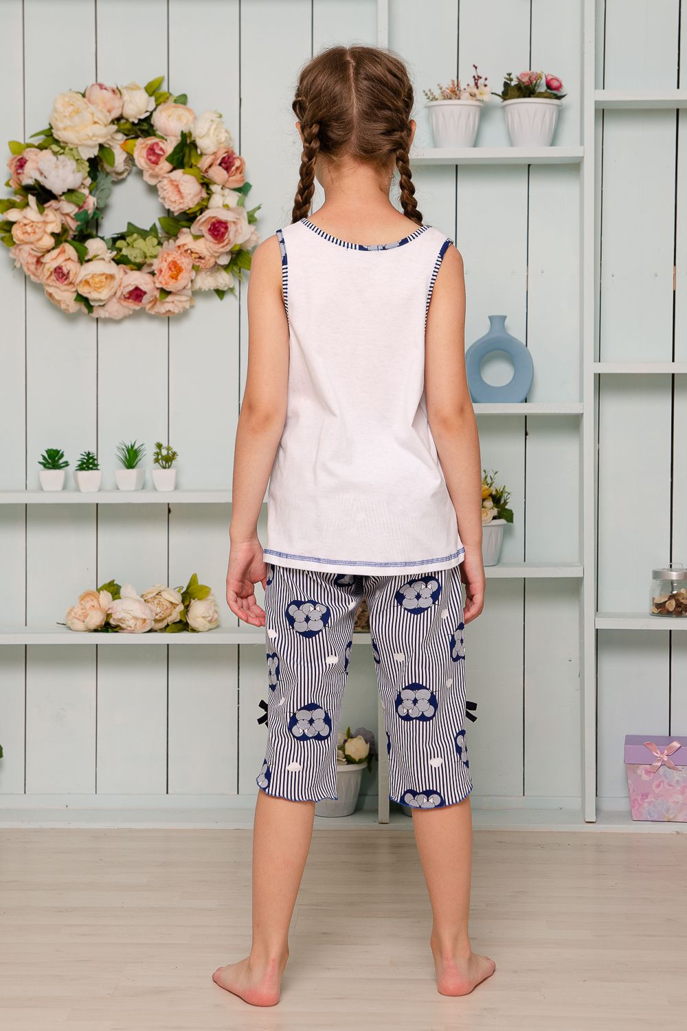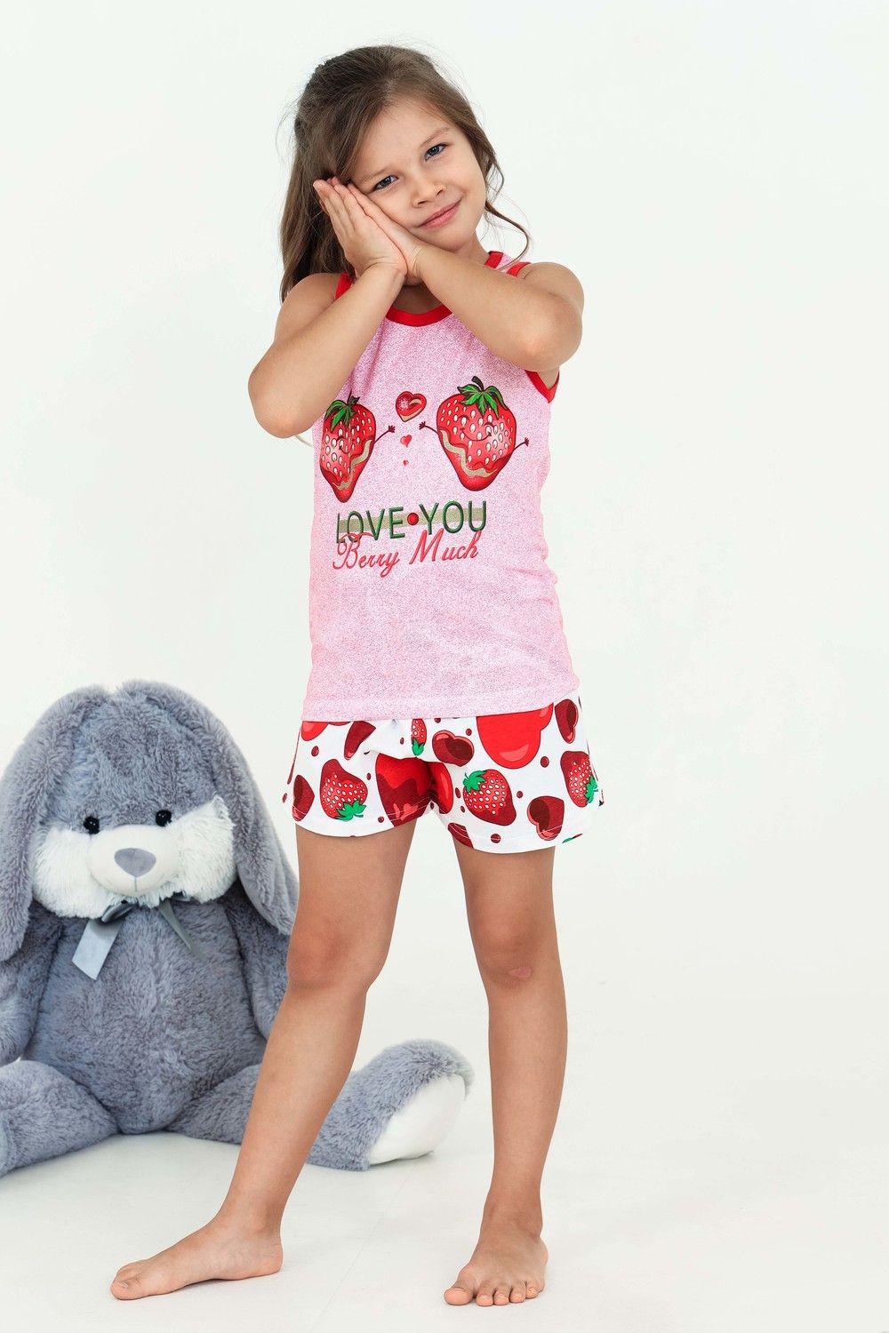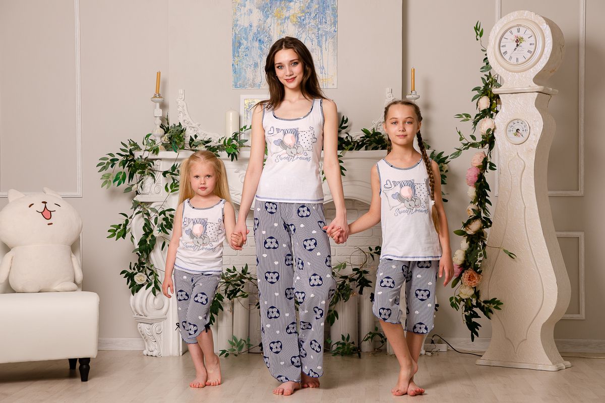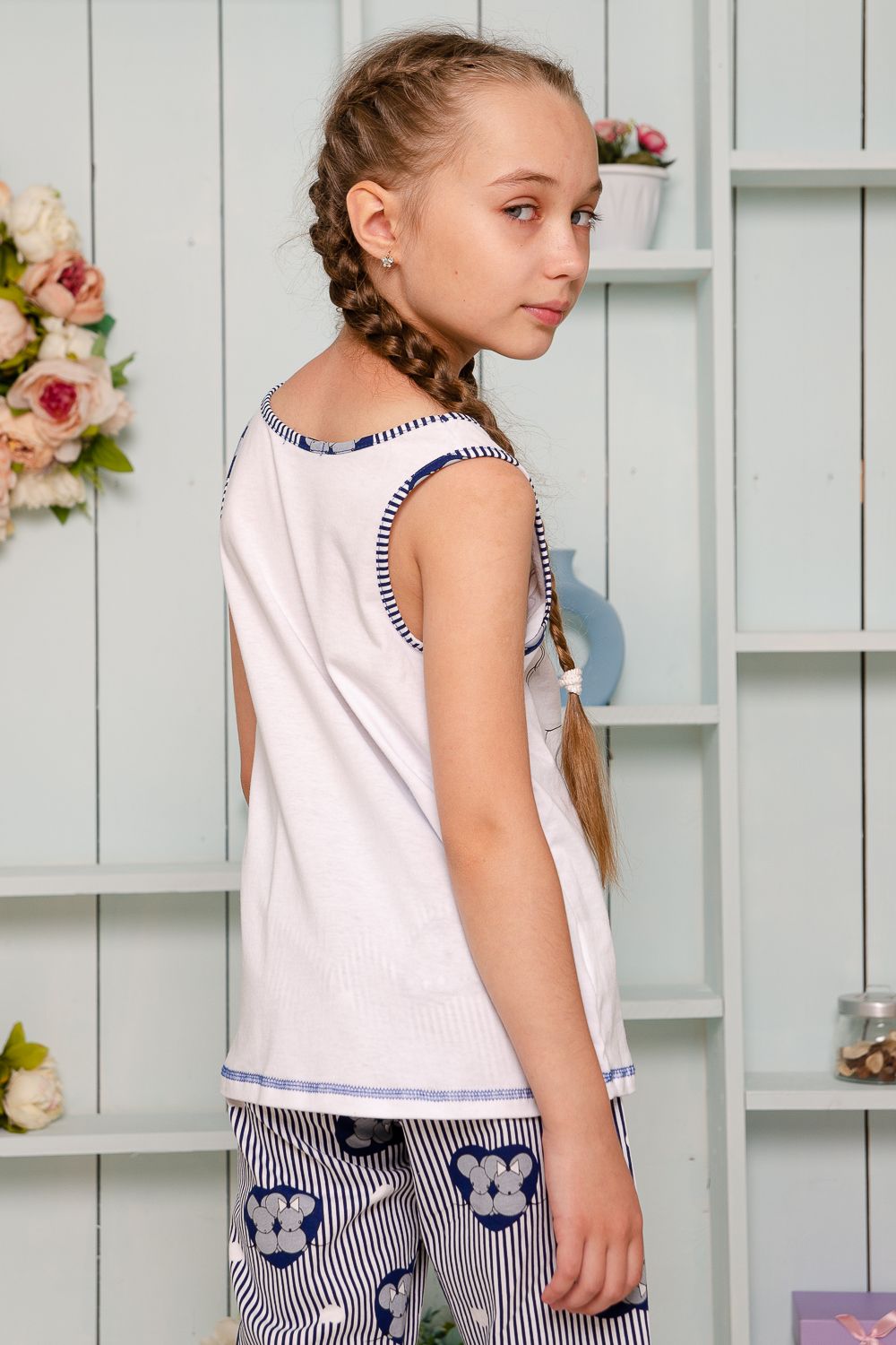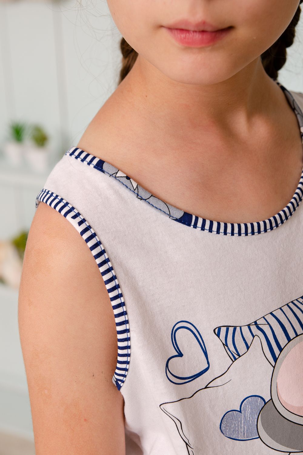Пижама детская состоит из майки и бриджей. Майка с принтом полуприлегающего силуэта, бриджи свободные, без карманов низ обработан декоративной краеобметочной строчкой.