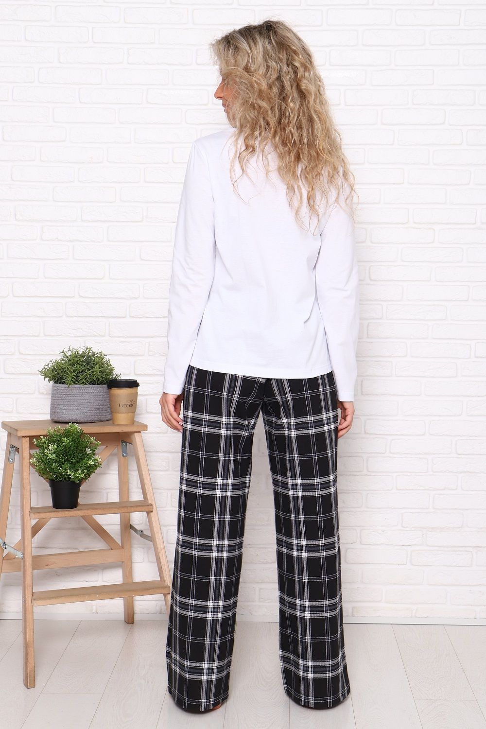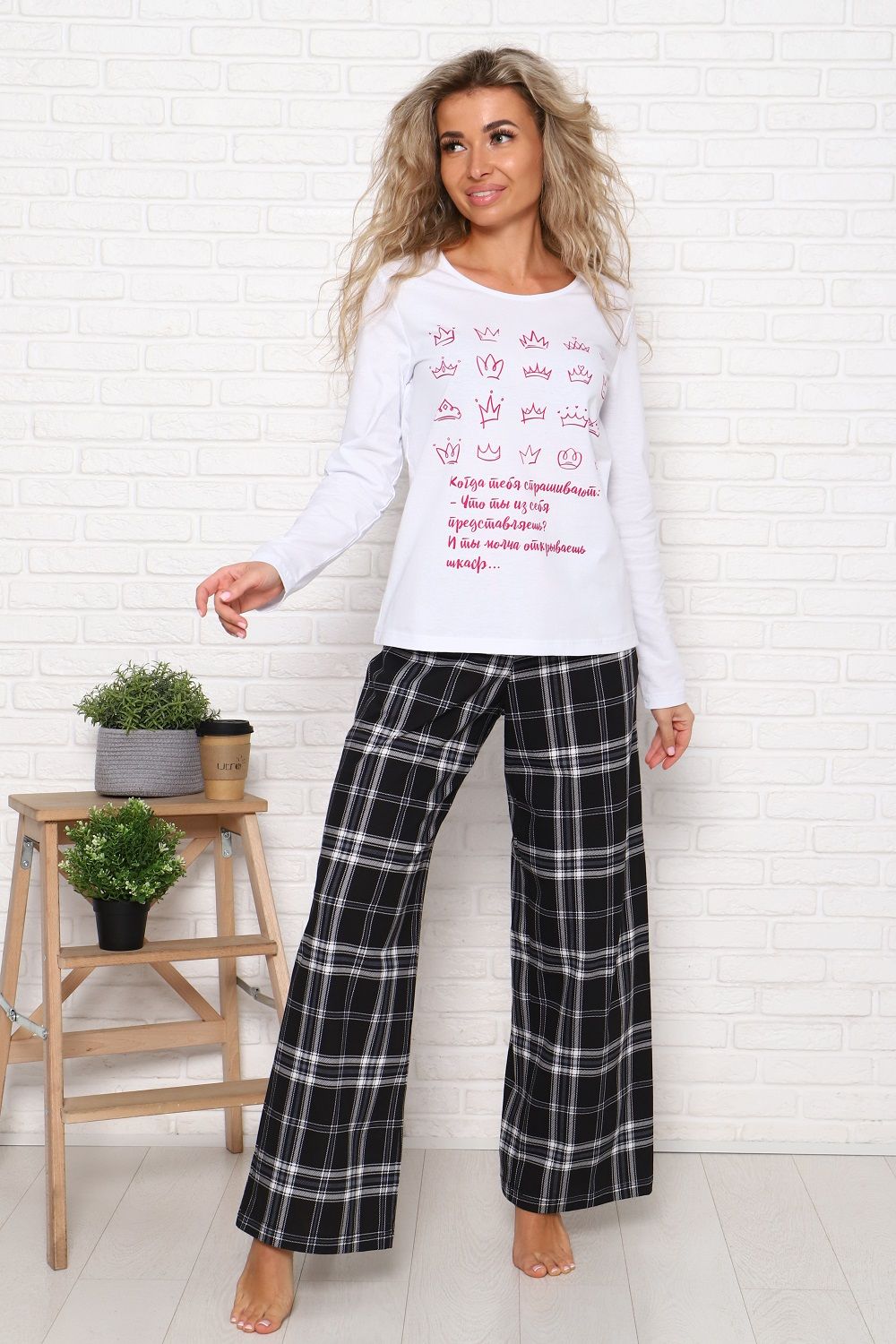 Пижама женская: брюки прямые, в клетку, с карманами по бокам, широкий комфортный пояс с акцентным шнурком; футболка с длинными рукавами и ироничной печатью на груди. Стильно, весело, удобно!