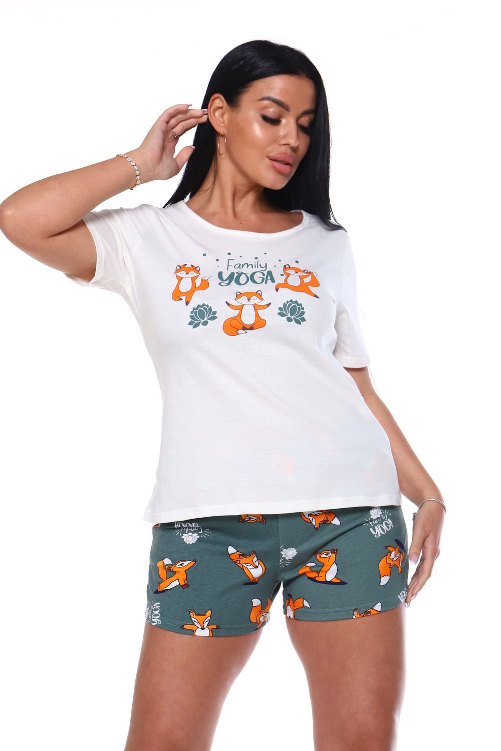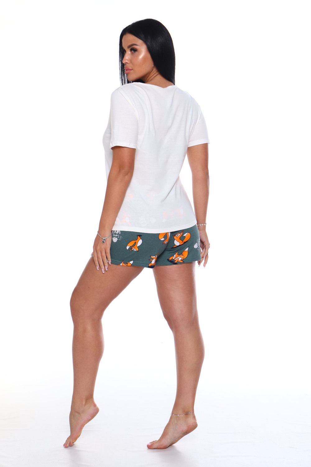 Пижама из кулирки - футболка и шорты. Футболка украшена печатью. Шорты без карманов.