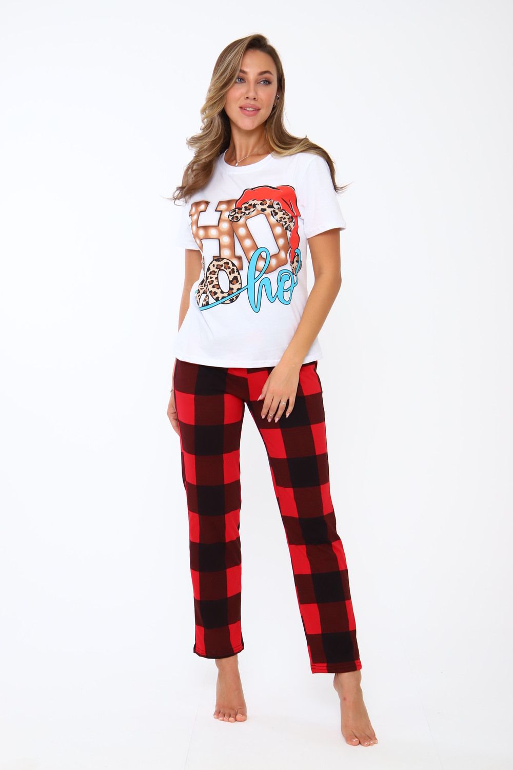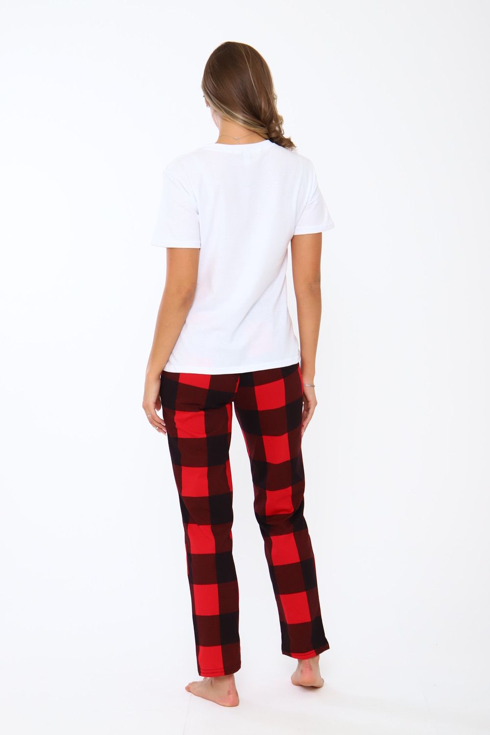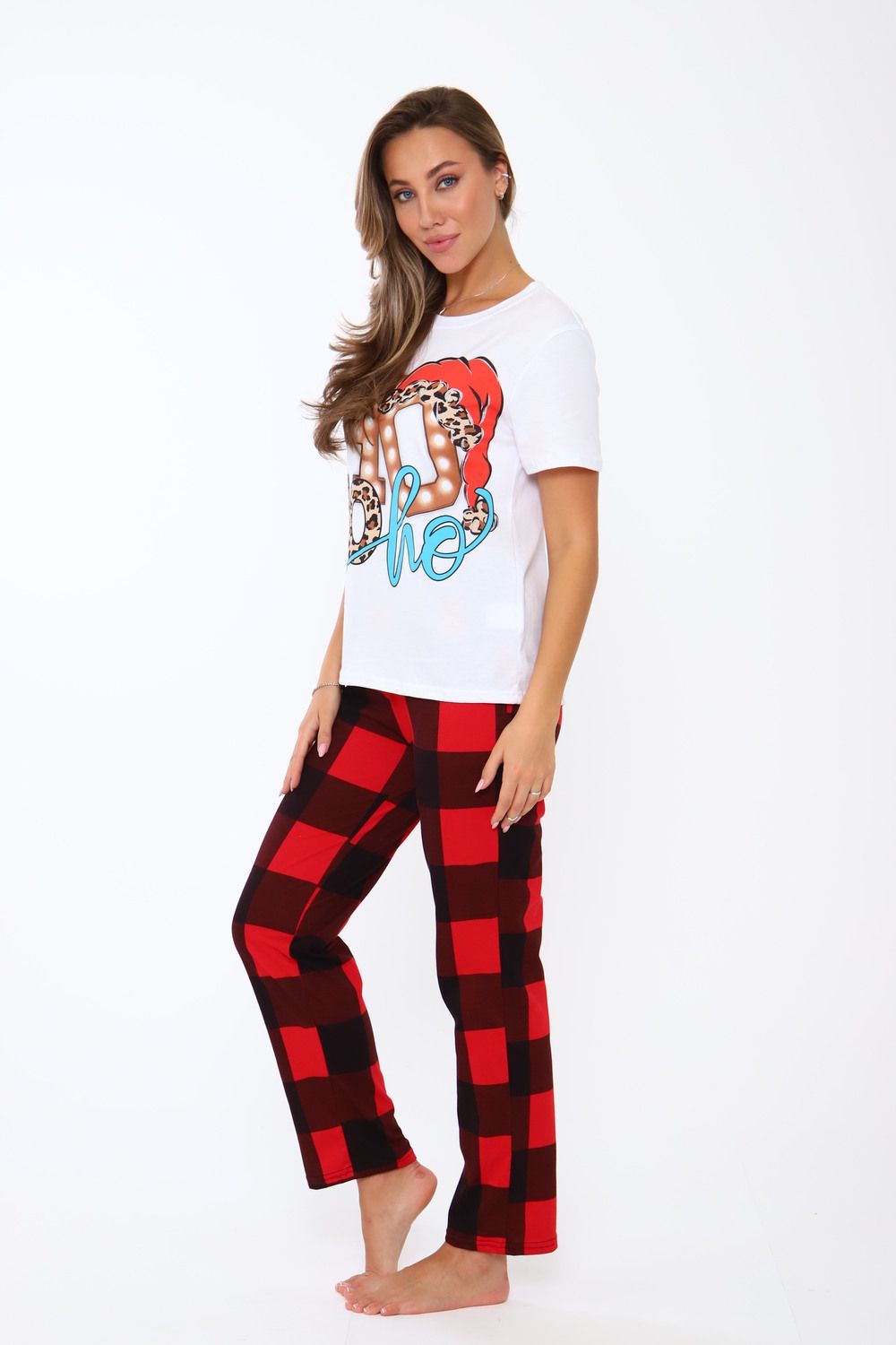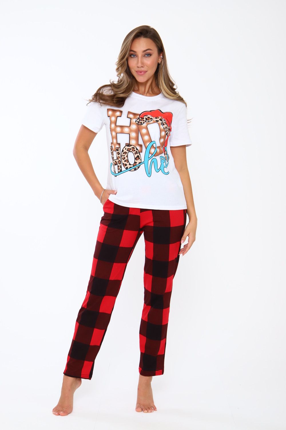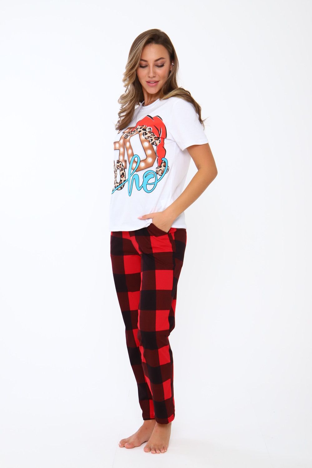 Новогодняя пижама из кулирки футболка красивым принтом, брюки набивка узор клетка красная и черная, брюки с карманами.