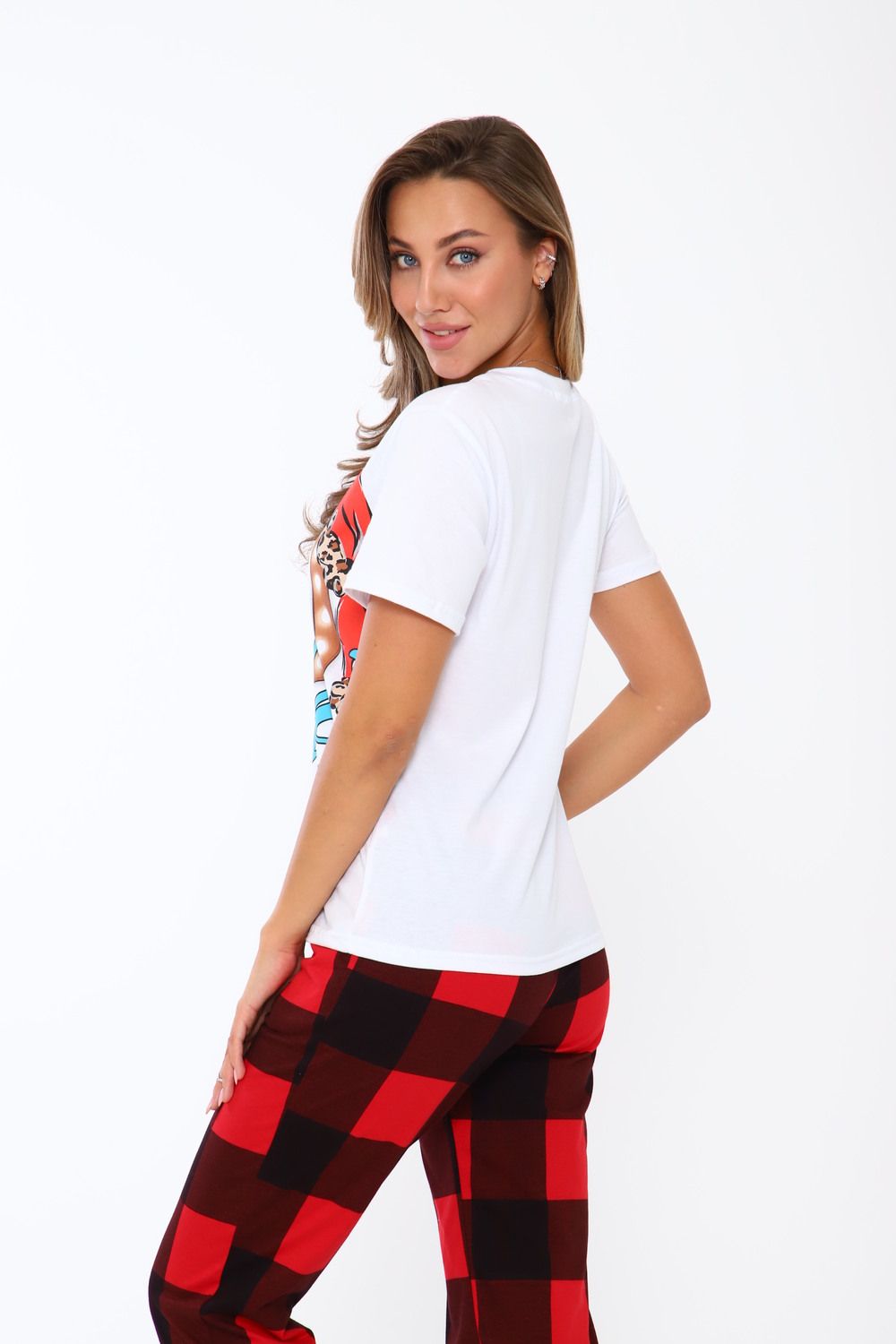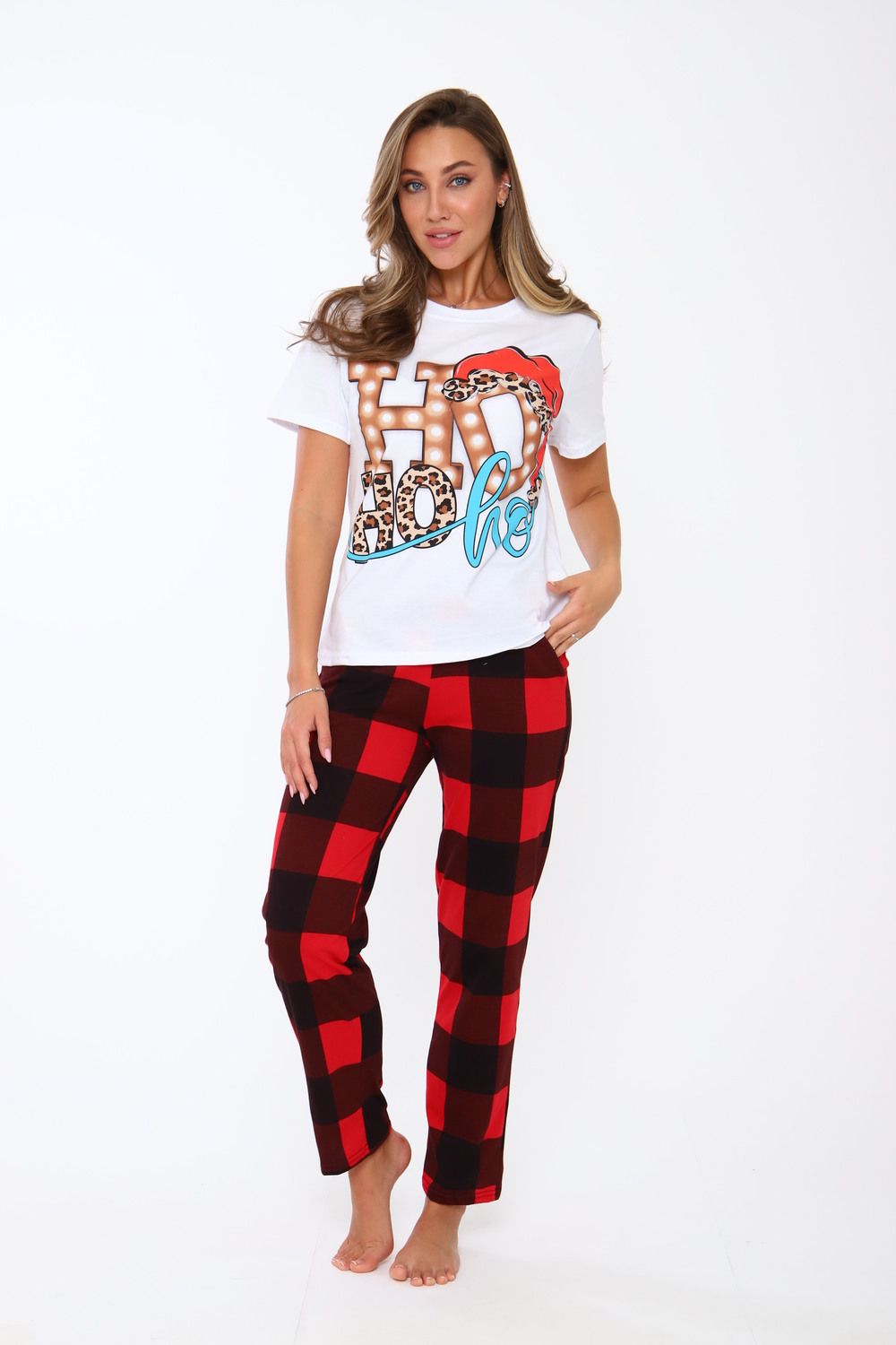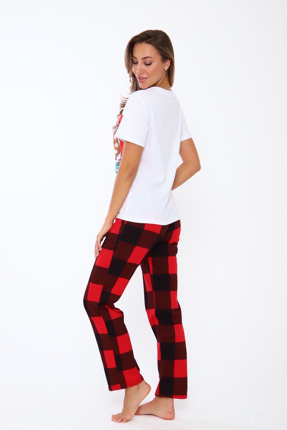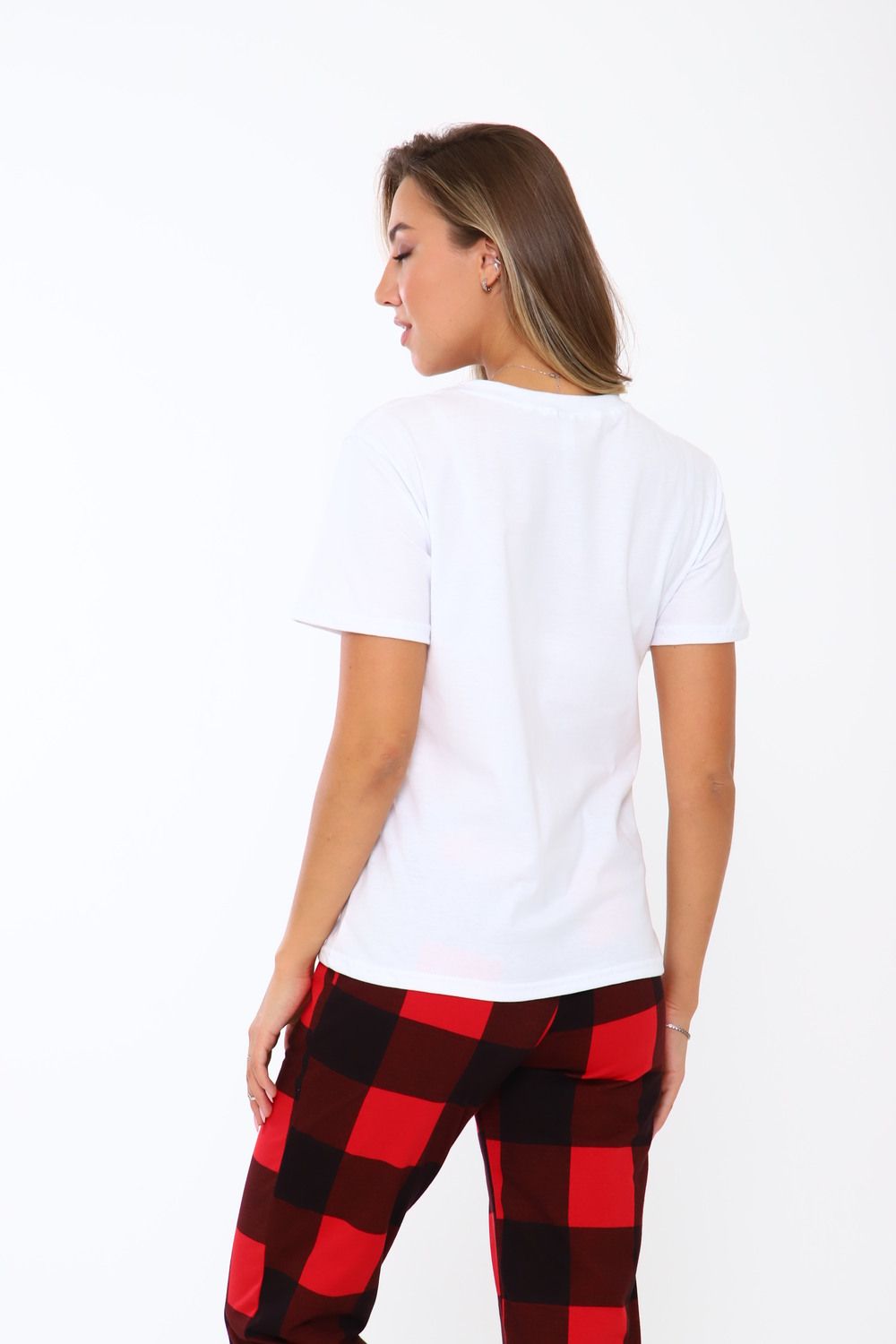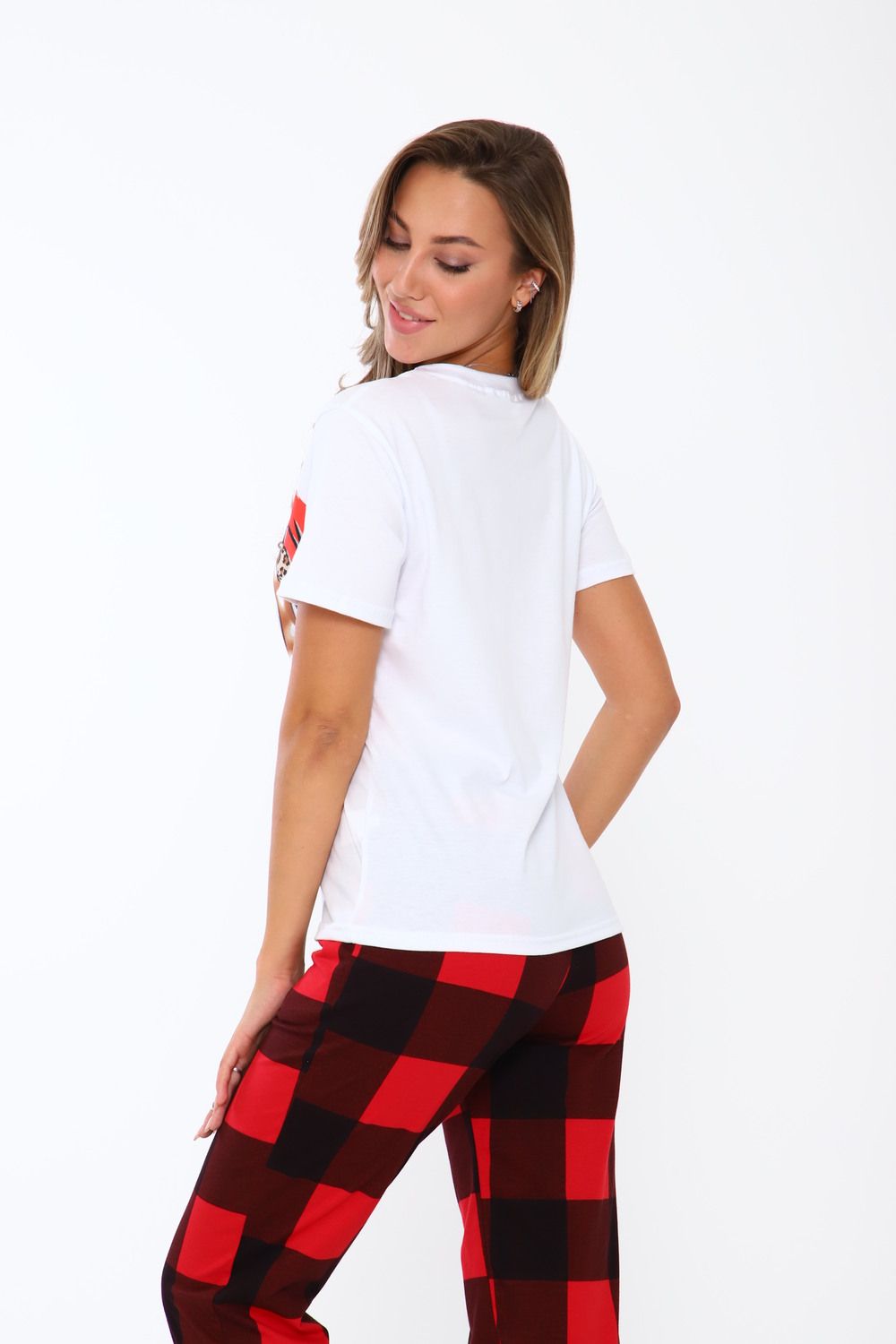 Новогодняя пижама из кулирки футболка красивым принтом, брюки набивка узор клетка красная и черная, брюки с карманами.