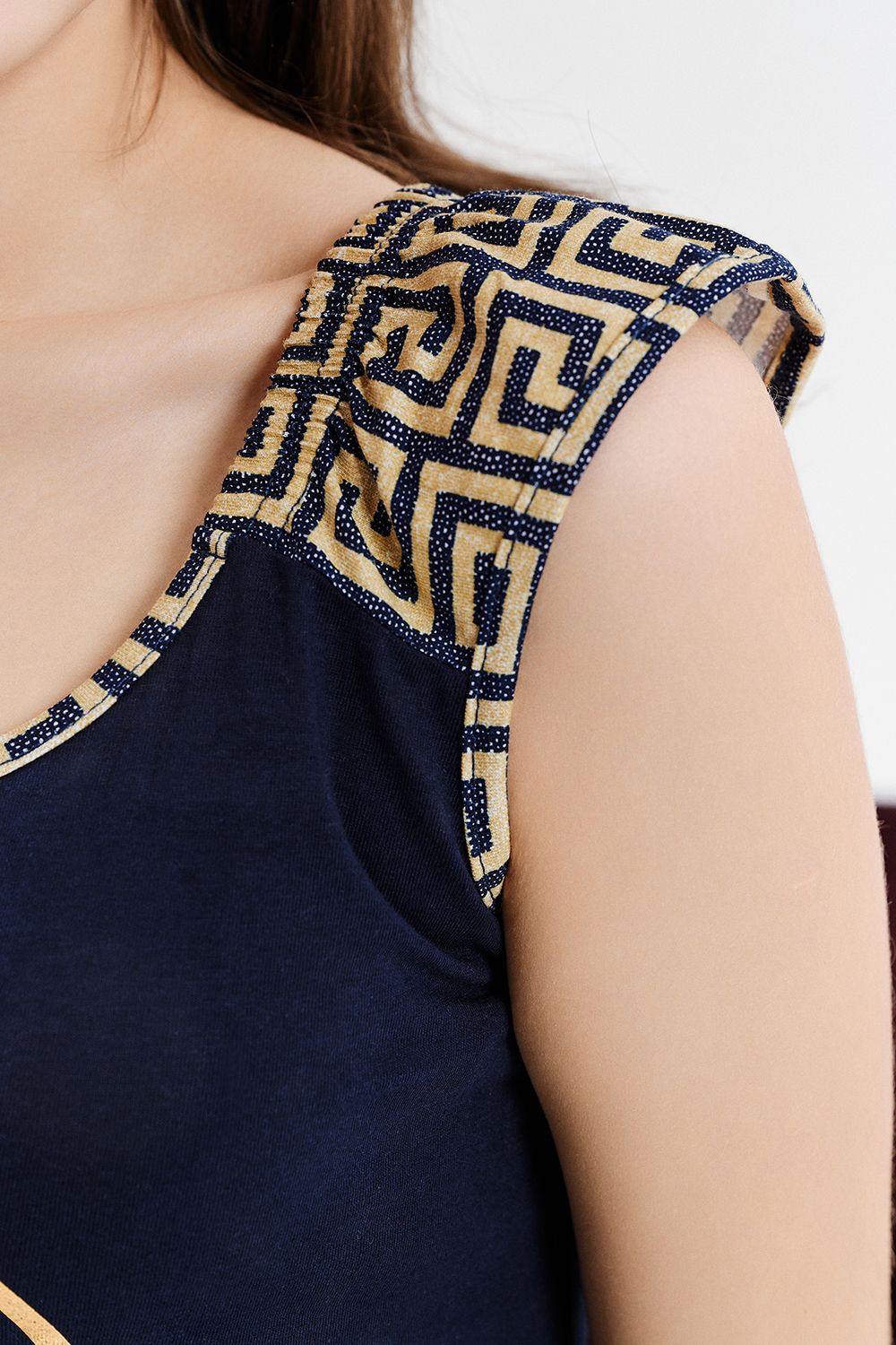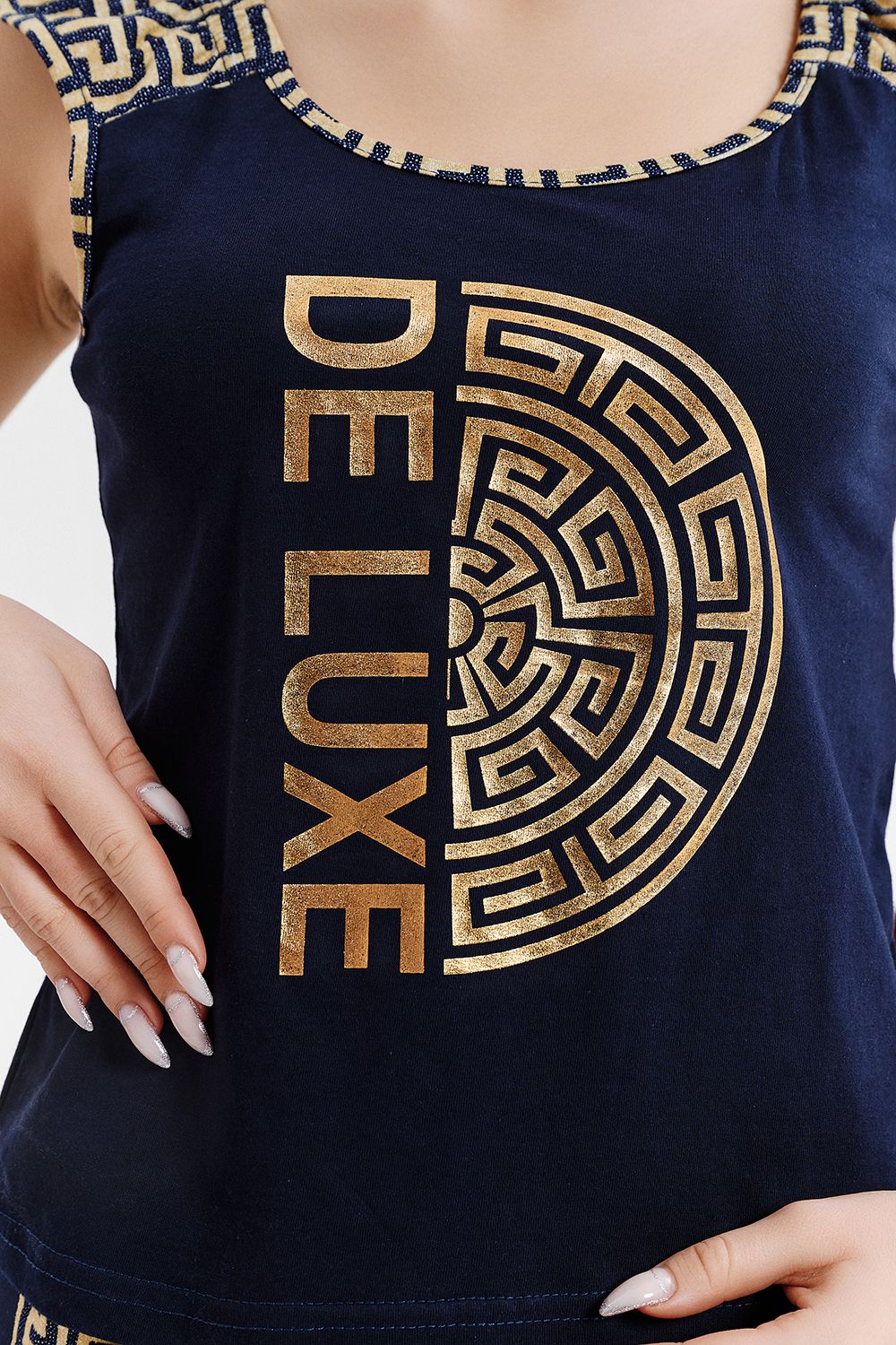 Комплект состоит из майки и шорт. Майка полуприлегающего силуэта, с округлой горловиной, на широких бретелях из отделочного полотна. Горловина, проймы обработаны бейкой из отделочного полотна. Шорты прямые, короткие, на резинке, с лампасом вдоль боковых швов.