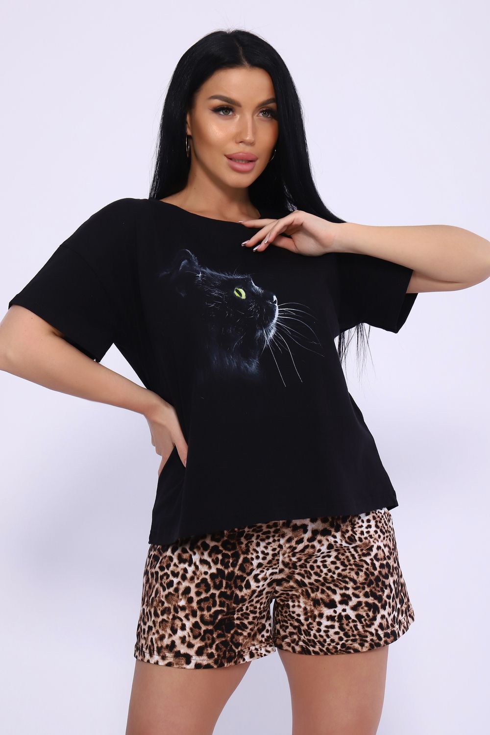 Пижама женская с шортами леопард. Данная модель выполнена из трикотажного полотна кулирка хлопок 100%. Отличная модель для дома и отдыха. Футболка свободного покроя со спущенным рукавом. На полочке футболки присутствует принт.
