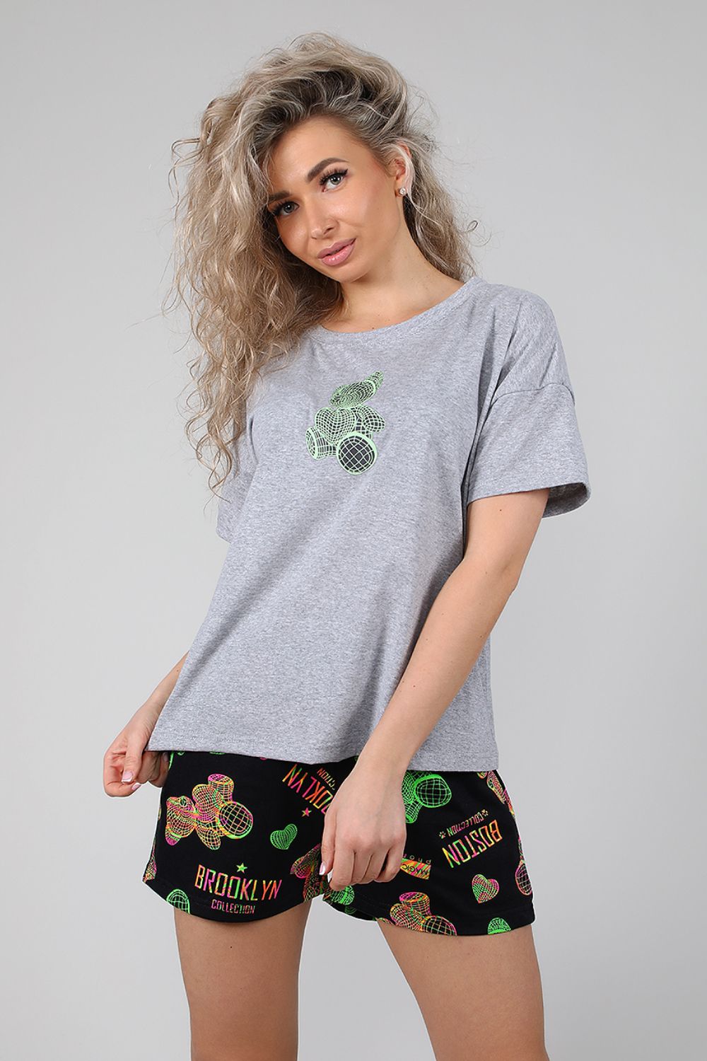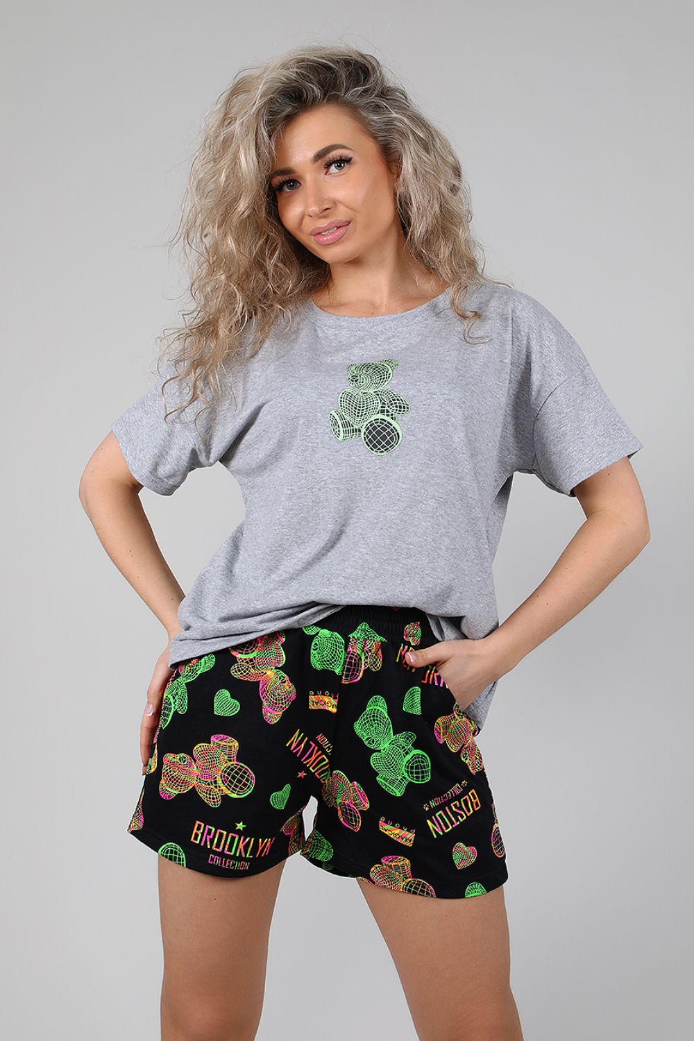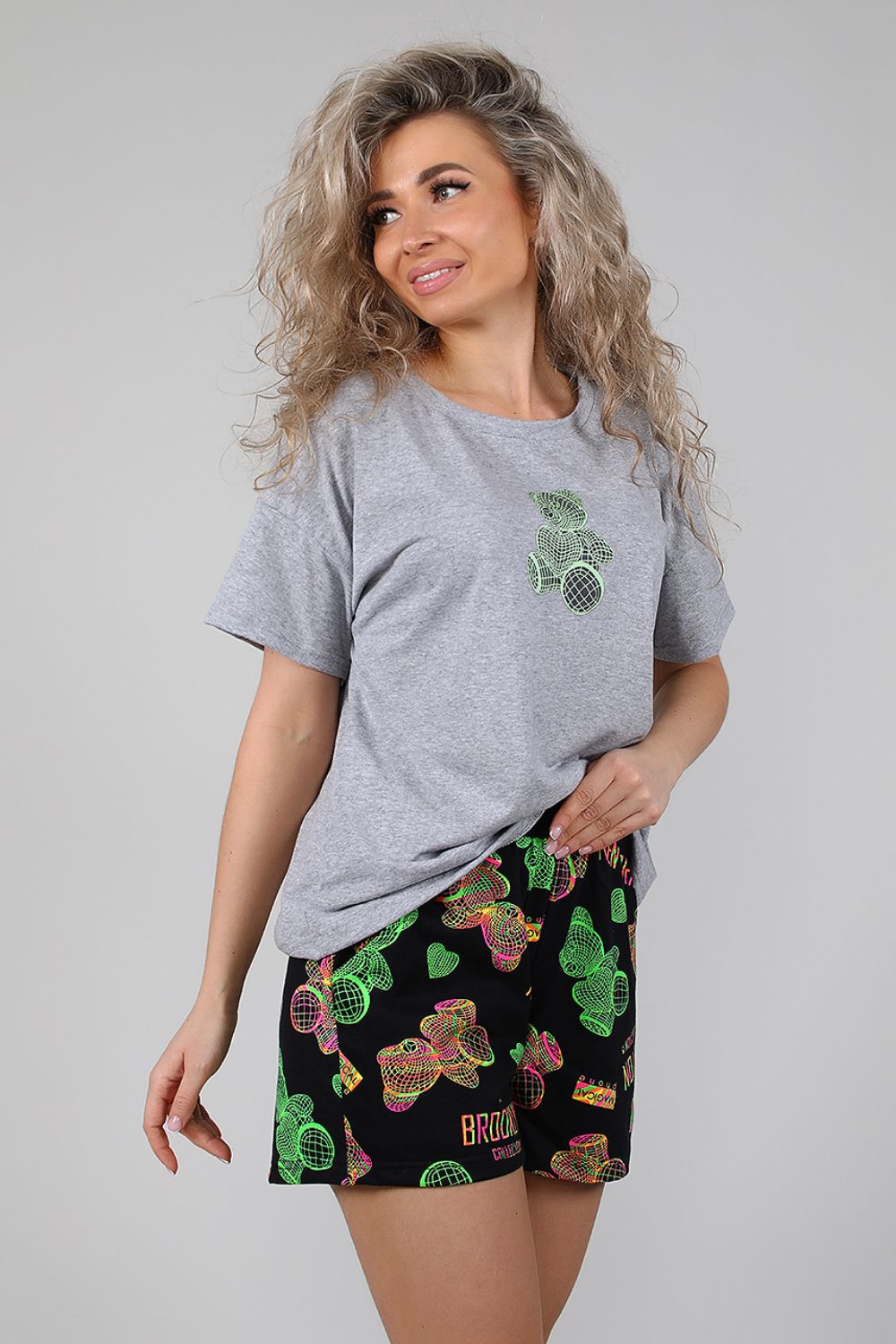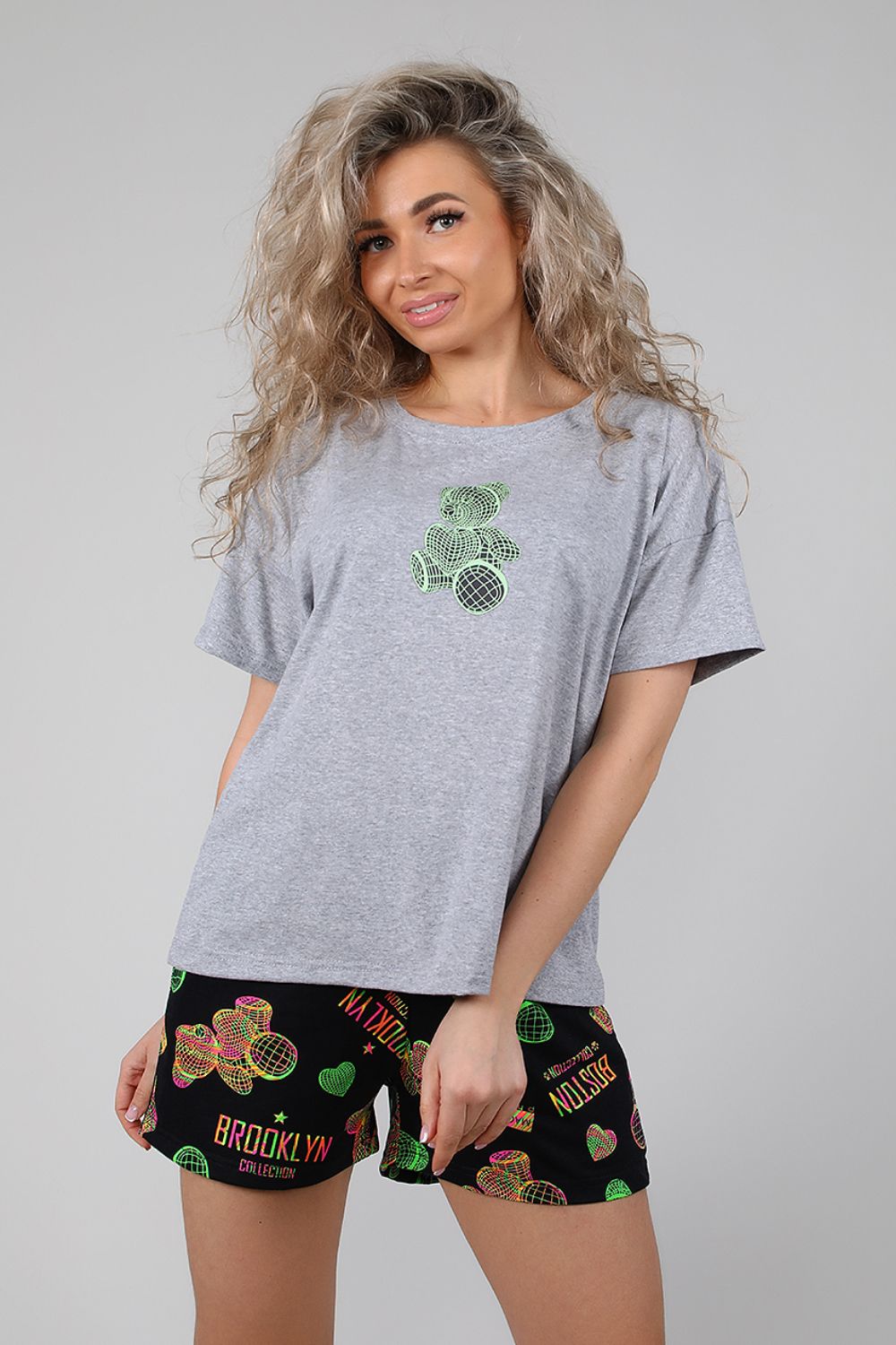 Костюм комбинированный женский с шортами. Данная модель выполнена из трикотажного полотна кулирка (хлопок 100%). Футболка в стиле оверсайз, на полочке присутствует принт, а горловина обработана потайным окантовочным швом. Отлично подходит для сна и отдыха.