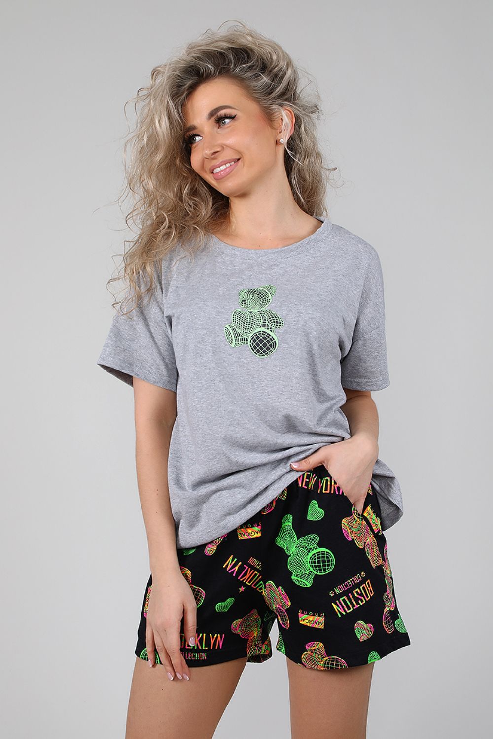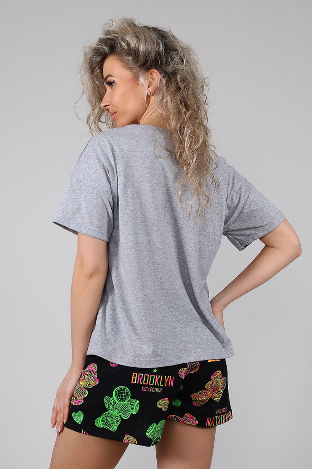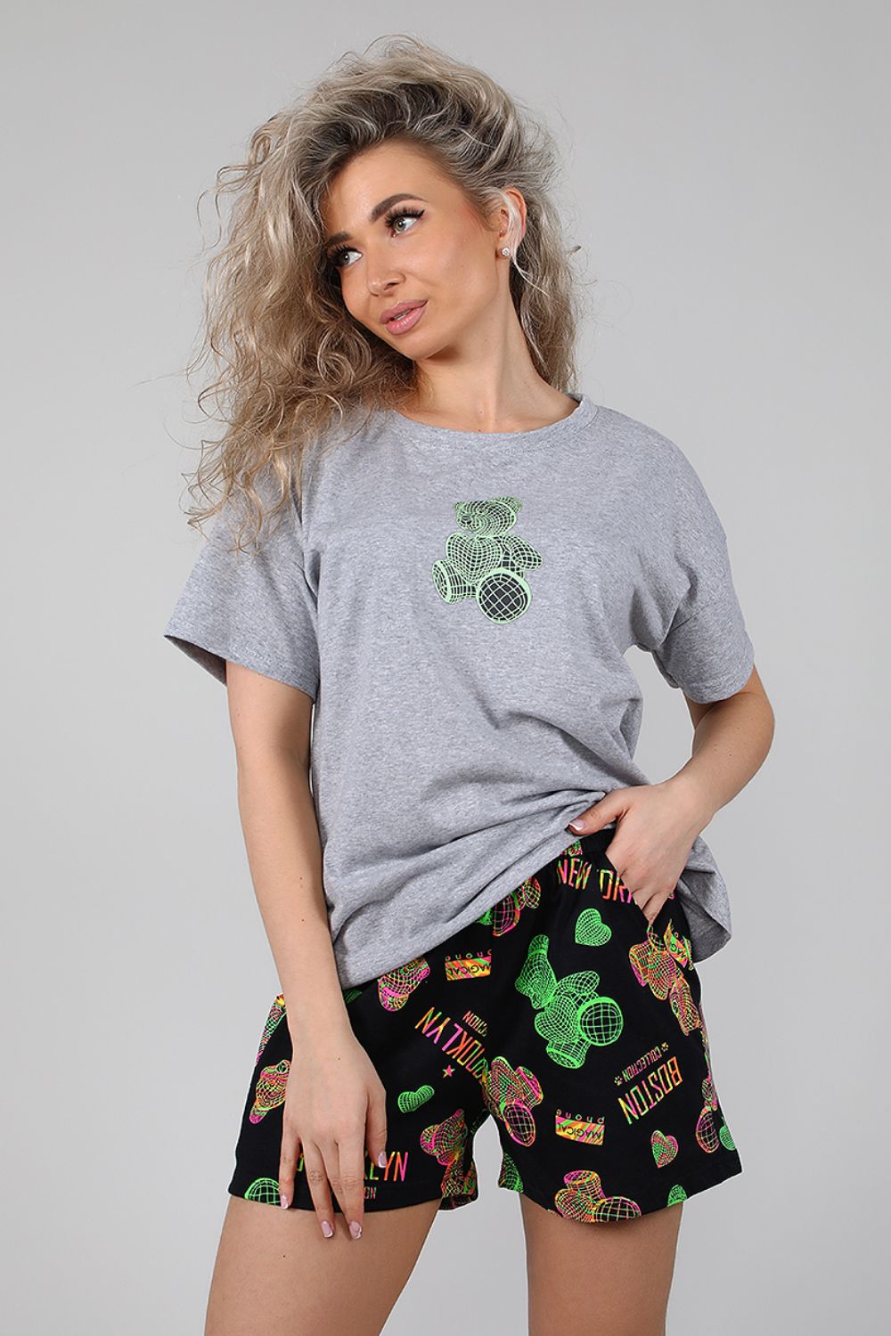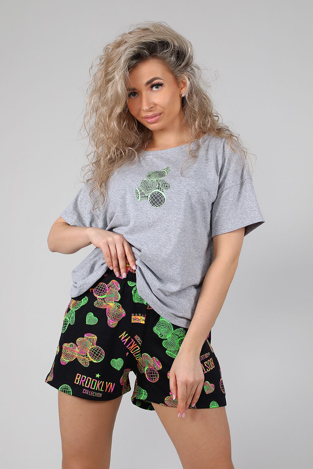Костюм комбинированный женский с шортами. Данная модель выполнена из трикотажного полотна кулирка (хлопок 100%). Футболка в стиле оверсайз, на полочке присутствует принт, а горловина обработана потайным окантовочным швом. Отлично подходит для сна и отдыха.