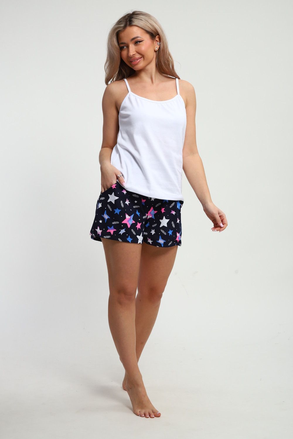Пижама женская с шортами и топом. Шорты с карманами и поясом. Данная модель выполнена из трикотажного полотна рибана. Топ на брителях .