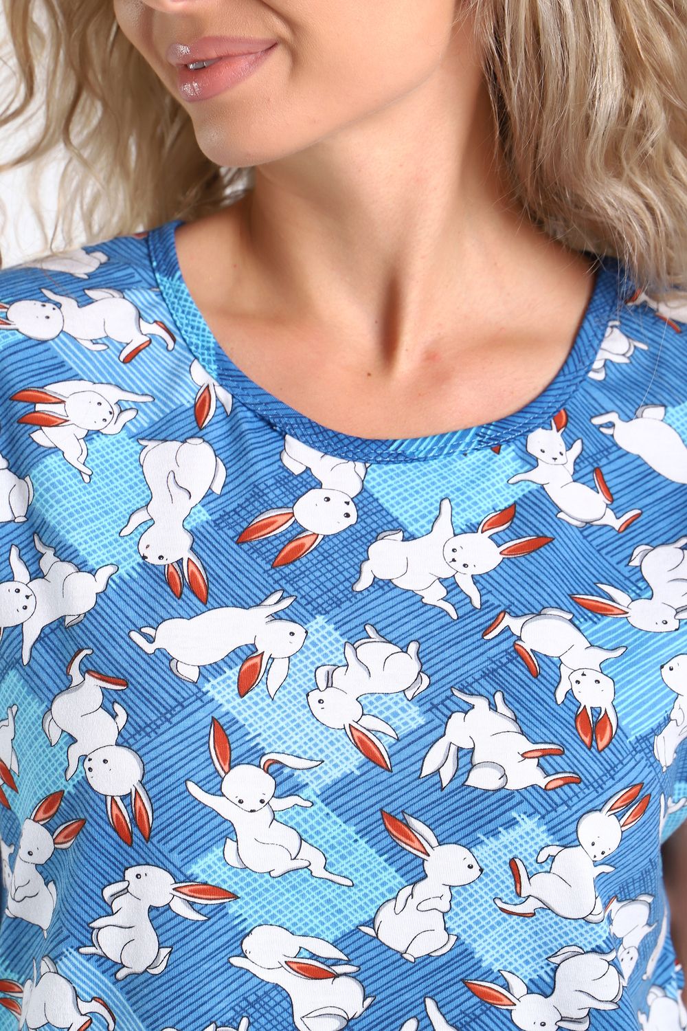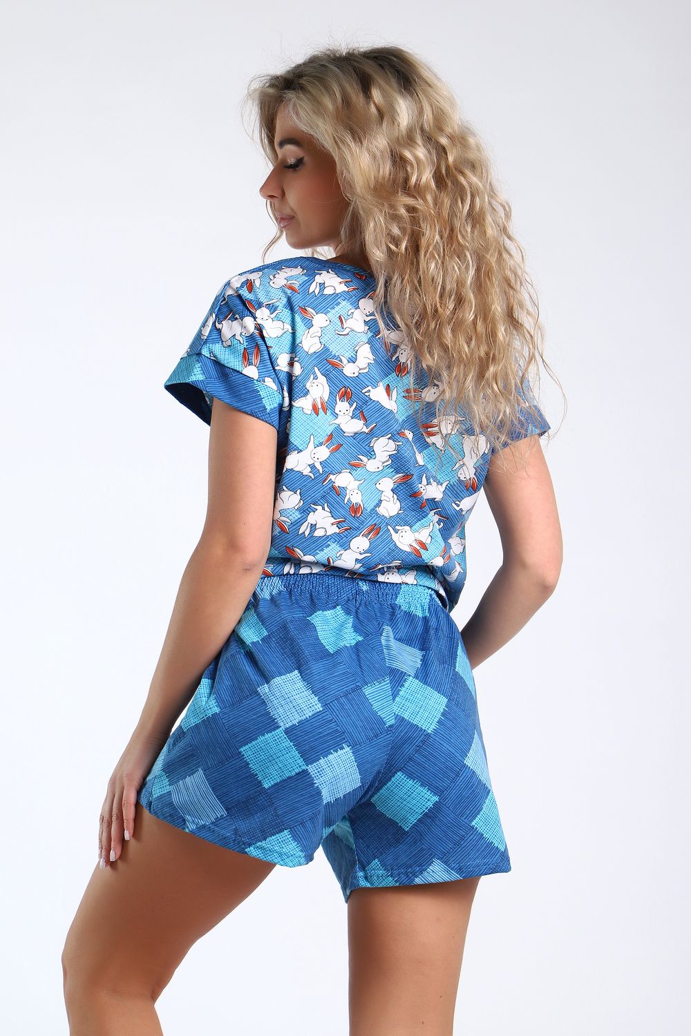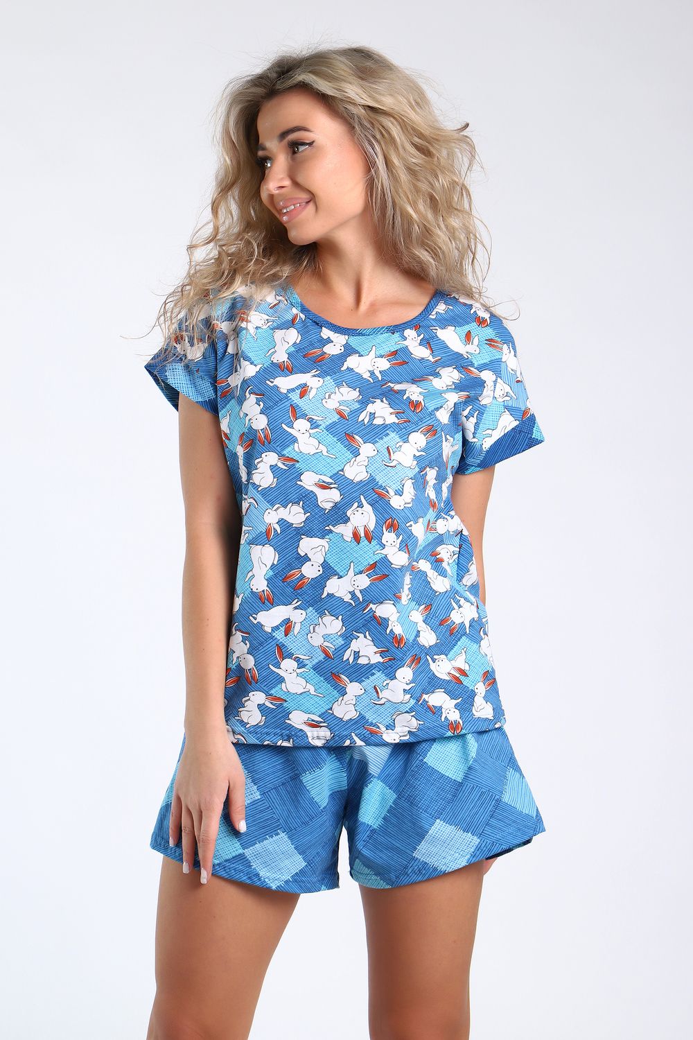 Пижама состоит из футболки и шорт. Футболка с круглым вырезом горловины и манжетами на спущенном плече.