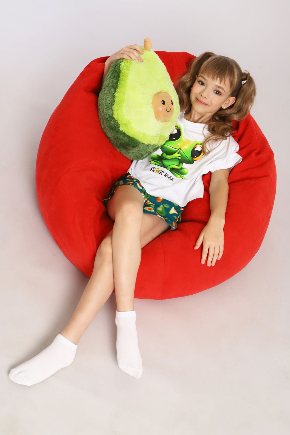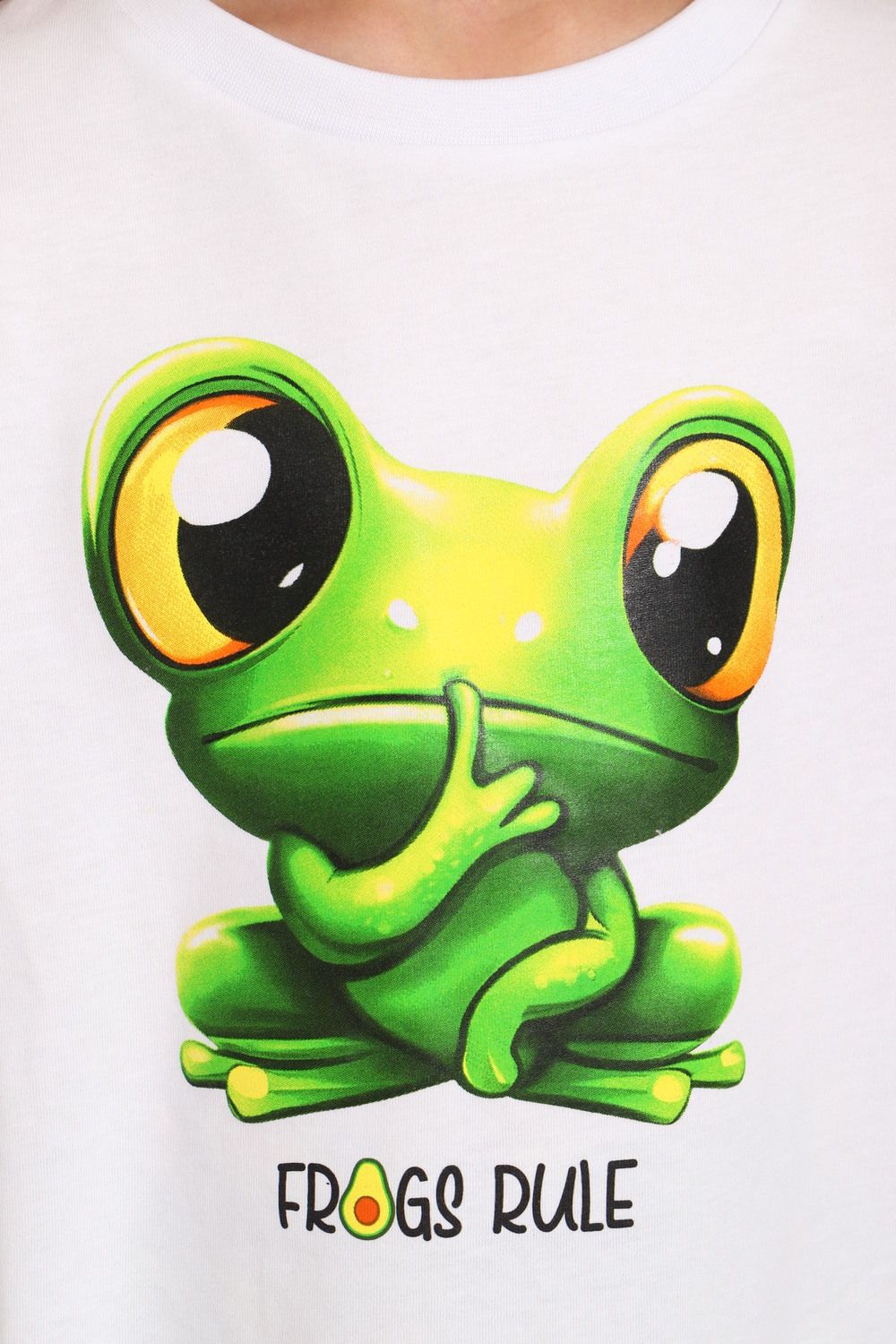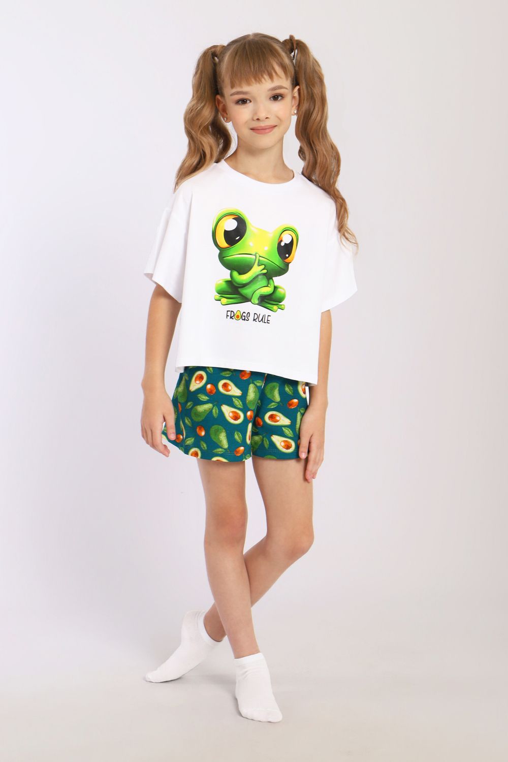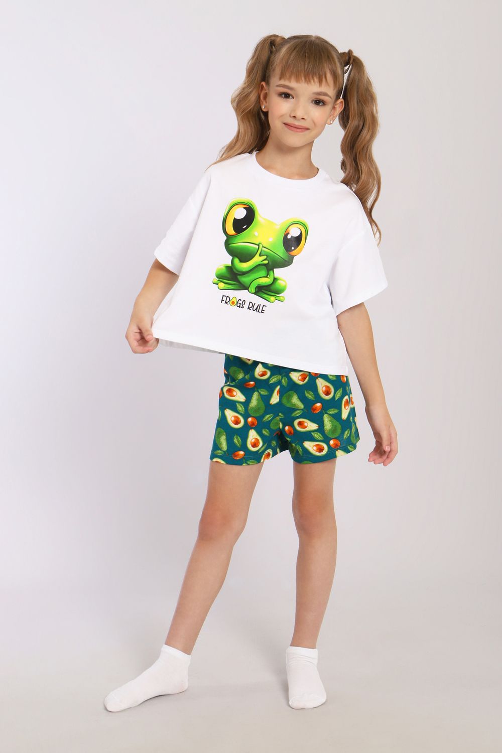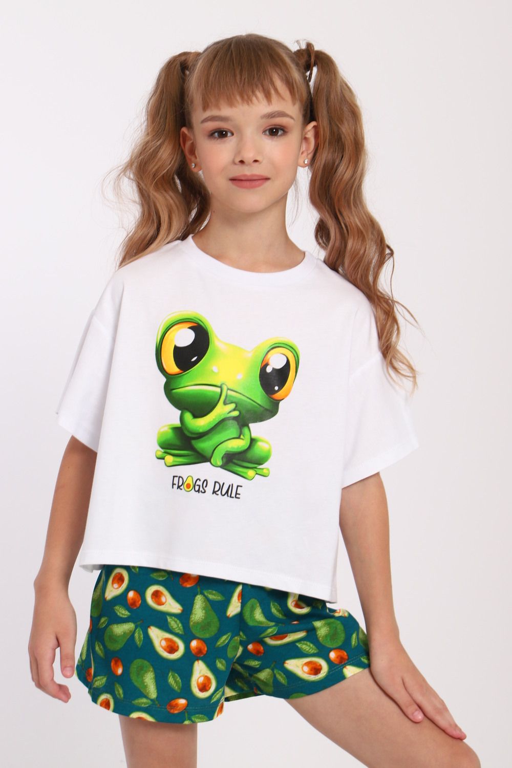 Комфортная пижама для девочки с ярким модным принтом "Лягушка". Пижама детская состоит из футболки и шорт. Дизайн ткани позволяет использовать пижаму не только для сна, но и как костюм для дома. Материал очень мягкий и в то же время износостойкий, не скатывается и не вытягивается. Модель пижамы не сковывает движения ребенка во время сна. Покрой футболки оверсайз, укороченная, шорты классические без карманов. Пижама выполнена из 100% гипоаллергенного хлопка, что позволяет коже ребенка дышать во время сна.