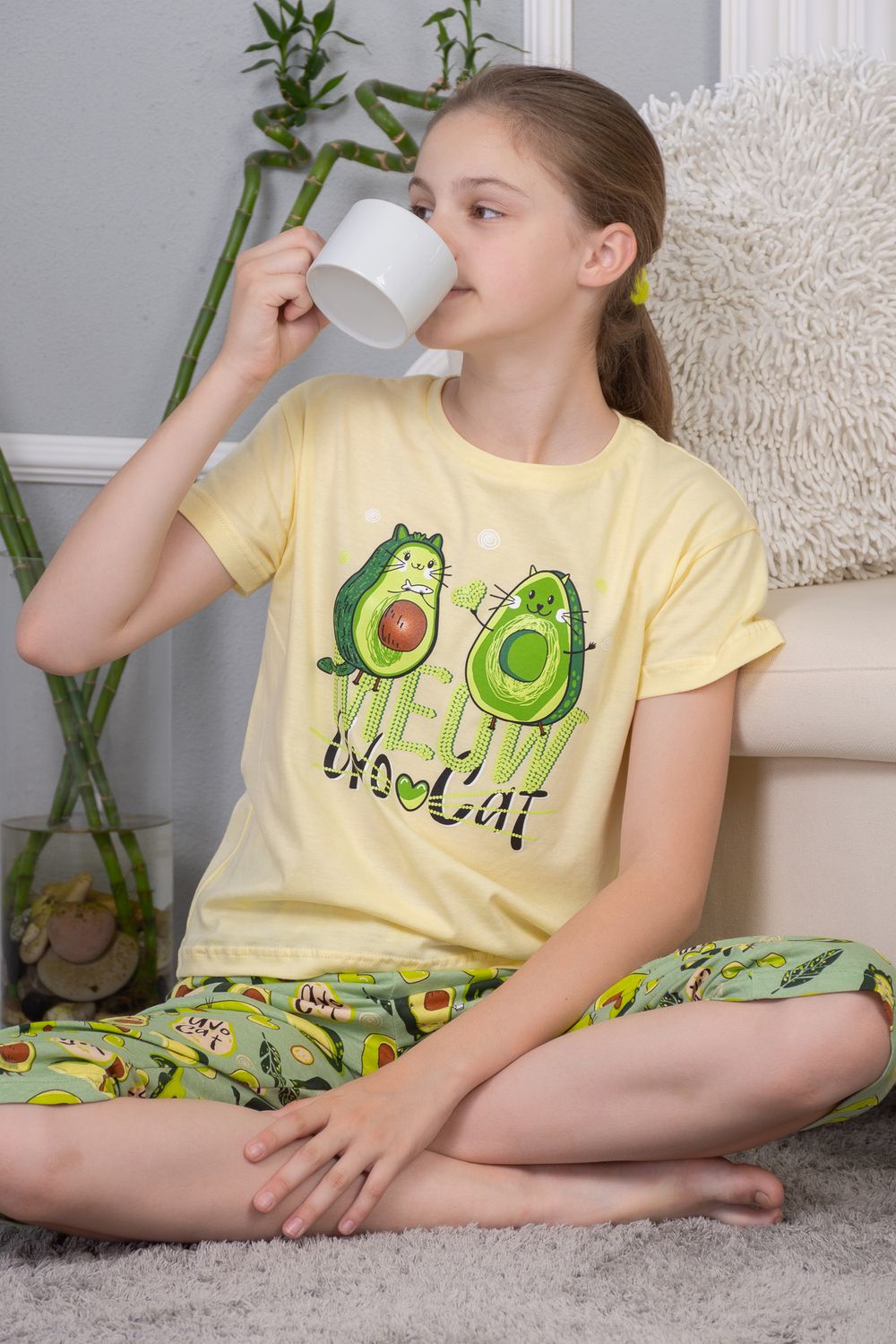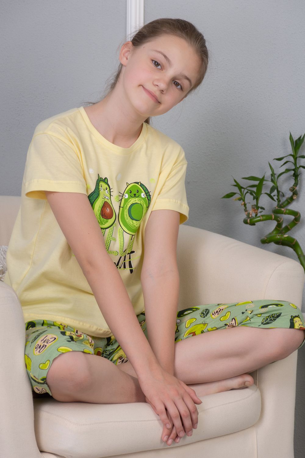 Уютная пижамка с оригинальным принтом "Авокэт". Свободная футболка со спущенной линией плеча, бриджи свободного кроя. Можно использовать как домашний костюм. Рекомендуется деликатная стирка.