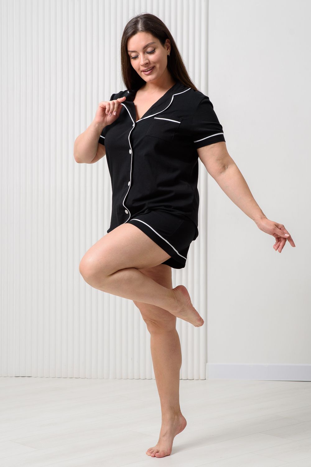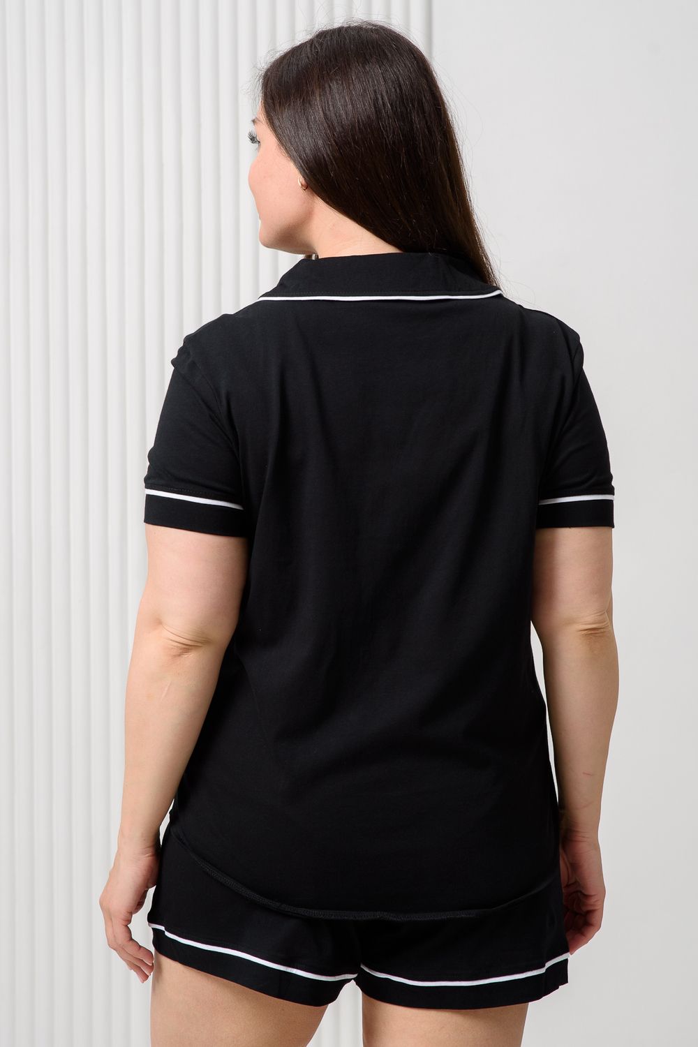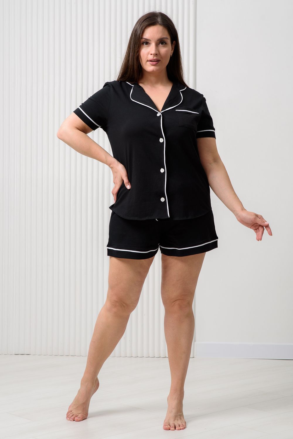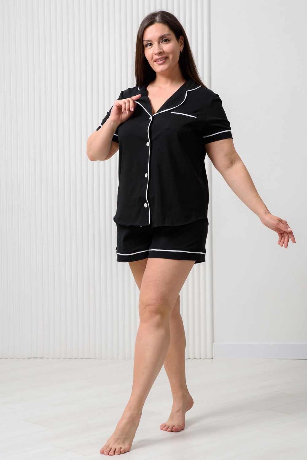 Женская пижама с шортами выполнена из мягкого и нежного хлопкового трикотажа кулирная гладь. Черная пижамка идеальна на каждый день. Натуральный 100% хлопок не электризуется и хорошо пропускает воздух. Рубашка с коротким рукавом имеет застежку на пуговицы. Рубашка прямого кроя не стесняет движения, а свободные шорты сделают ваш сон и домашний досуг максимально комфортными. В пижамке для женщин вы будете чувствовать себя очень свободно и уютно дома, на даче или на отдыхе.