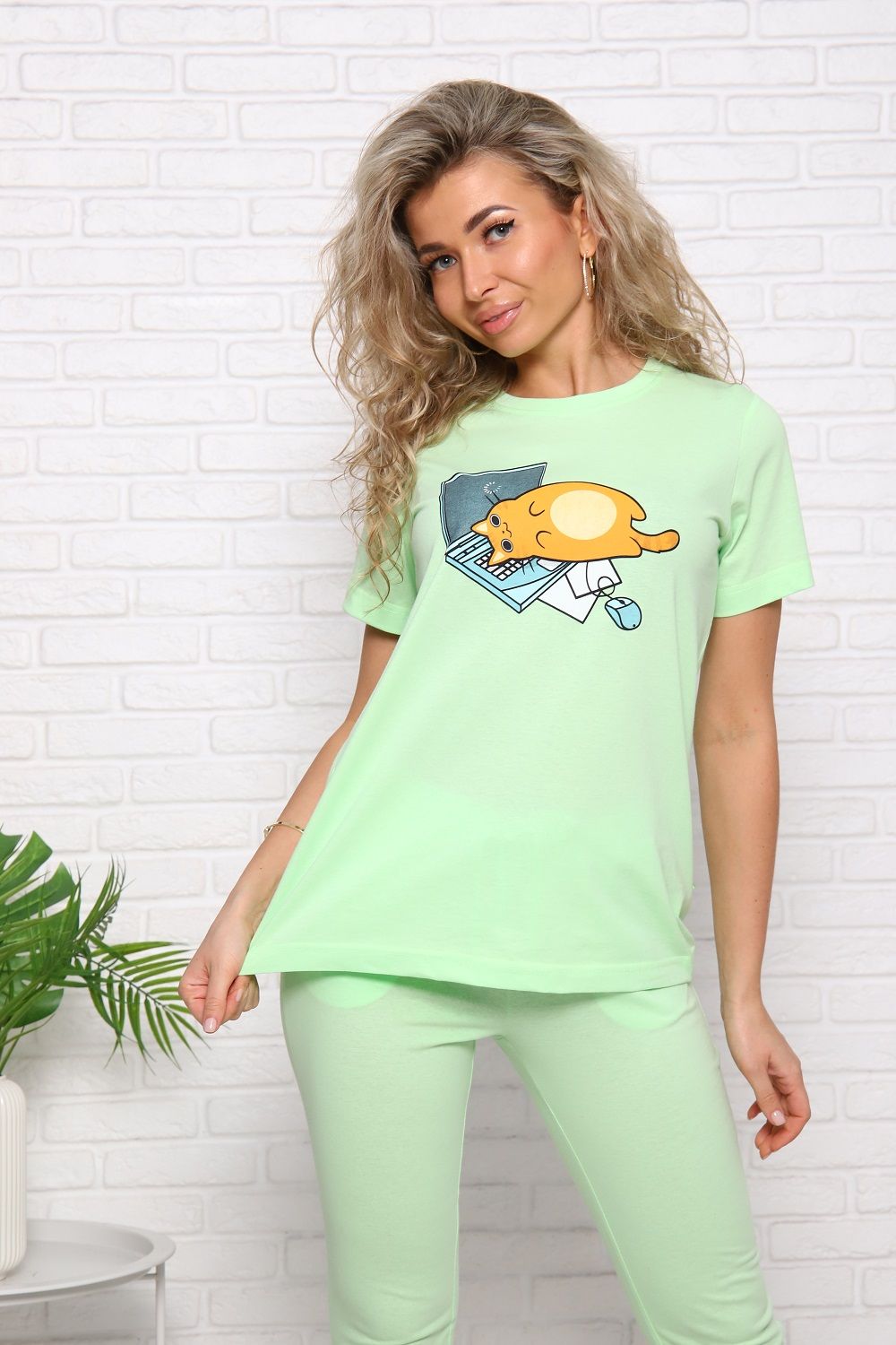 Пижама женская, футболка базовая с очаровательным принтом на груди ,брюки с боковыми карманами и манжетами.