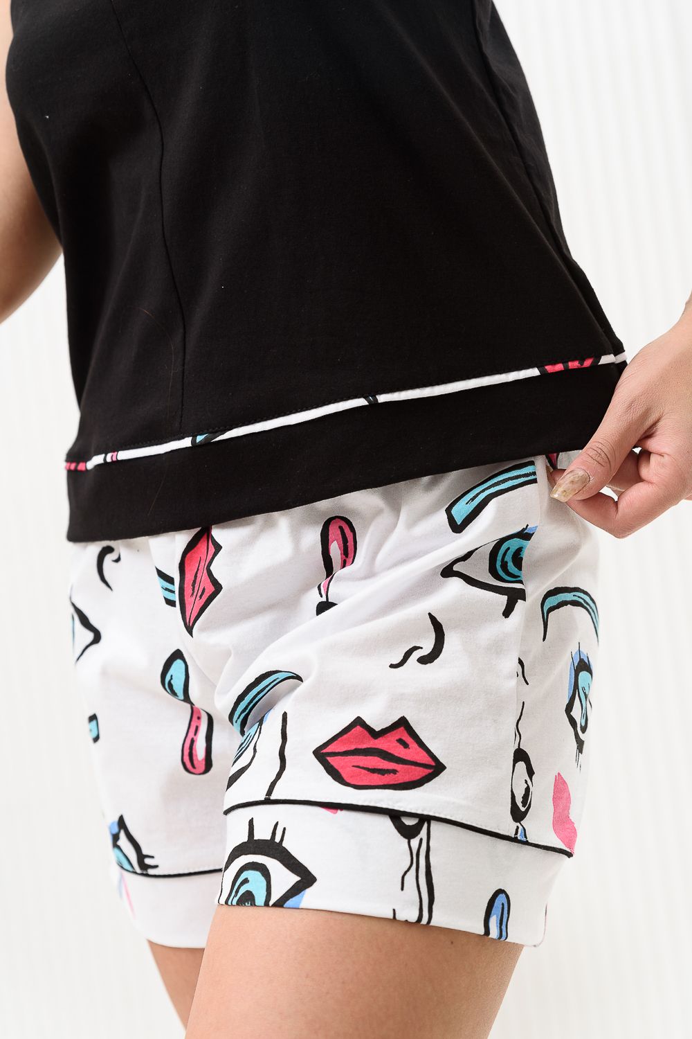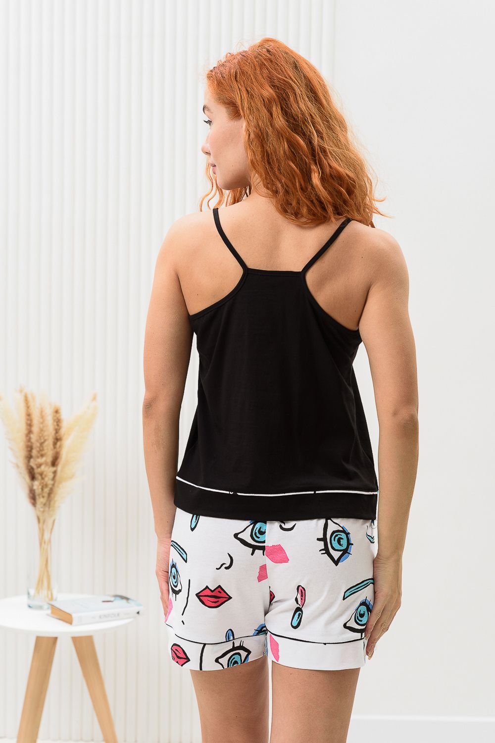 Комплект состоит из майки и шорт. Майка на тонких бретелях, с V-образной горловиной на полочке, с отделочным кантом по горловине и низу. Горловина и бретели обработаны бейкой из основного полотна. Шорты прямые, короткие, с манжетом и отделочным кантом, на резинке.