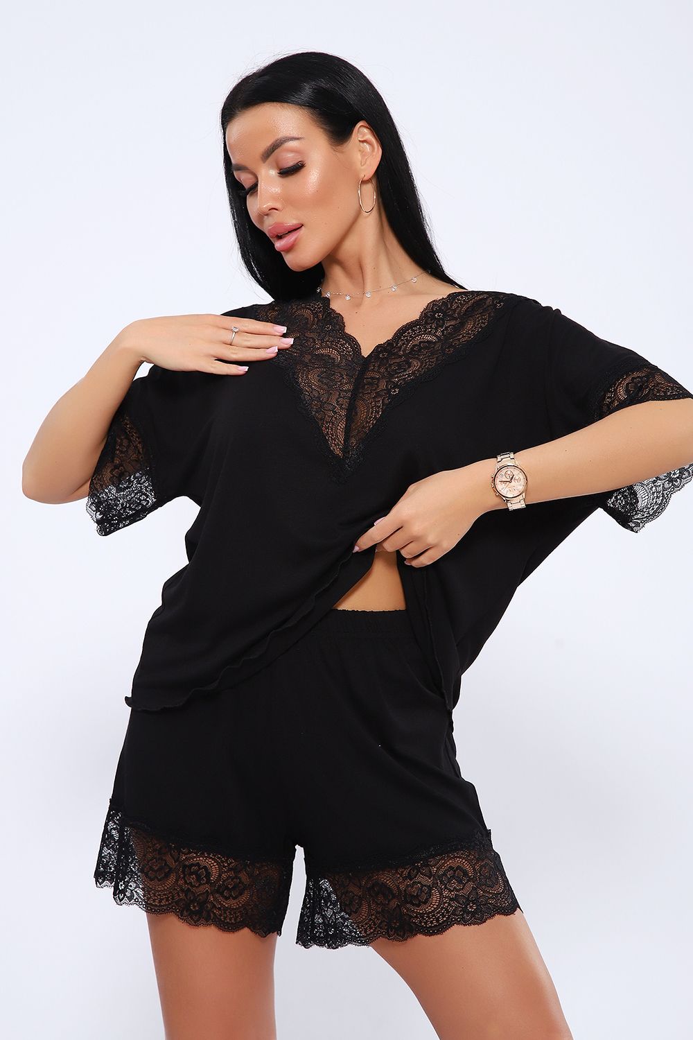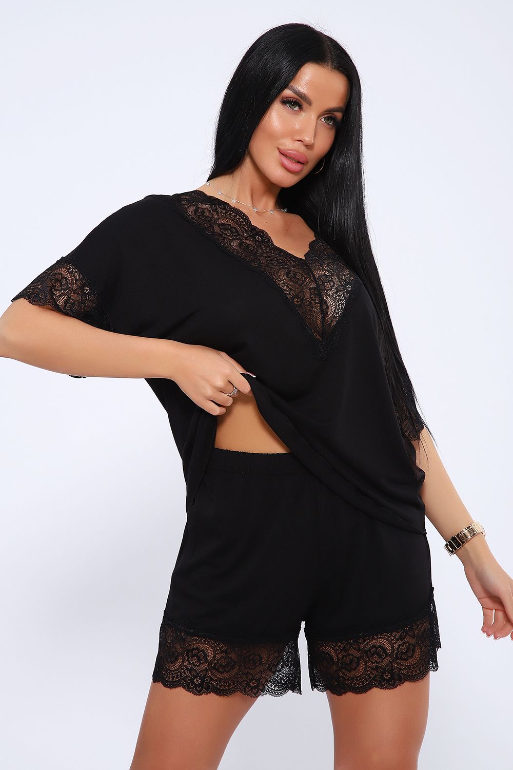 Комплект включает в себя черную футболку с изящным кружевом и шорты на резинке, которые обеспечивают свободу движений и комфорт. Этот нарядный набор может стать отличным подарком для близких или даже для себя, подчеркивая вашу индивидуальность и стиль. Для беременных и кормящих женщин пижама станет незаменимой вещью благодаря удобному крою и мягкой вискозе, которая нежно обнимает тело.