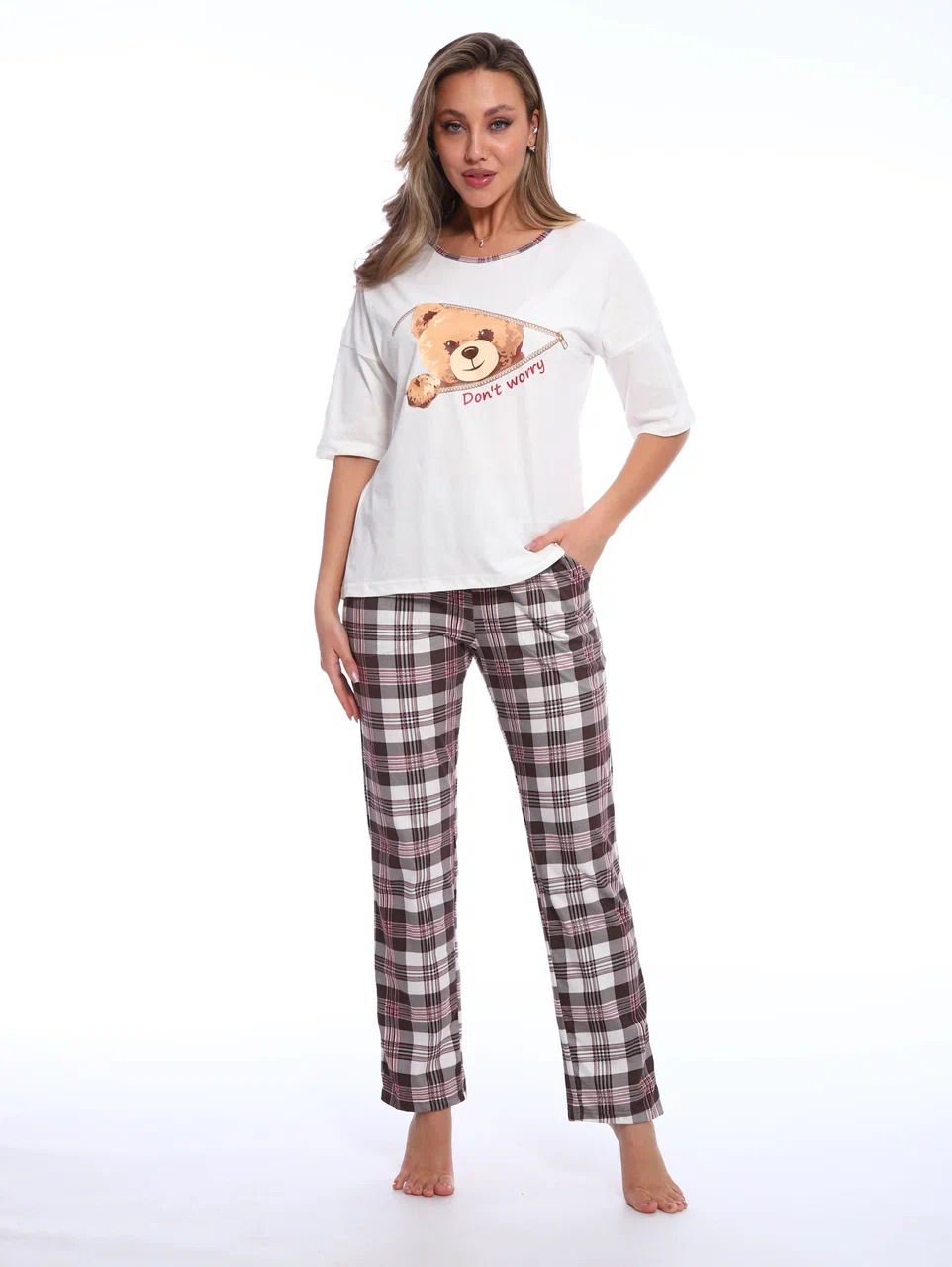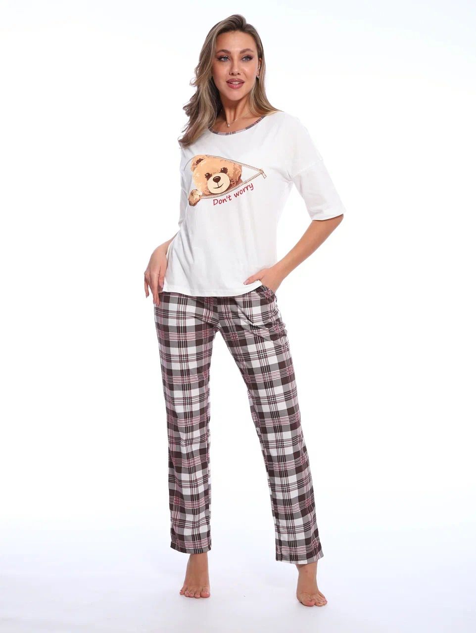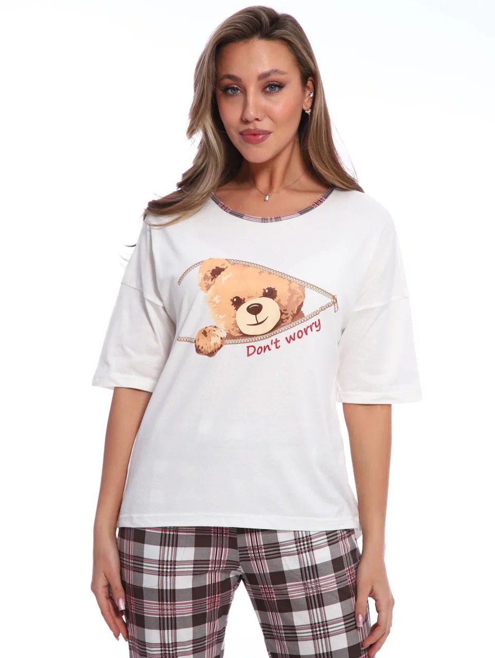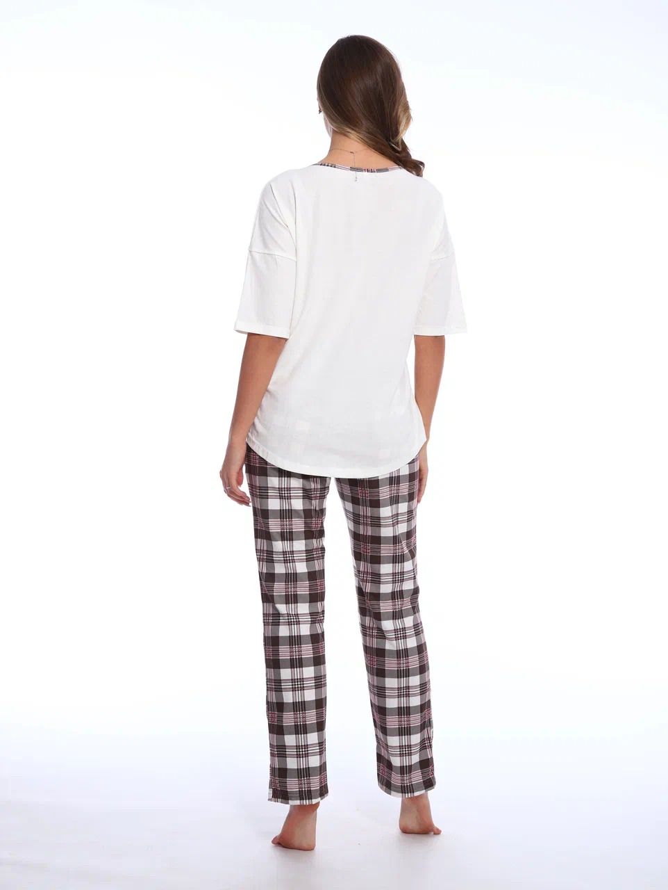 • Стильный дизайн: Современное сочетание кремовой футболки с рисунком и клетчатых брюк подходит для женщин, ценящих комфорт и моду.
