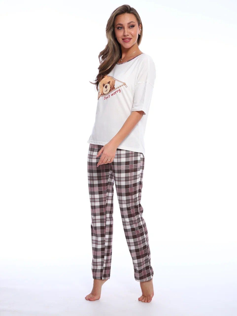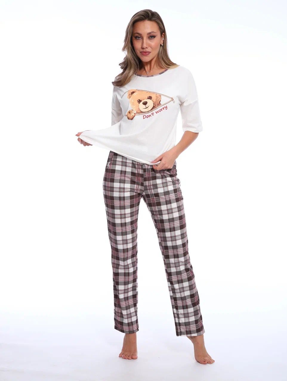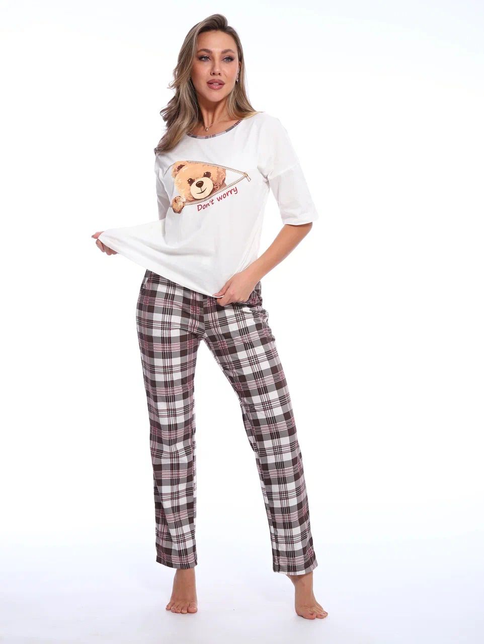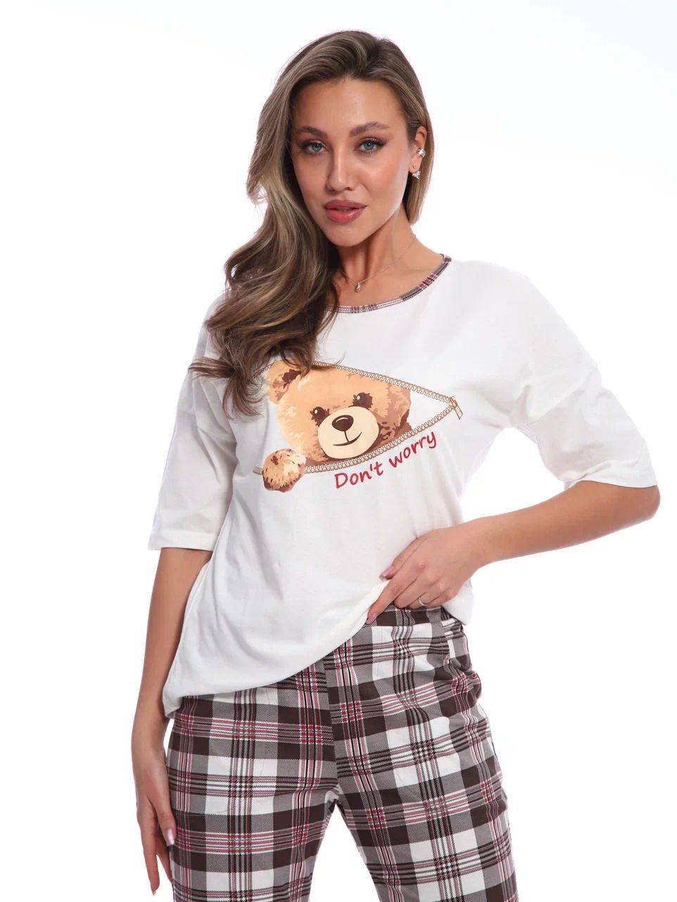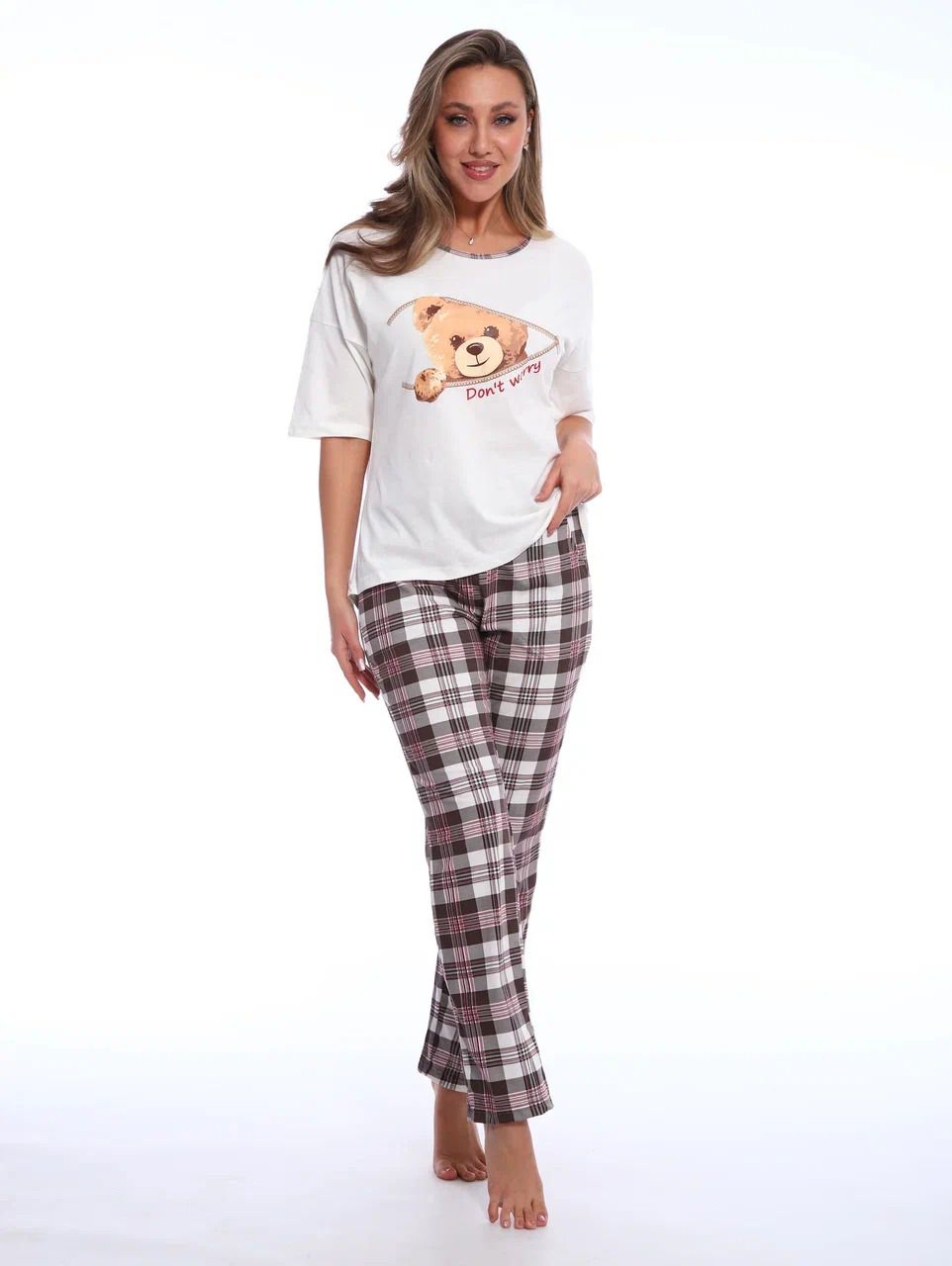 • Стильный дизайн: Современное сочетание кремовой футболки с рисунком и клетчатых брюк подходит для женщин, ценящих комфорт и моду.