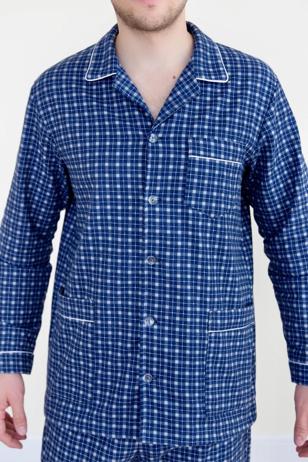 Мужская фланелевая пижама из 100% хлопка, приятна к телу и не сковывает движения. В комплекте рубашка на пуговицах и с удобными карманами на груди и по бокам, так же прямые свободные брюки на поясной резинке. Отличный комплект, который подойдёт каждому мужчине.
