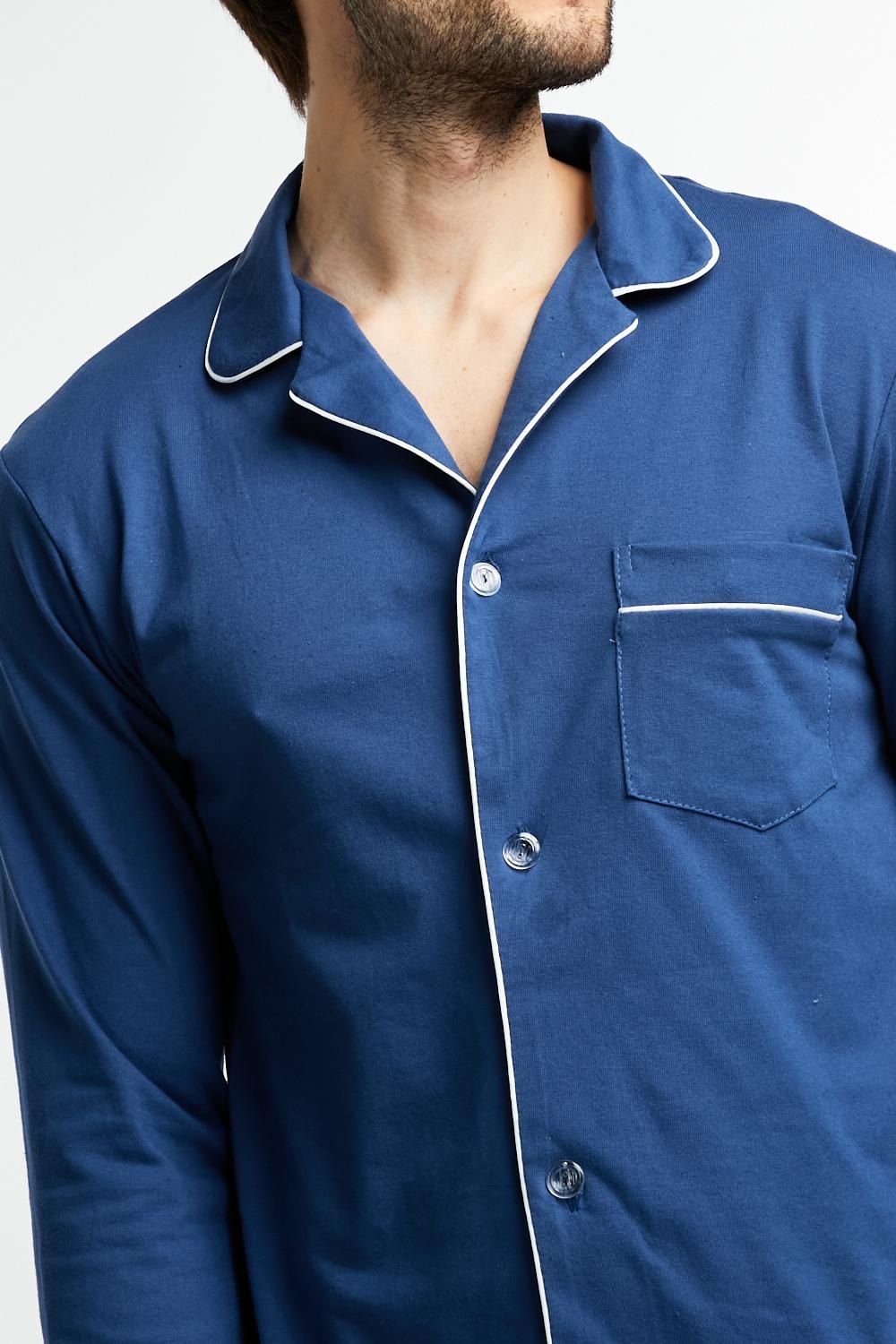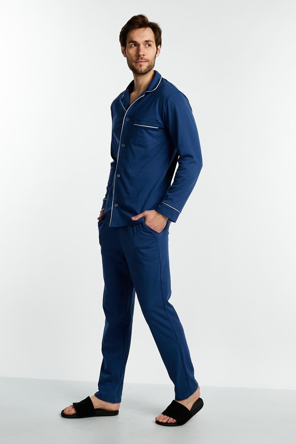 Пижама с брюками незаменимая вещь в зимнем гардеробе любого мужчины. Однотонная пижама с отложным воротничком, застежкой на пуговицы, стильной окантовкой - одна из самых трендовых позиций. Пижамный костюм оверсайз станет отличным подарком. Комплект со штанами подойдет для: дома, сна, отдыха и т.д