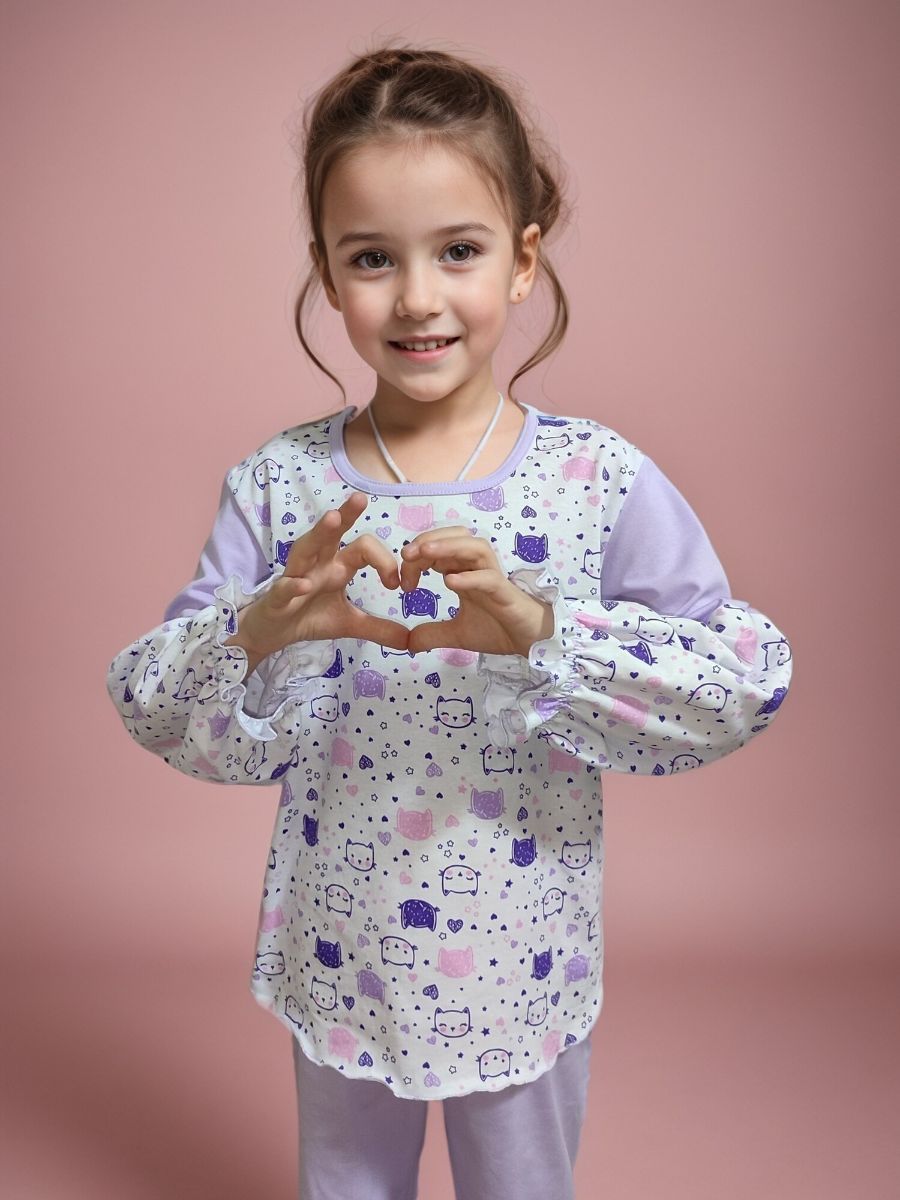 Пижама с длинным рукавом для девочек хорошо смотрится благодаря современному крою. Выверенные лекала были созданы, чтобы ребенок мог ощущать безупречное удобство в каждом движении. Прямые брюки плотно сидят на поясе. Внутрь вшита мягкая эластичная резинка, которая не перекручивается и не сползает в процессе носки. Это важный момент для активных детей. Лонгслив с длинным рукавом обладает округлым вырезом горловины. Кофточку можно заправить или носить навыпуск. Комплект долгое время сохраняет прекрасный внешний вид благодаря высокому качеству хлопкового трикотажа. Пижамный комплект хлопковый идеально подходит для чувствительной детской кожи. Хлопок в отличие от синтетики не вызывает раздражений, отлично пропускает воздух и комфортен при длительном ношении.