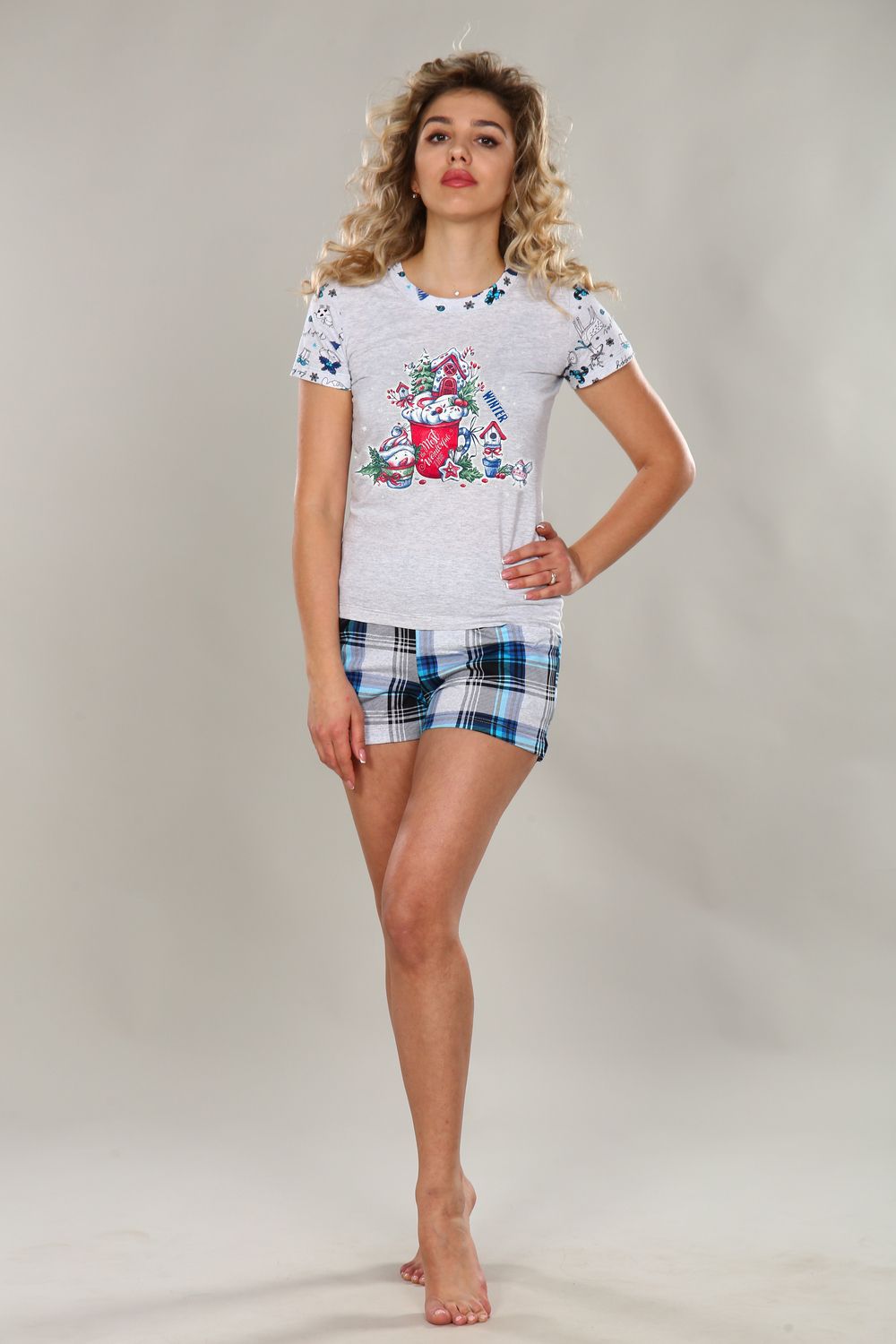 Пижама с шортами, веселая и уютная модель с новогодним принтом. Футболка с втачным рукавом и декоративной, глянцевой печатью в стиле шелкографии. Шорты на резинке с карманами.