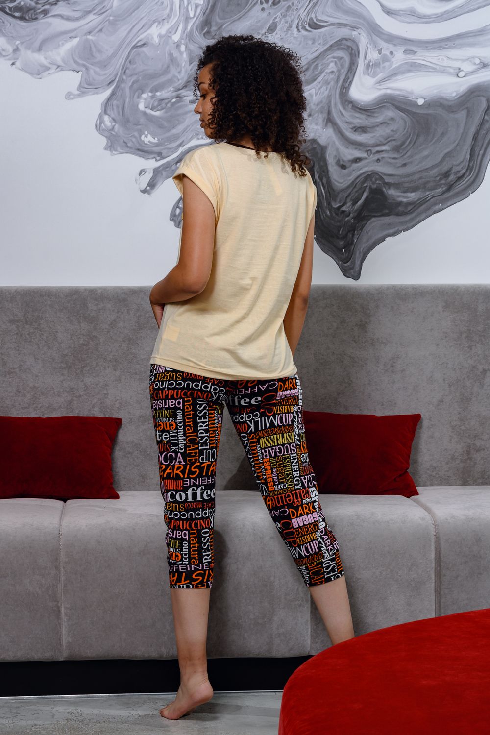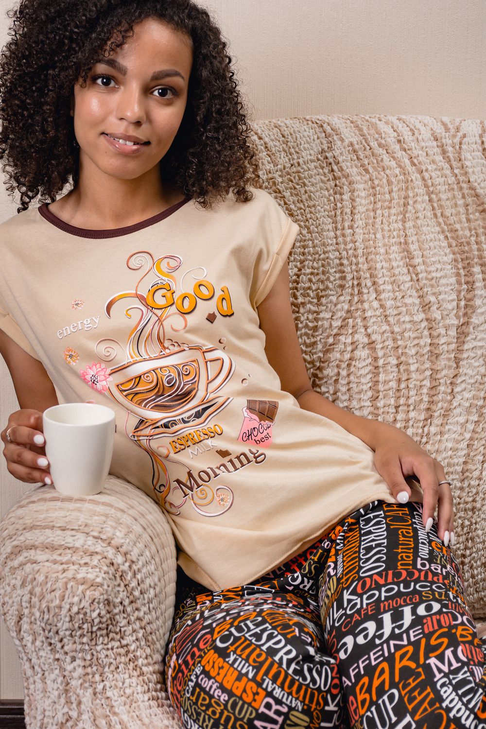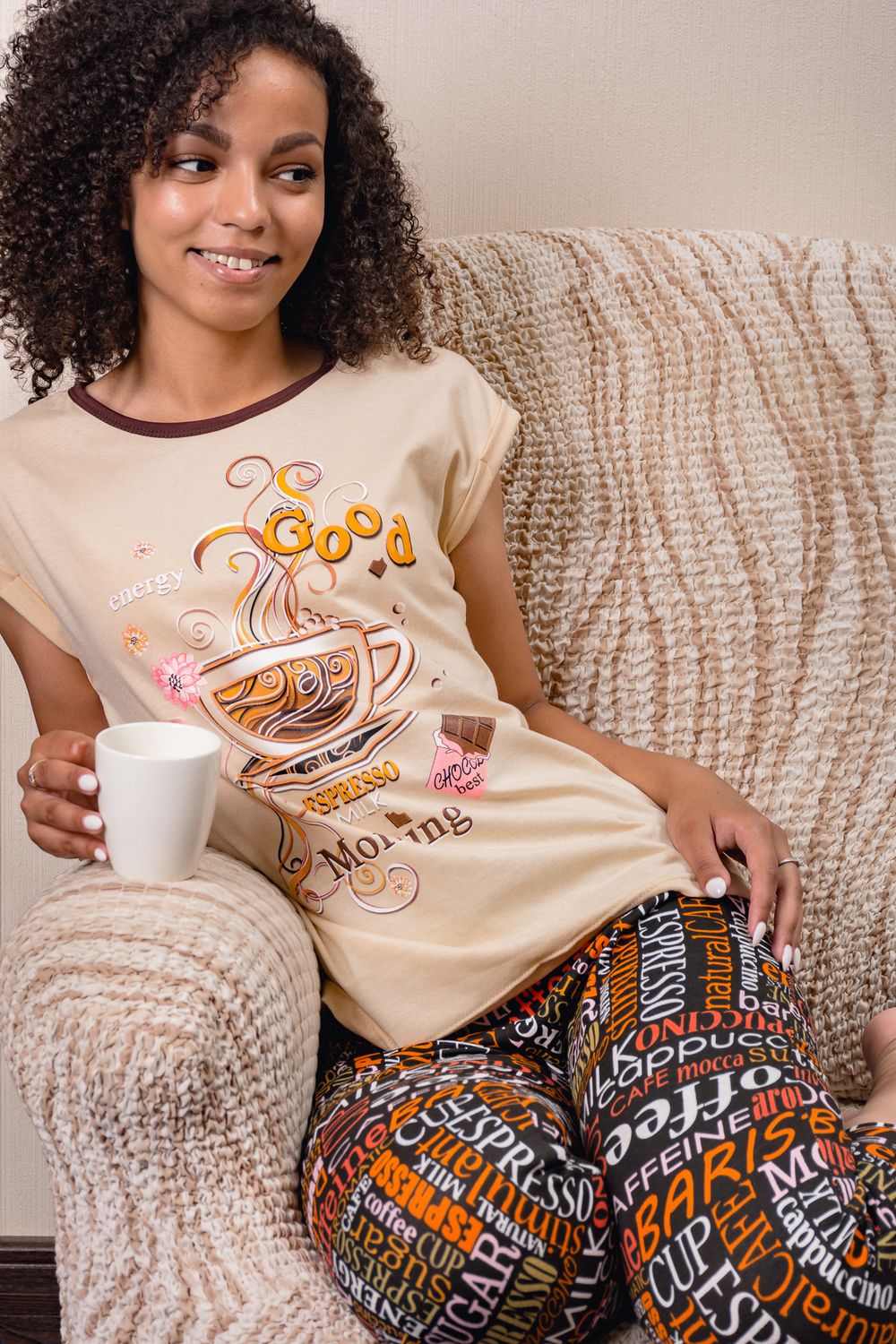 Уютная пижамка с оригинальным принтом "Доброе утро". Можно использовать как домашний костюм. Футболка со спущенным рукавом, бриджи свободного кроя, на манжете