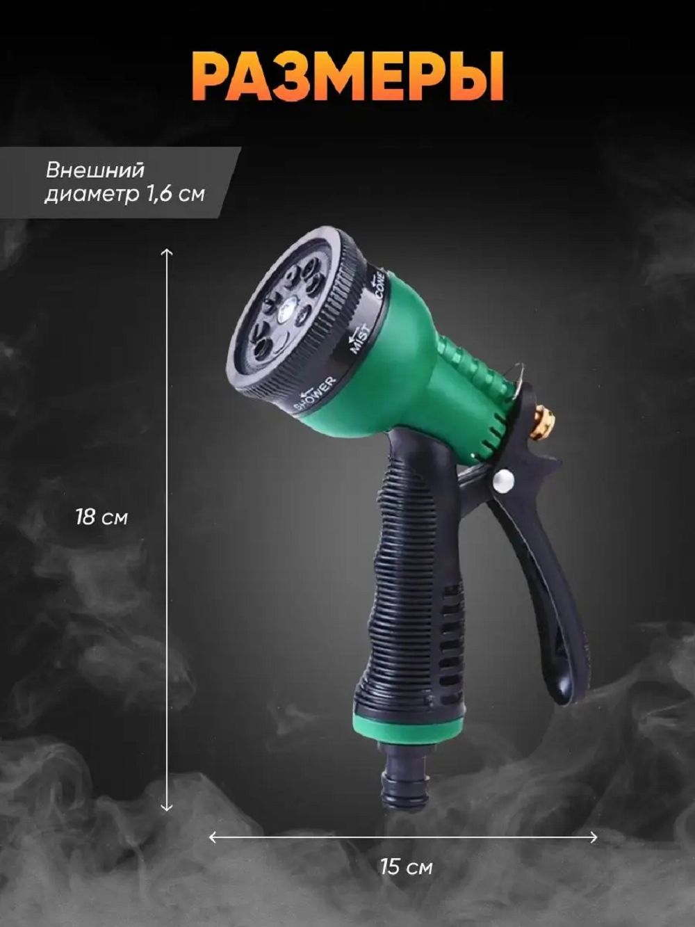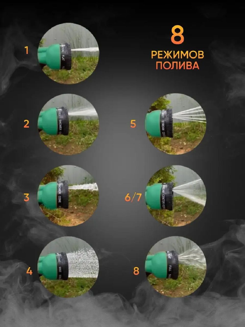 Пистолет поливочный имеет 8 полноценных режимов полива, а именно: струя, конус, горизонтальная струя и душ, поток а так же туман, душ из центра. Благодаря своей многофункциональности садовый пистолет, помимо основных функций, поможет Вам без труда помыть домашнее животное после прогулки или автомобиль по приезде на дачу. Также водный пистолет можно использовать для полива комнатных растений. Любому дачнику важно, чтобы его огород приносил много плодов, в данном случае следует уделить особое внимание поливу Ваших растений. Дачный, огородный и автомобильный инструмент станет функциональным помощником авто любителя для машины и для садоводства. Переключение режимов полива осуществляется круговым вращением верхнего регулятора, что даёт возможность менять режим без особых усилий.