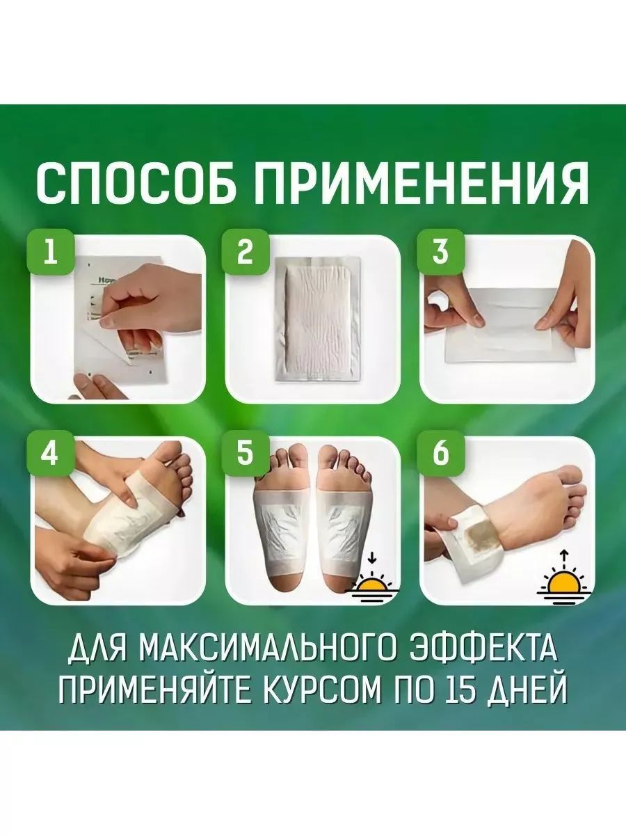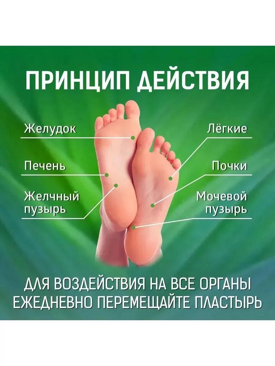 Накапливаясь в течение длительного времени в организме человека токсины препятствуют нормальному кровообращению и могут вызвать различные заболевания. Применение пластыря на стопы для выведения токсинов стимулирует циркуляцию крови и лимфы в организме человека. Через рефлекторные зоны на стопах, пластырь начинает постепенно вытягивать накопившиеся в организме токсины. Регулярное применение пластыря на стопы способствует активному выделению токсинов из организма, служит активизации кровообращения и регулирует деятельность желез внутренней секреции, способствует очищению кожи, улучшает цвет лица, устраняет кожную пигментацию. Лечебные китайские лейкопластыри для вывода токсинов от мозолей и натоптышей обезболивающие Детокс работают на основе знаний медицины Востока. Они воздействуют на активные точки стоп, которые помогают повысить защитные функции, оздоровиться, вывести накопившиеся вредные вещества, мешающие нормальной работе органов и систем. Кроме того, детоксикационный пластырь для ног способствует: снятию воспалительных процессов; усилению метаболизма; улучшению кровообращения; нормализации сна.