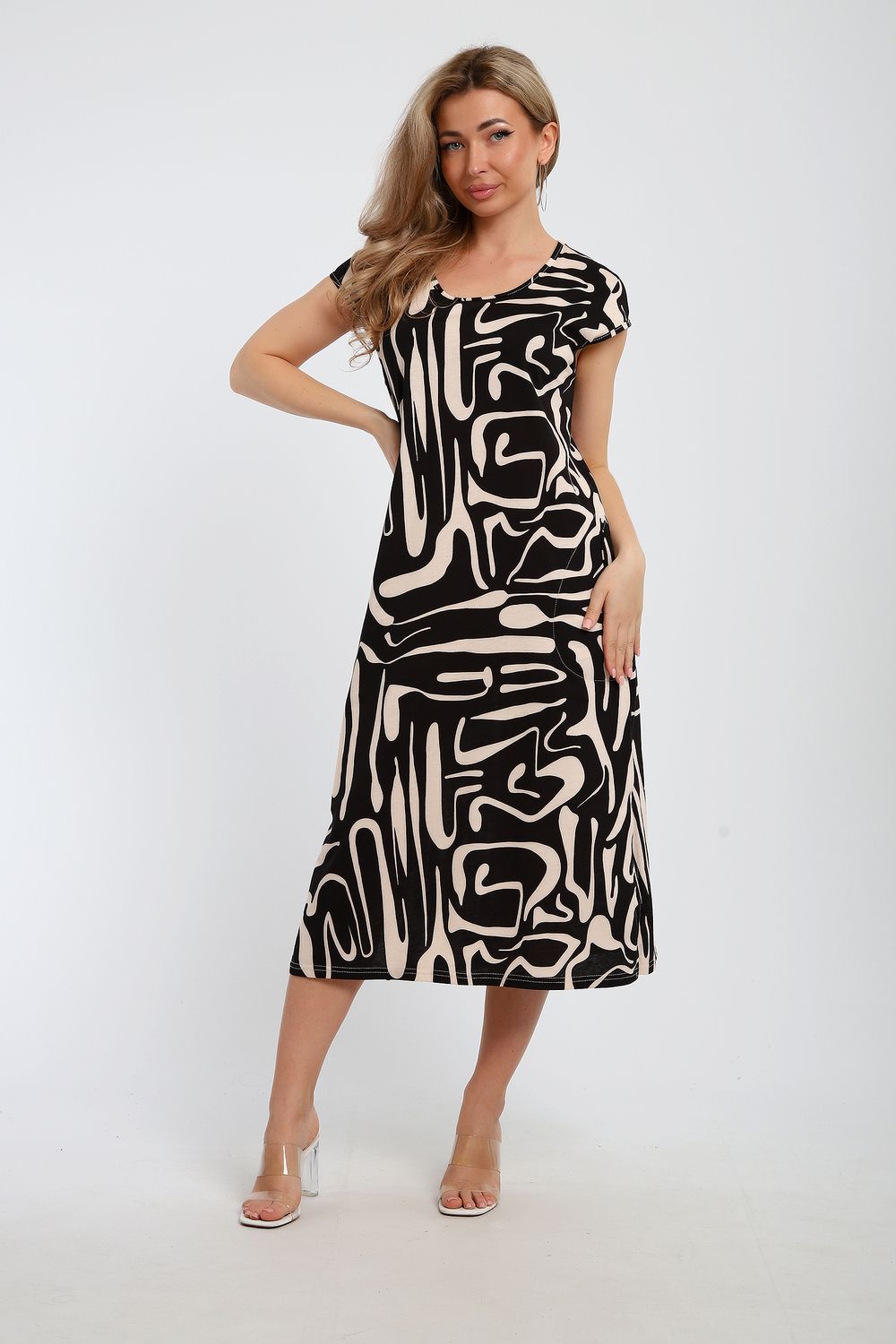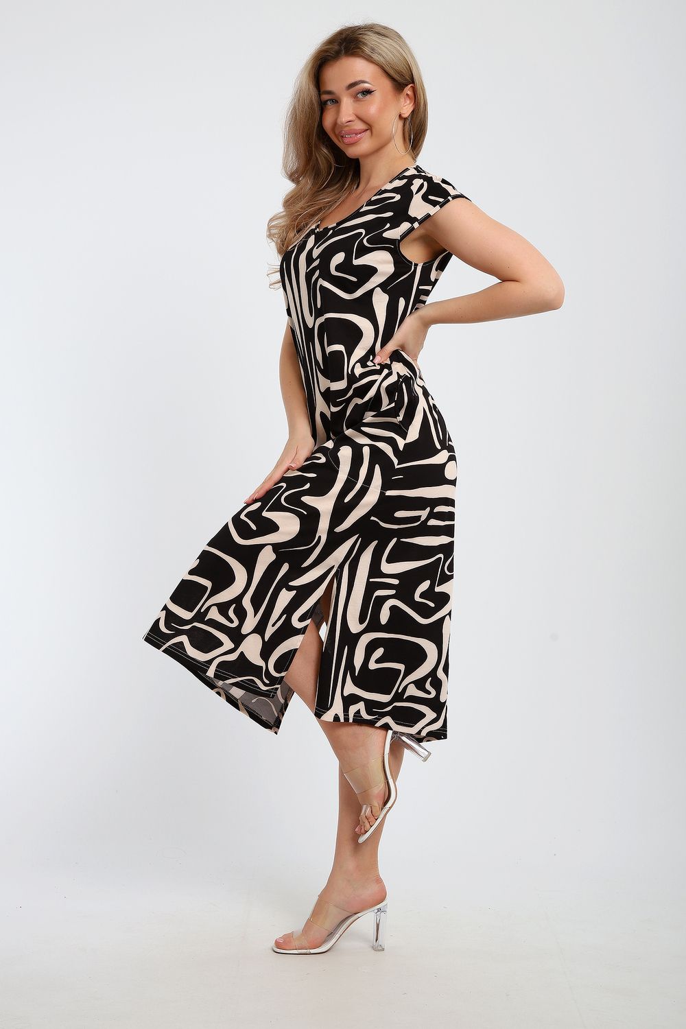 Платье женское удлиненное с легким рукавом - крылышком выполнено из кулирки 100% хлопок оригинальной расцветки. По бокам глубокие разрезы, карманы в швах, горловина обработана узким кантом. Платье элегантно подчеркивает фигуру, длина и разрезы придают стройность, оно отлично подойдет для прогулок и отдыха.