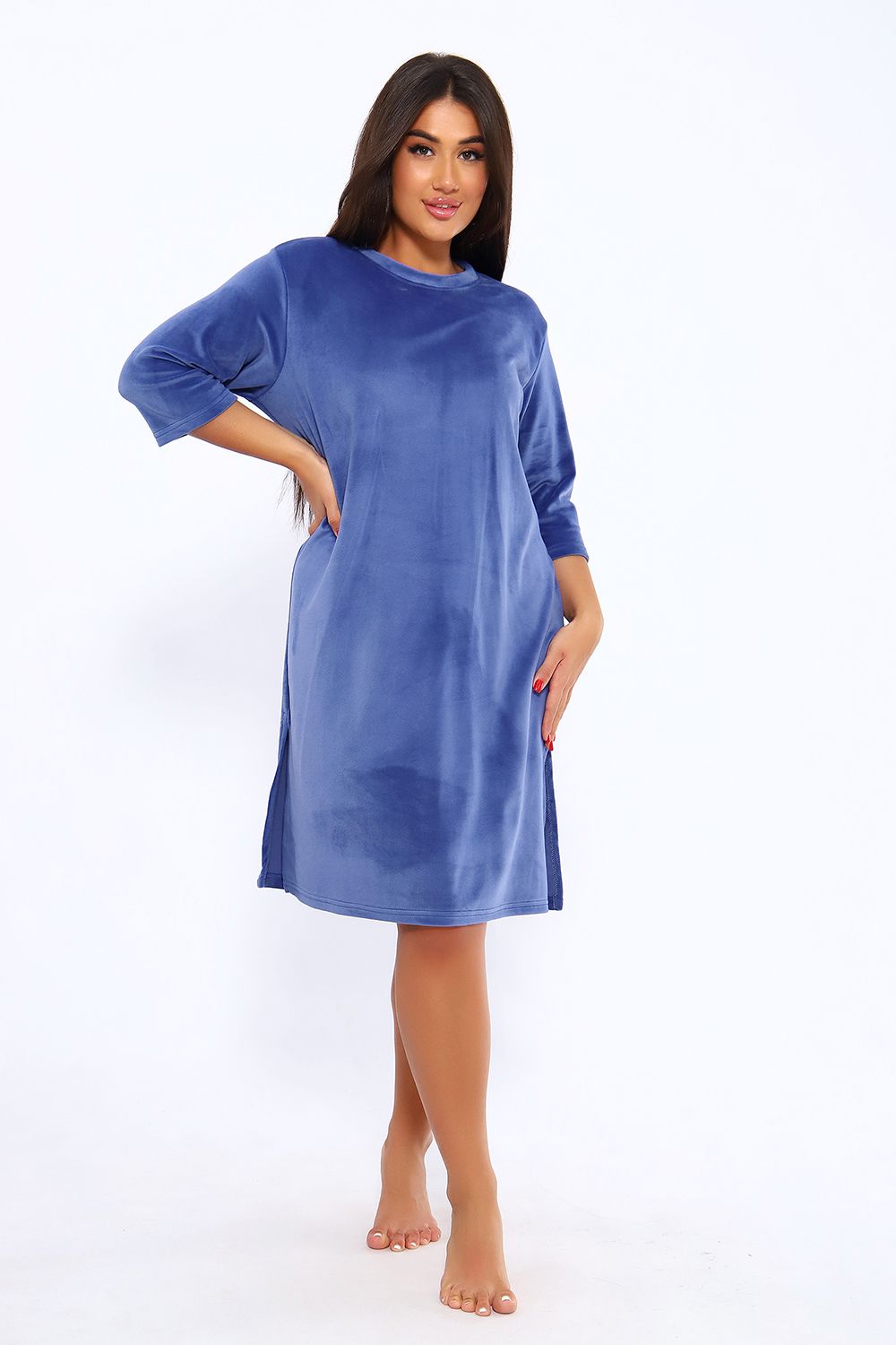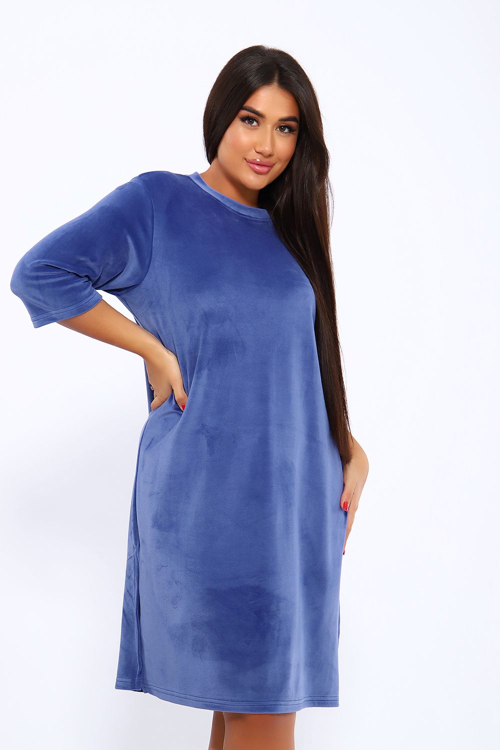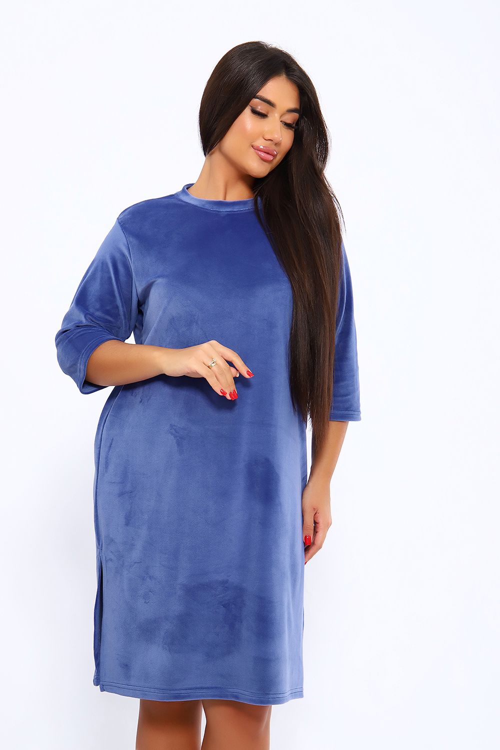 Платье женское средней длины свободного кроя из мягкого велюра. Рукав средней длины, по бокам разрезы, горловина обработана бейкой из основной ткани. Платье отлично подойдет для дома и отдыха.