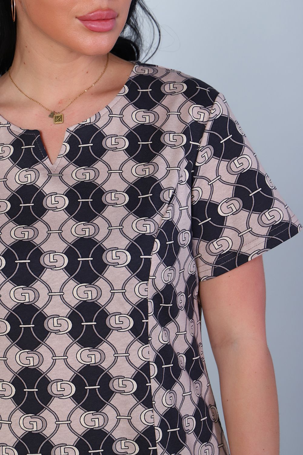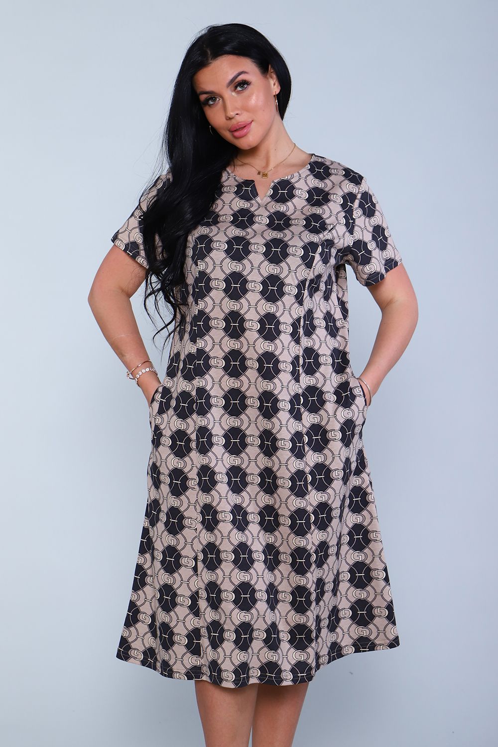 Женское летнее платье с оригинальным принтом способно интересно разбавить яркими красками повседневный образ для дома и прогулок. Модель представлена в больших размерах. Длинное платье с коротким рукавом, пошито в свободном крое, благодаря чему он позволяет комфортно себя чувствовать при выполнении активных движений. Платье дополняют практичные карманы, которые расположились на боковом шве.