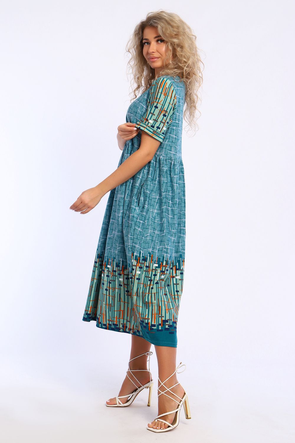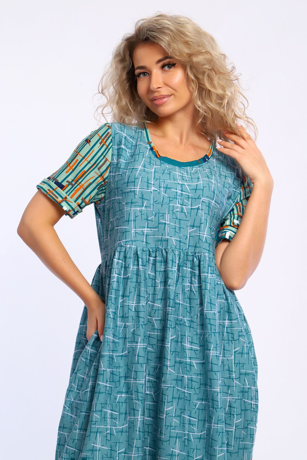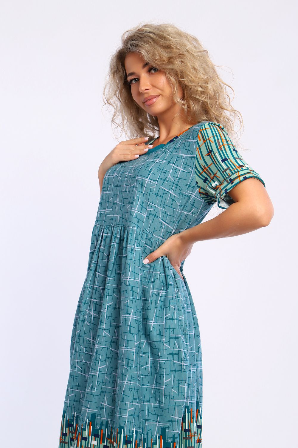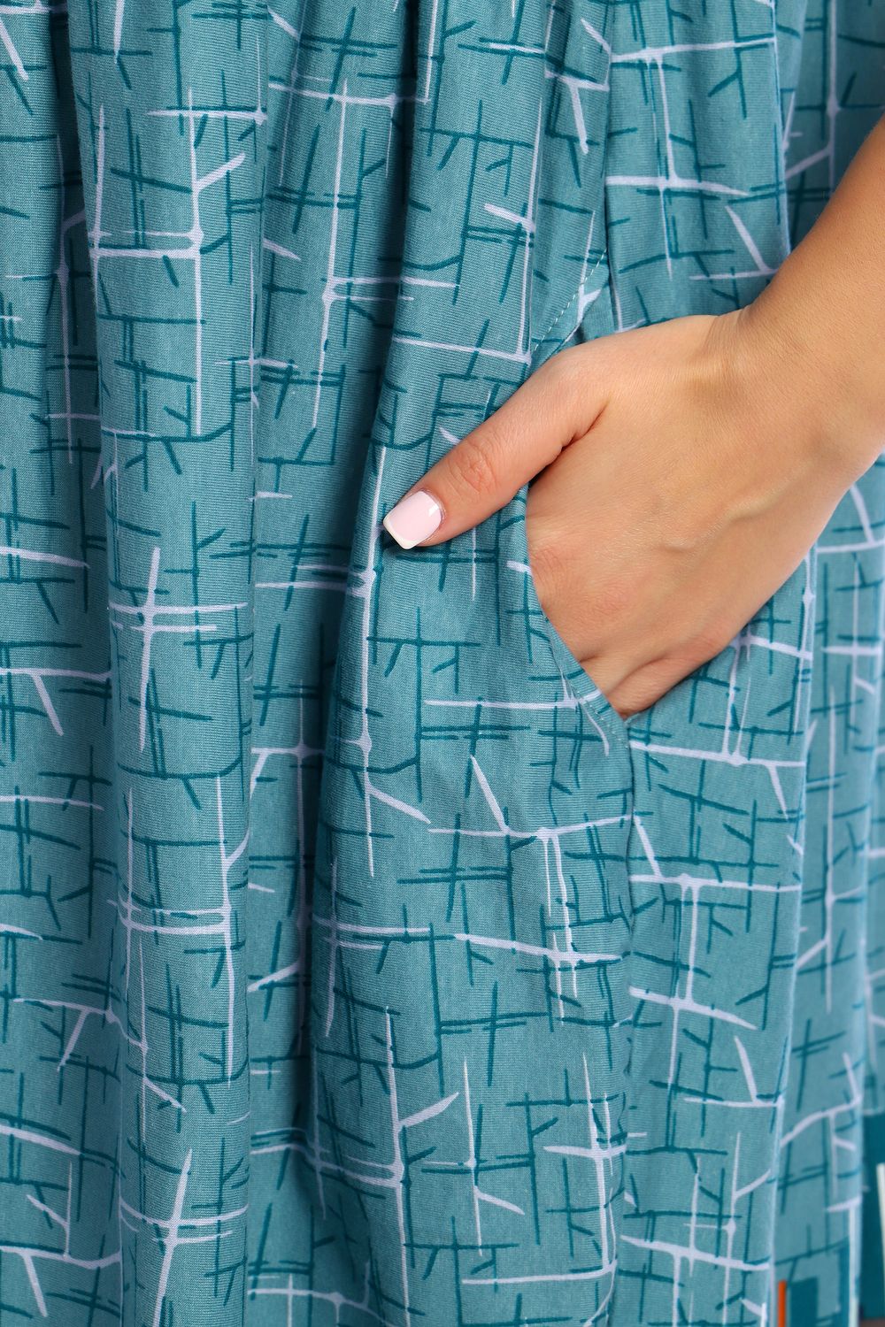 Платье с юбкой на сборке и короткими рукавами. В боковых швах удобные карманы.