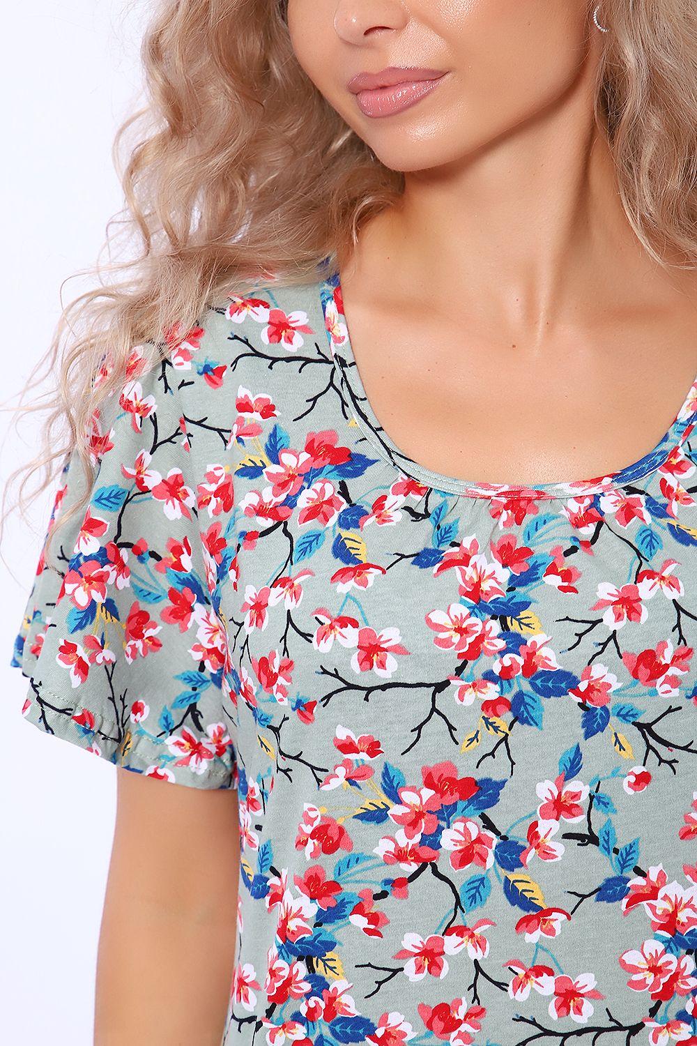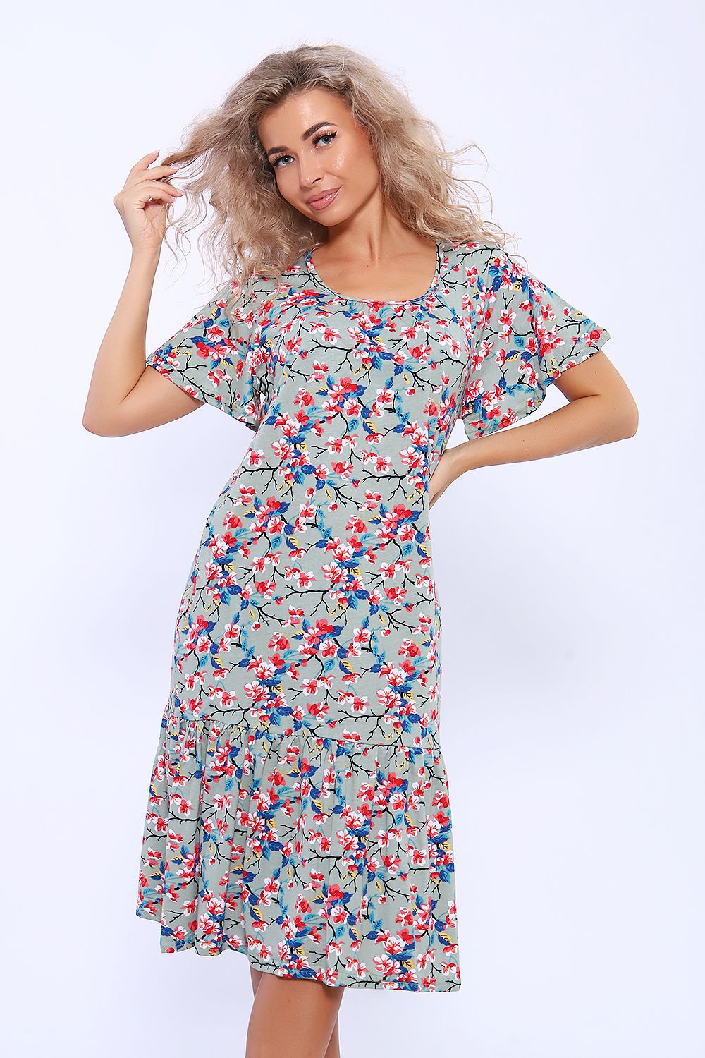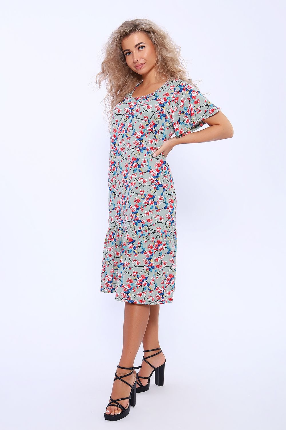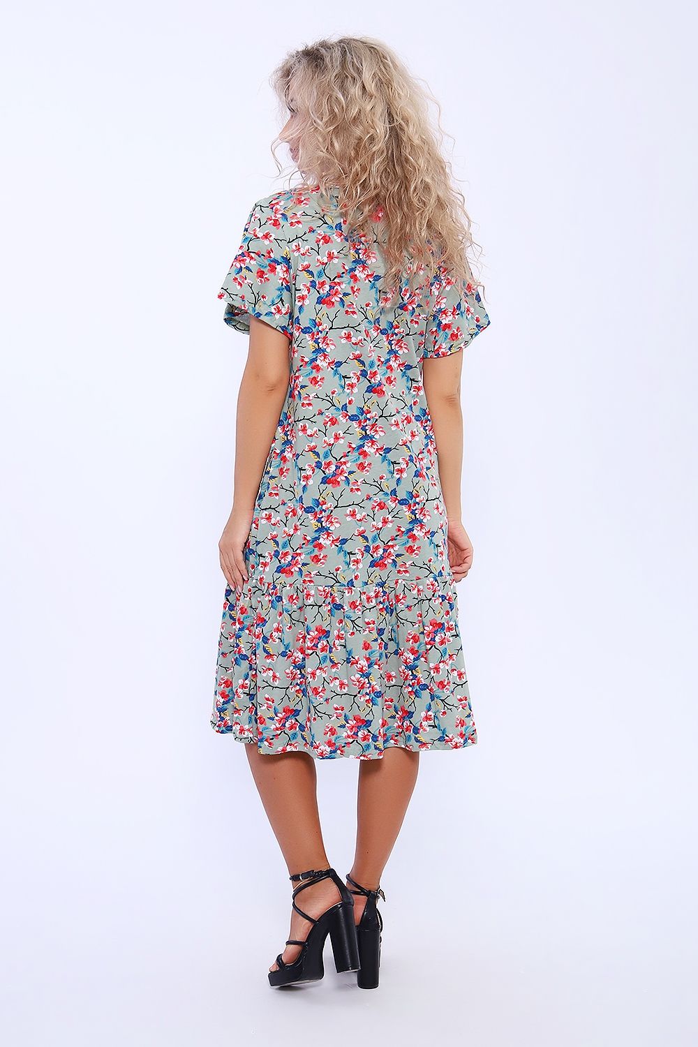 Платье полуприлегающего силуэта с короткими расклешенными рукавами. По центру горловины сборка. В боковых швах удобные карманы. По низу изделия волан на сборке.