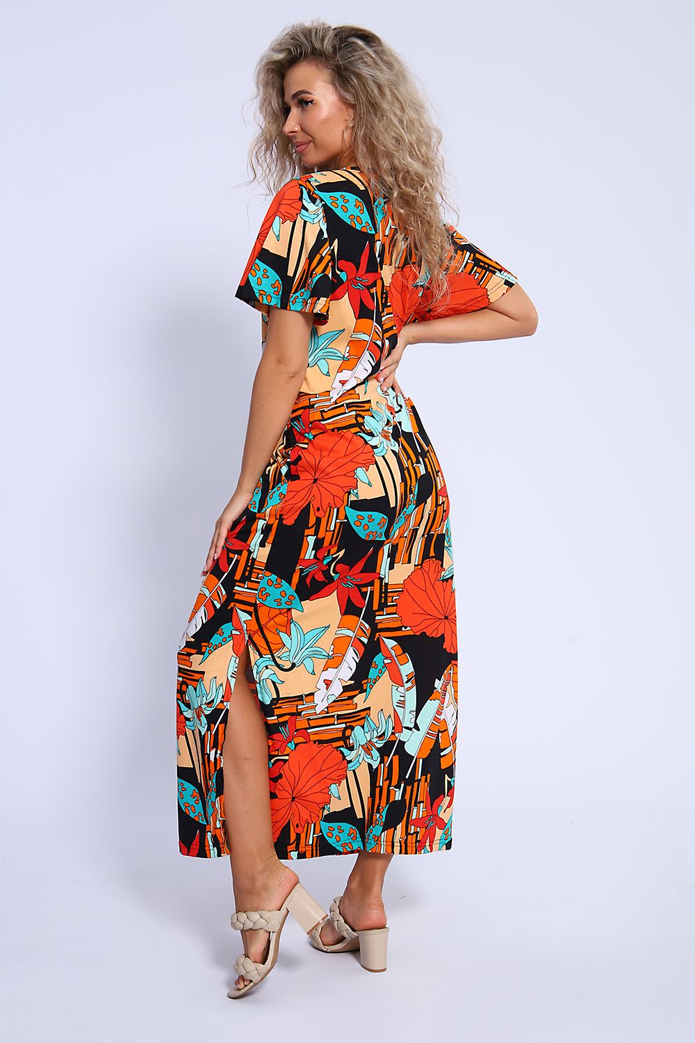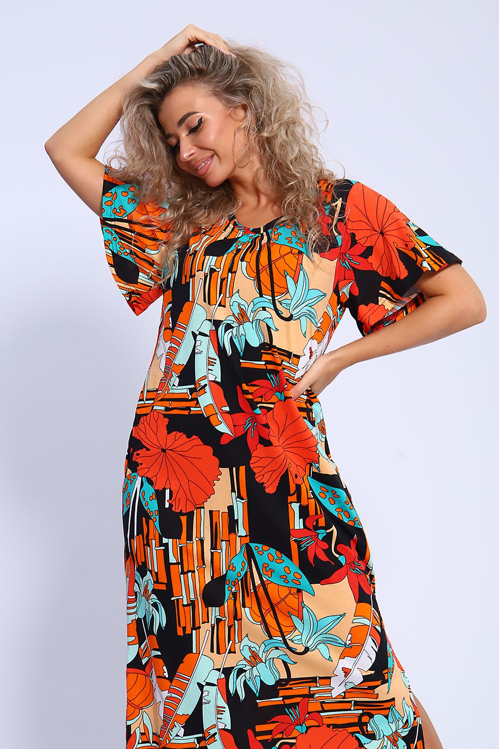 Длинное платье полуприлегающего силуэта с короткими рукавами - крылышками. В боковых швах карманы и разрезы.