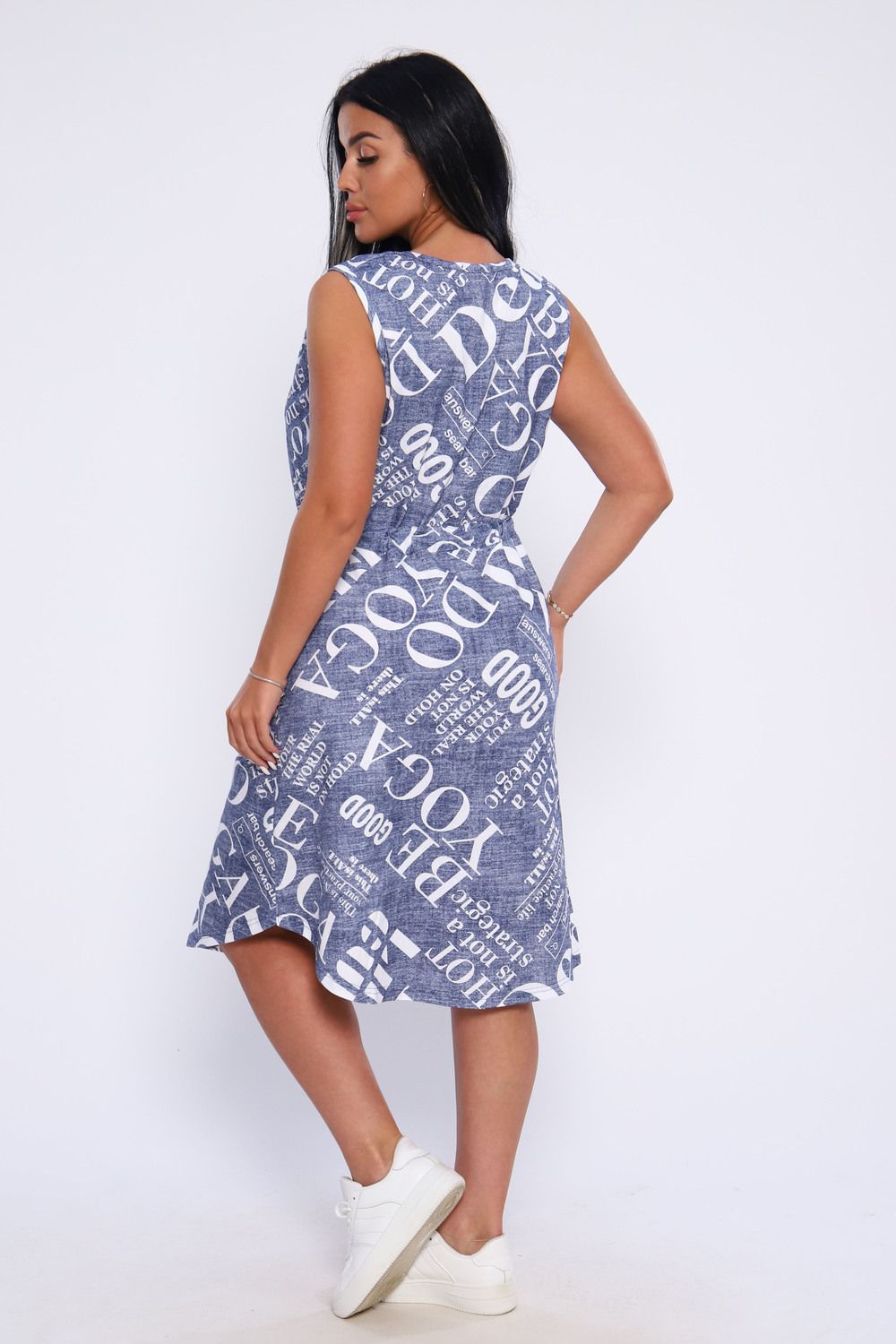 Платье женское без рукавов. Данная модель выполнена из трикотажного полотна кулирка (хлопок 100%). На полочке присутствуют накладные карманы и планка-обманка с пуговицами. Для того чтобы подчеркнуть силуэт в районе талии имеется кулиска. Горловина и пройма обработана окантовкой из основной ткани. Отличная модель для повседневной и домашней носки.