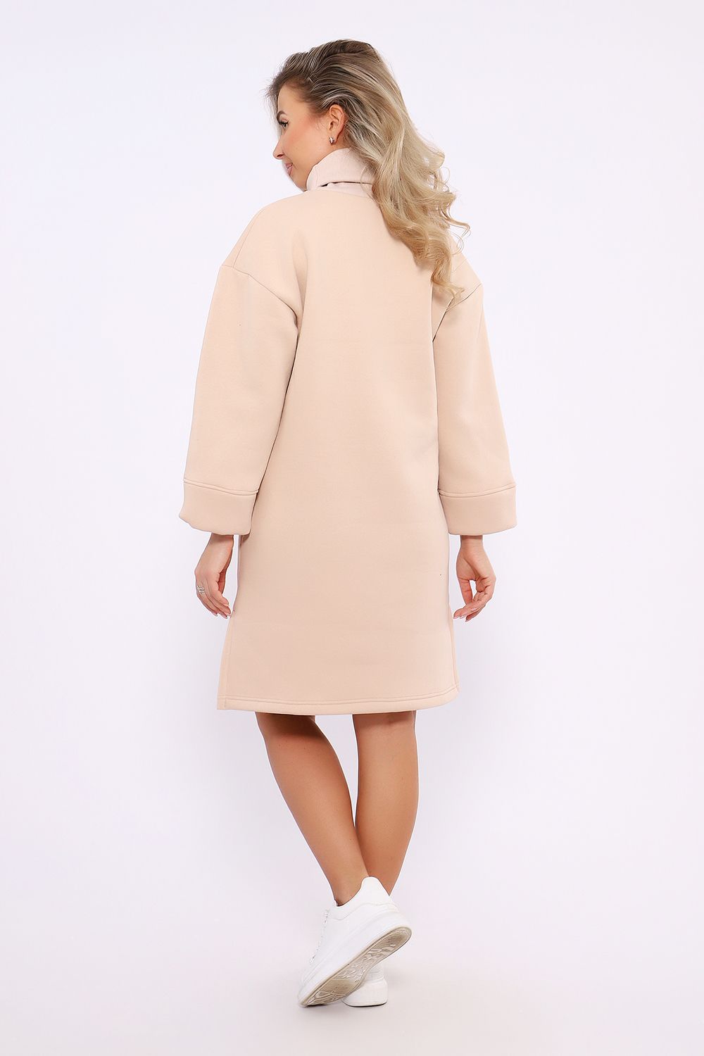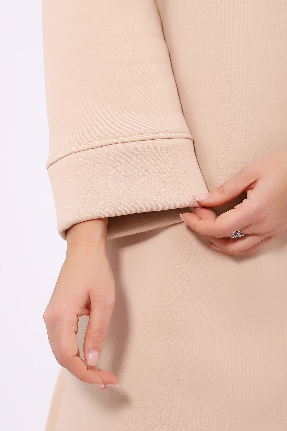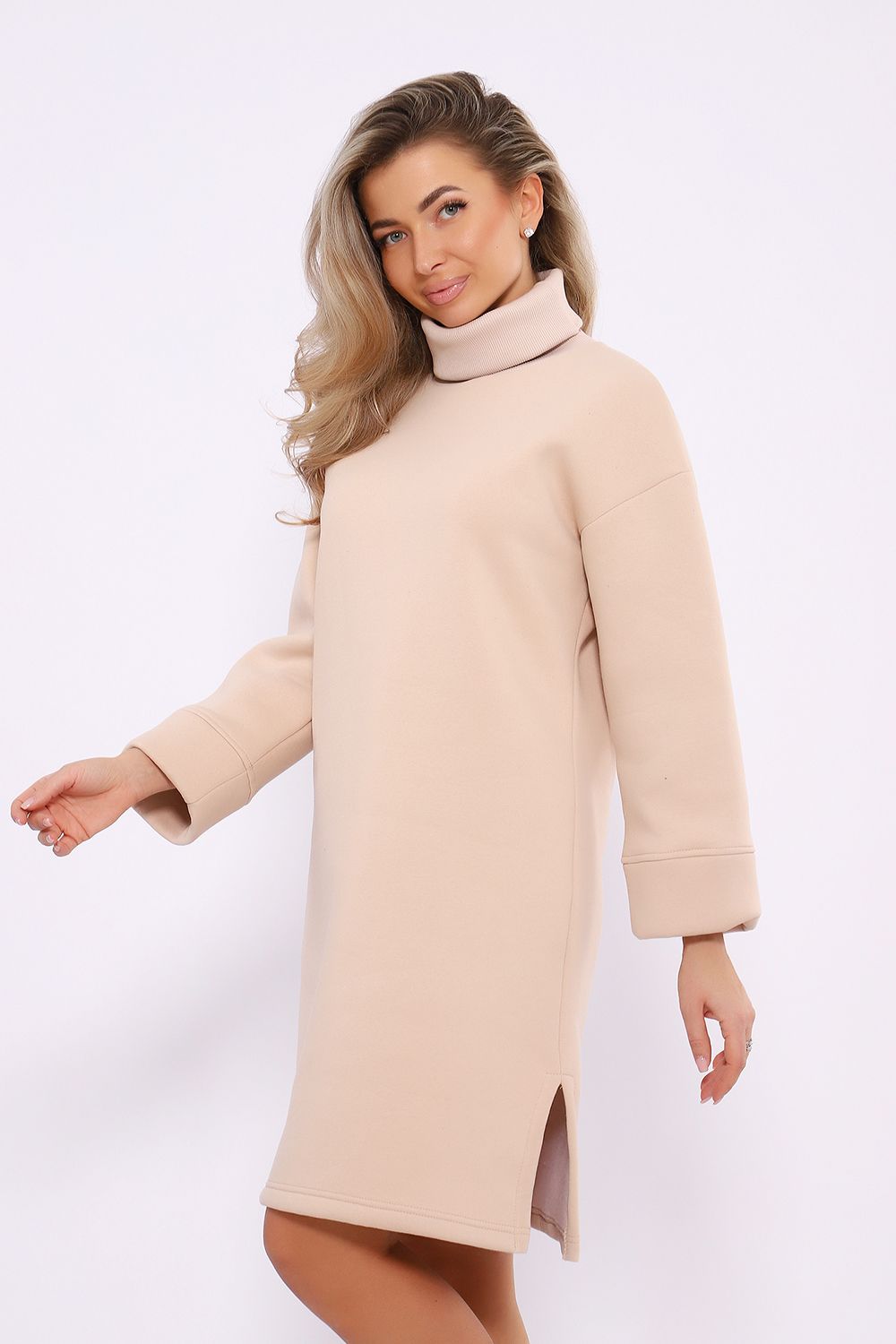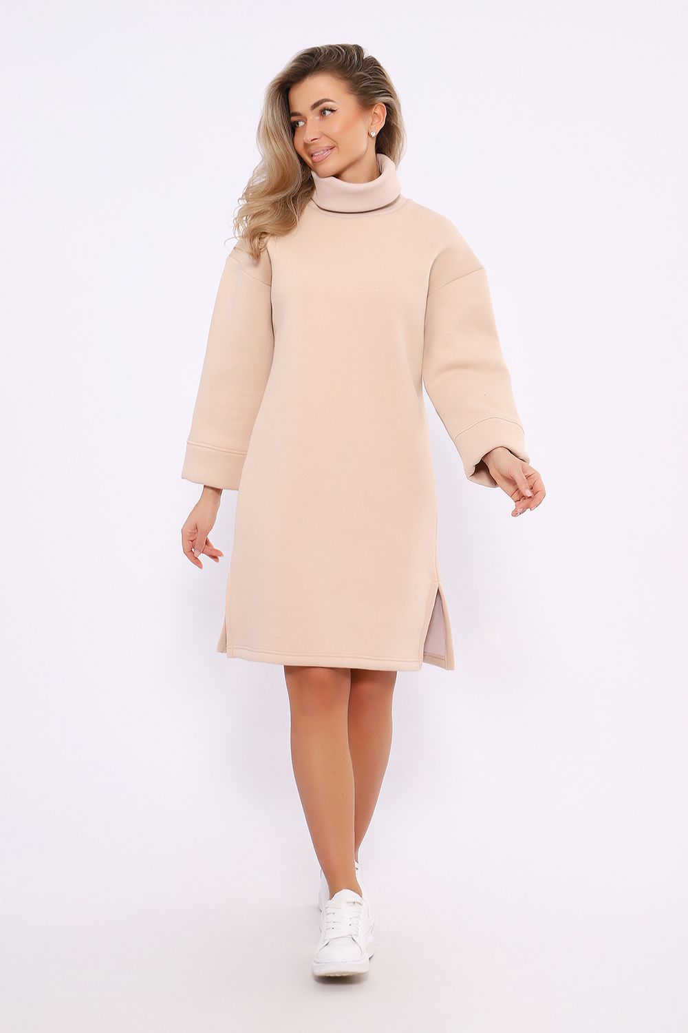 Платье полуприлегающего силуэта с укороченными рукавами, воротником стойкой и разрезами в боковых швах.