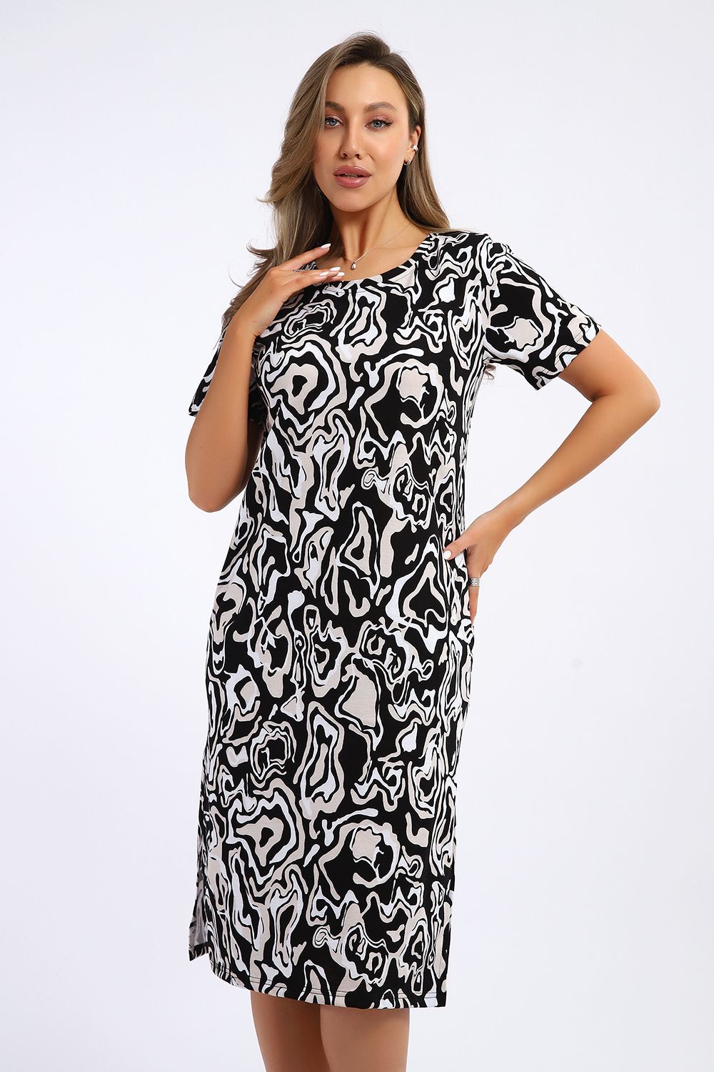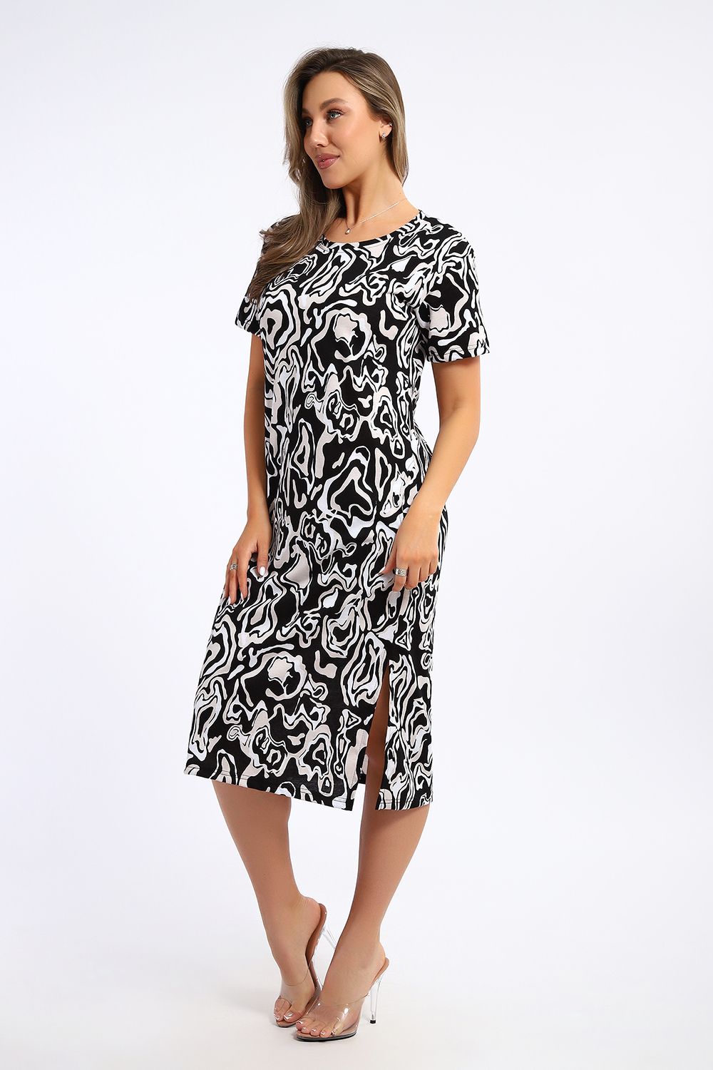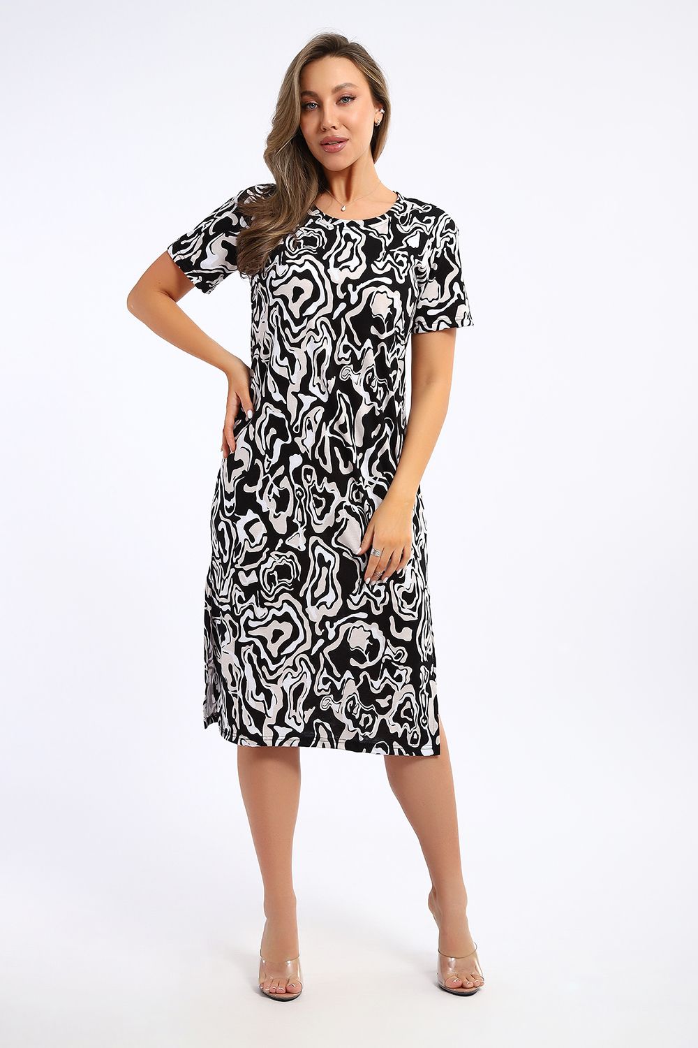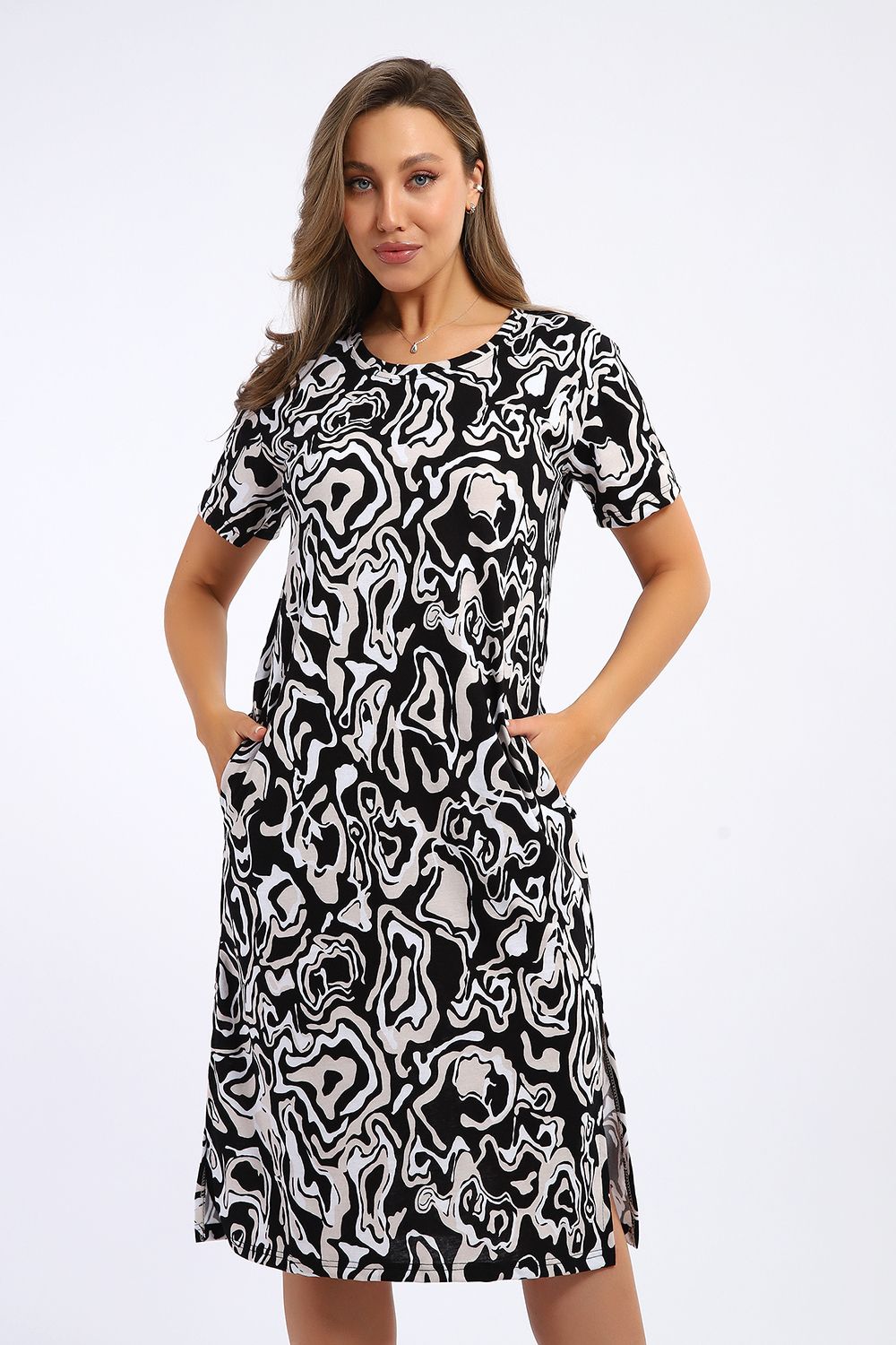 Платье полуприлегающего силуэта с короткими свободными рукавами. В боковых швах разрезы и удобные карманы.