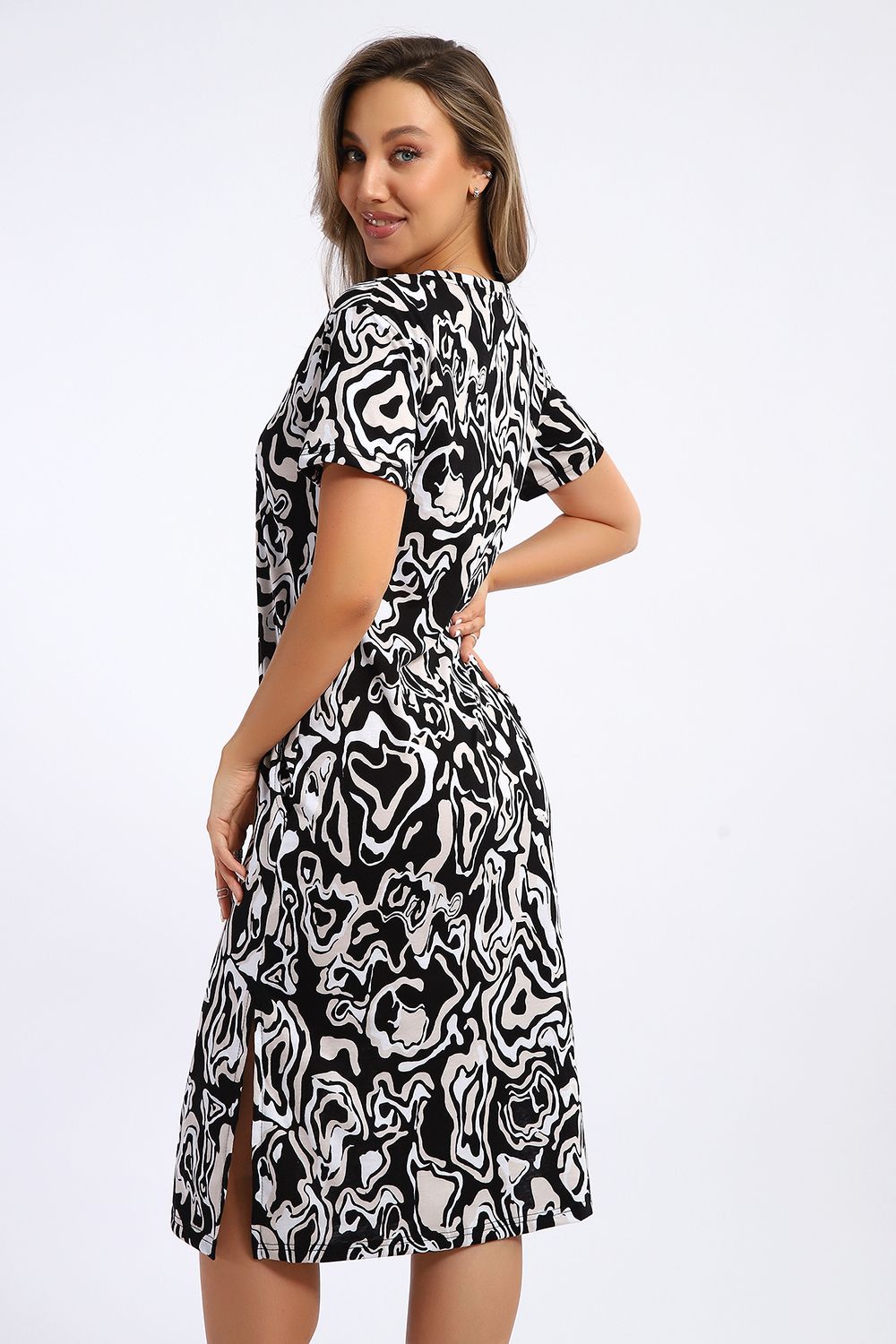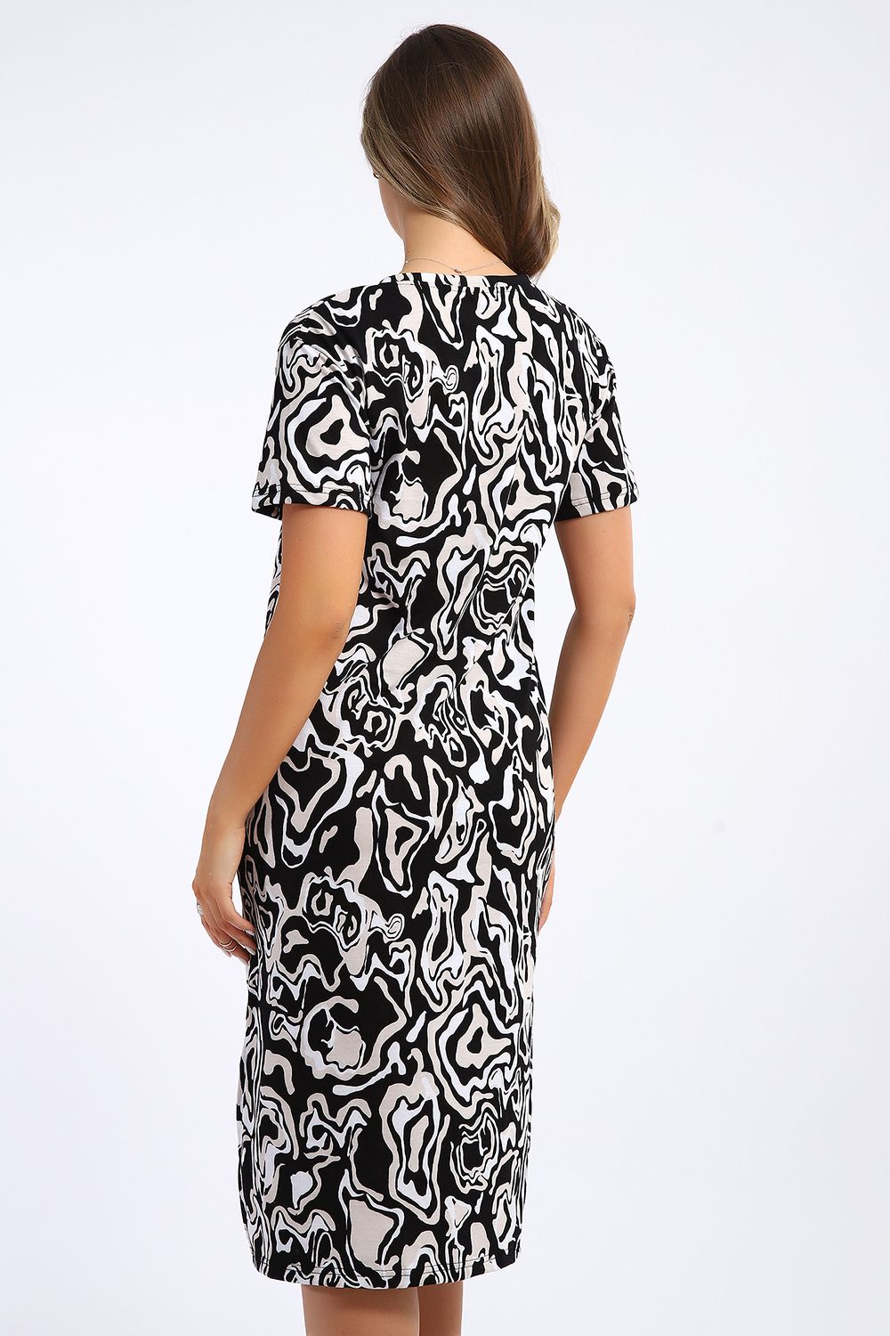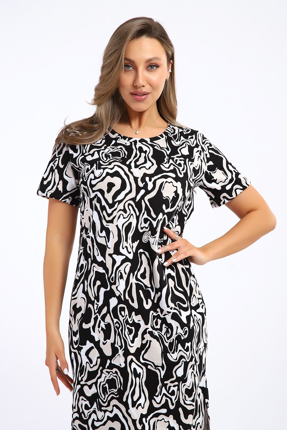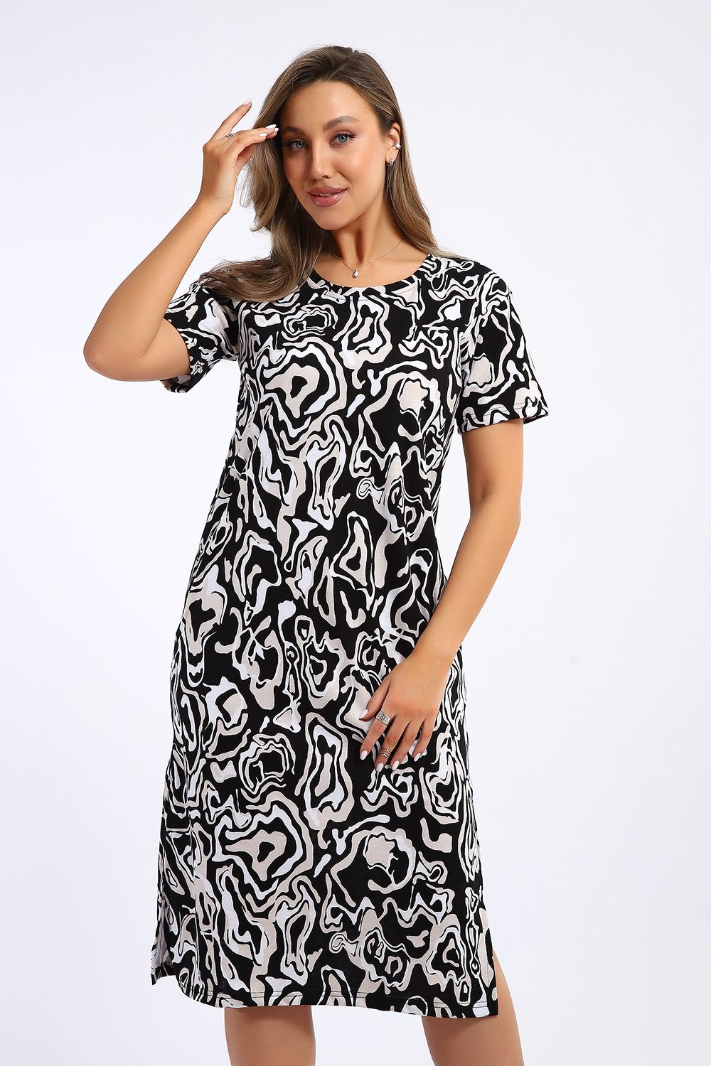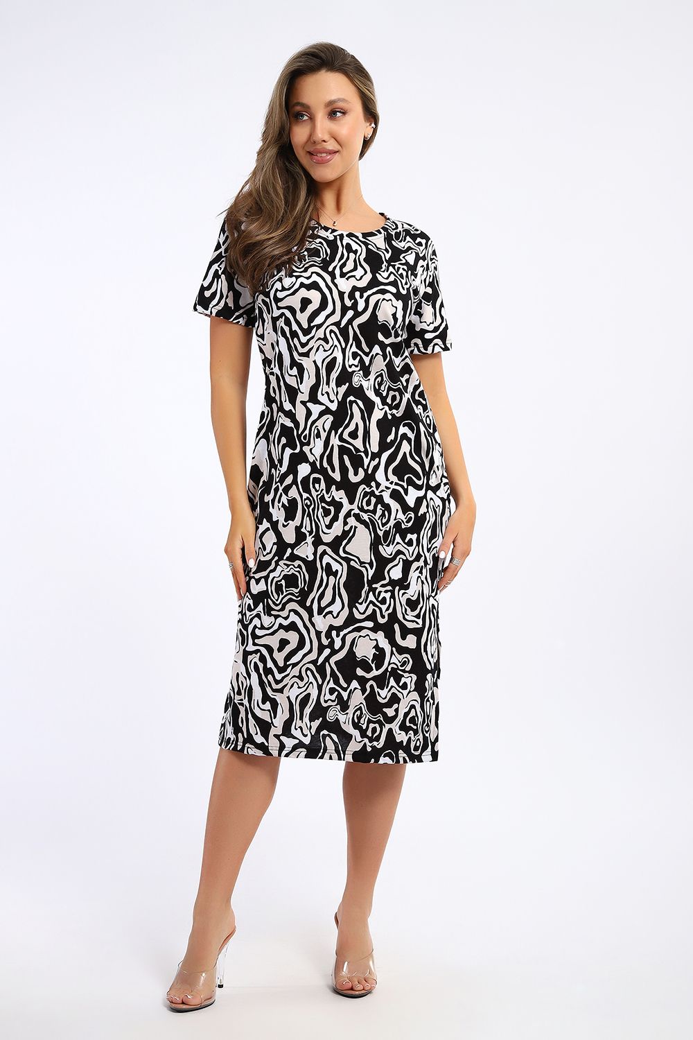 Платье полуприлегающего силуэта с короткими свободными рукавами. В боковых швах разрезы и удобные карманы.
