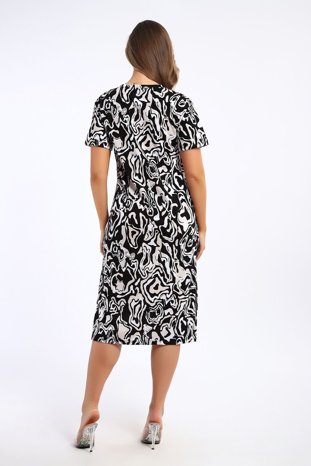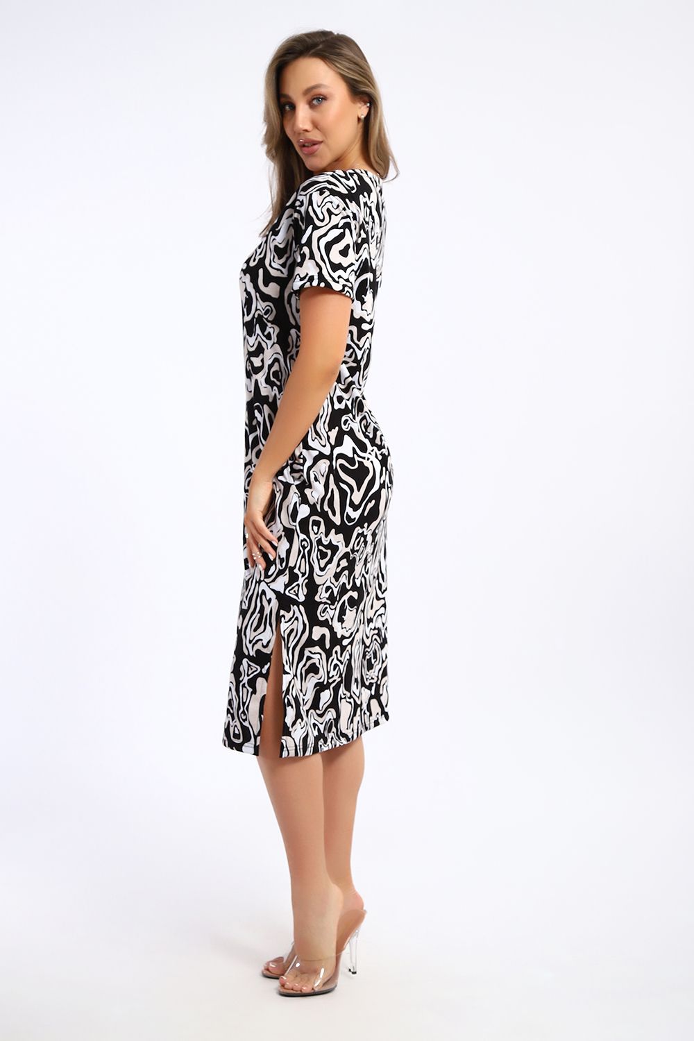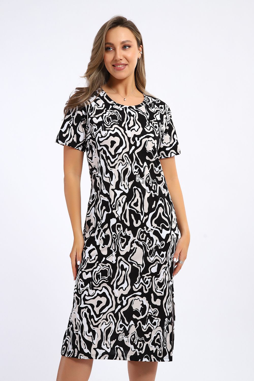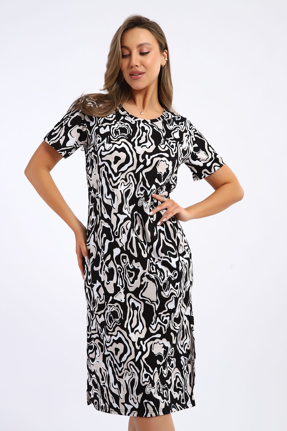 Платье полуприлегающего силуэта с короткими свободными рукавами. В боковых швах разрезы и удобные карманы.