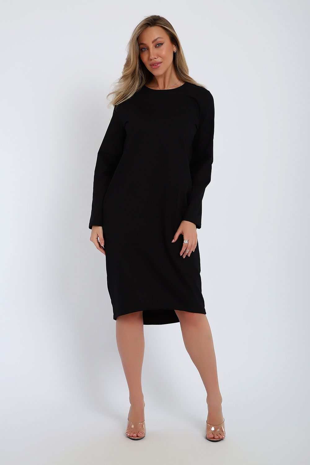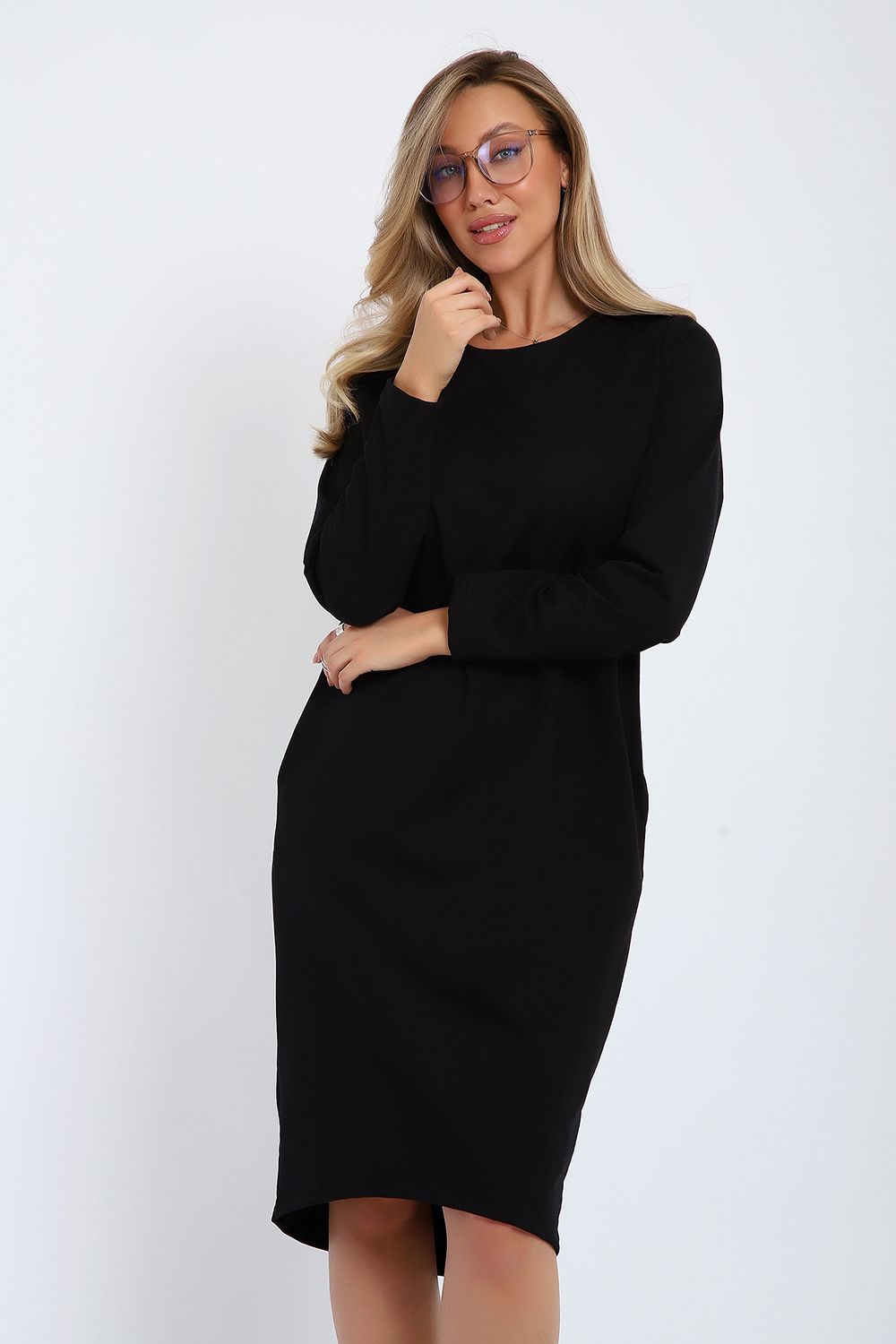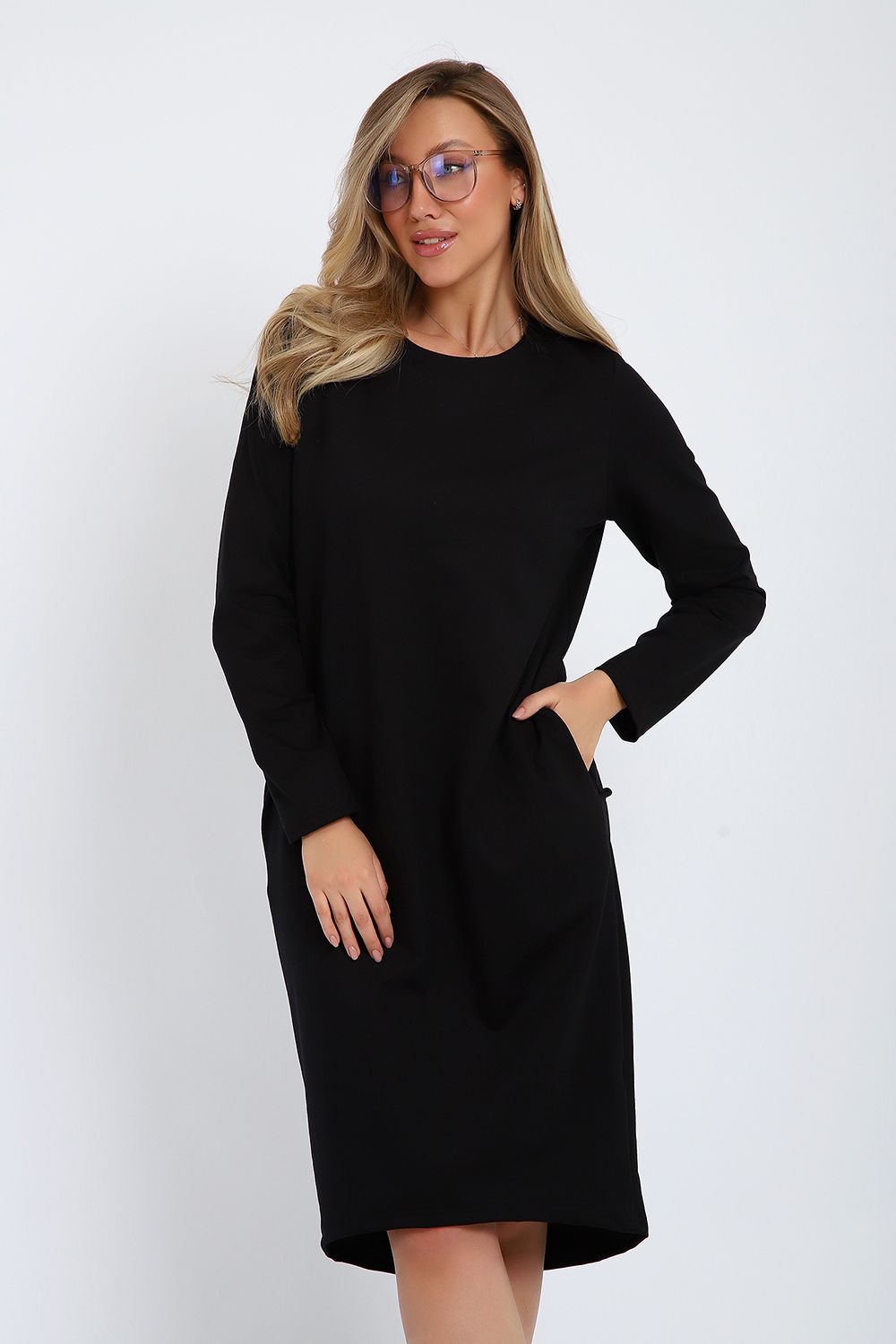 Платье-кокон с длинными рукавами, удлинённой спинкой и карманами в боковых швах.