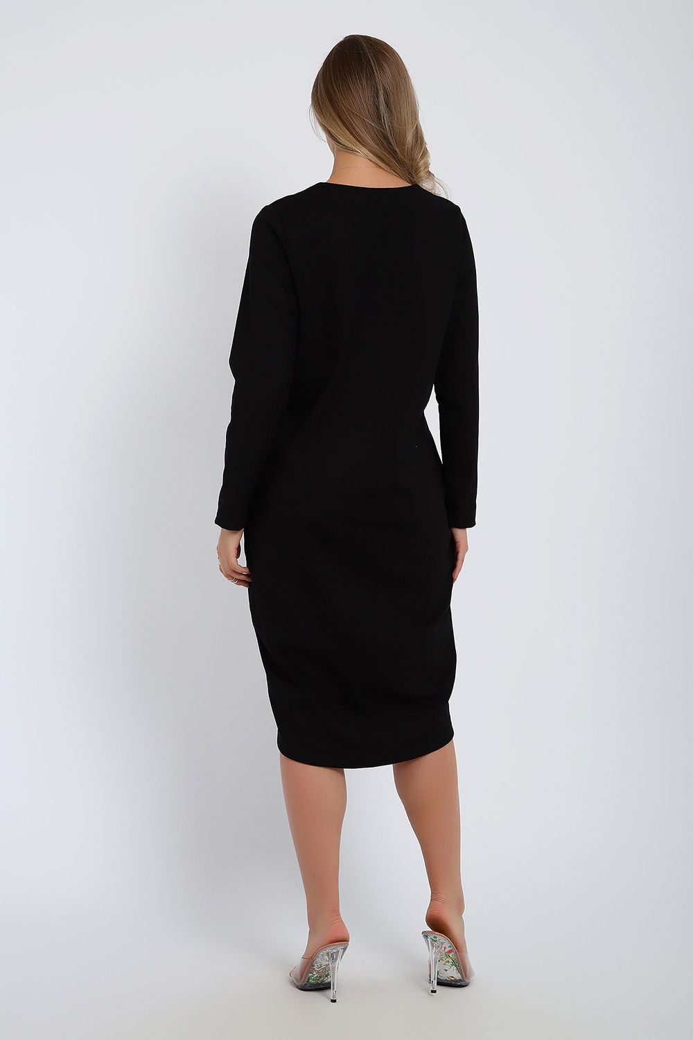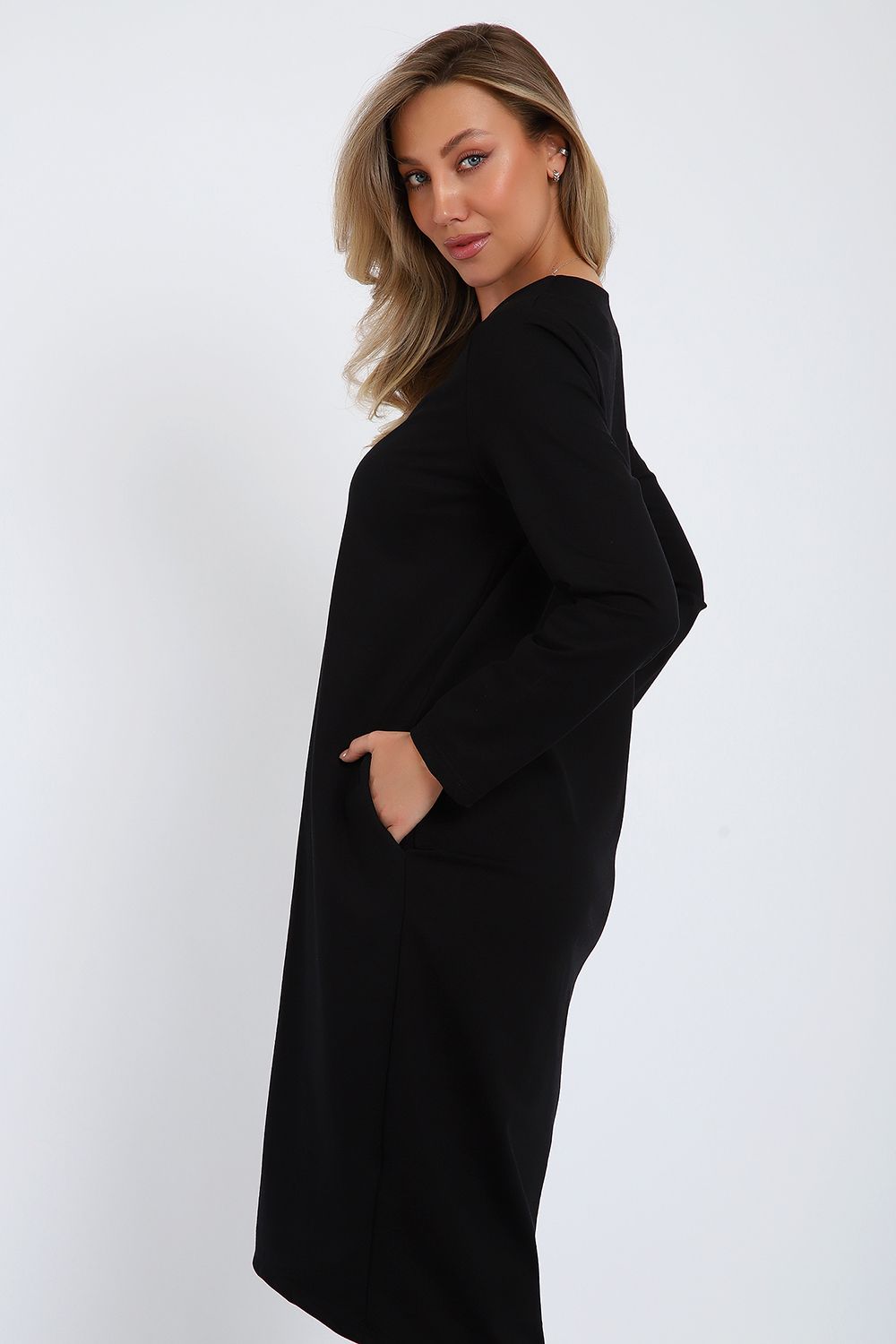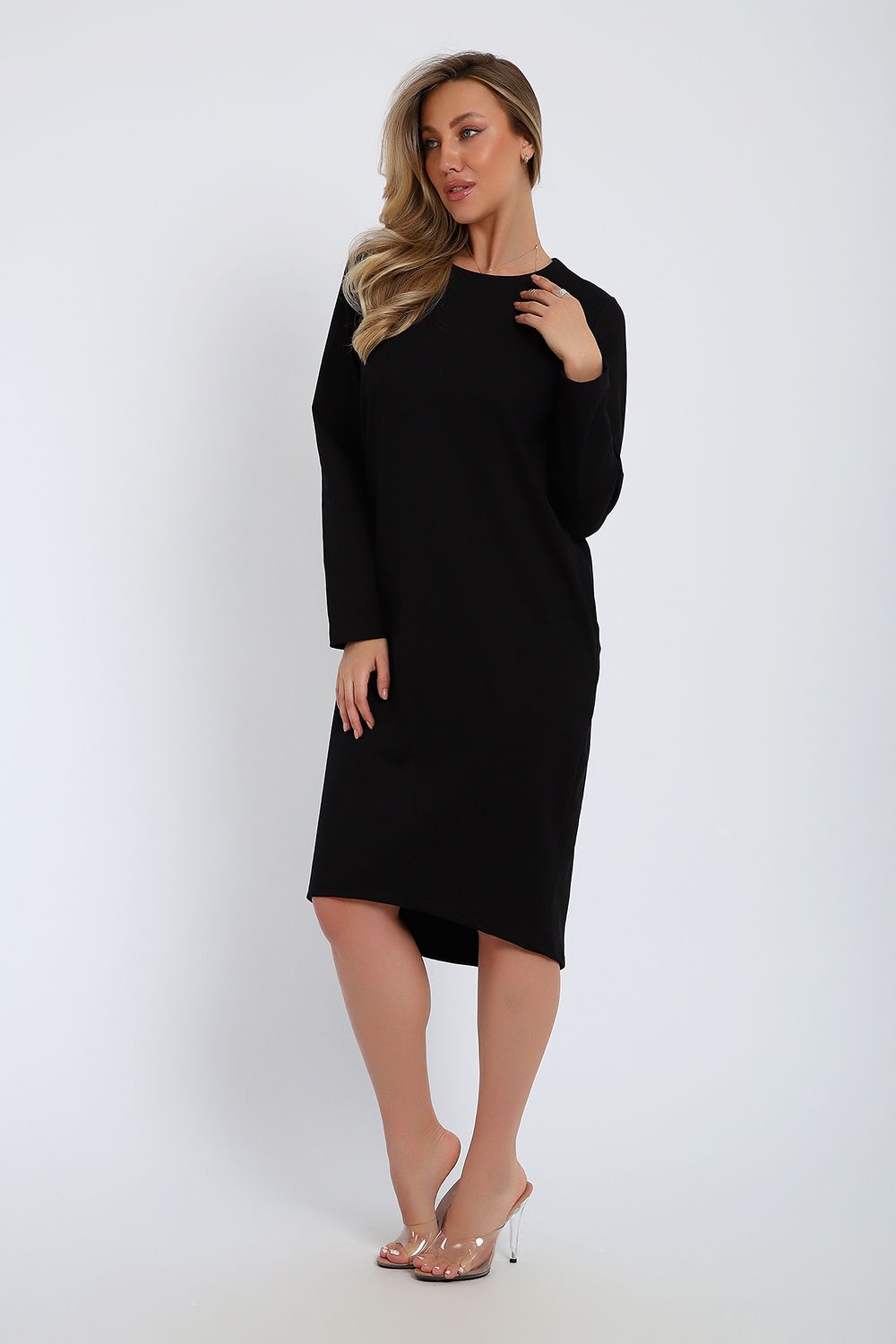 Платье-кокон с длинными рукавами, удлинённой спинкой и карманами в боковых швах.