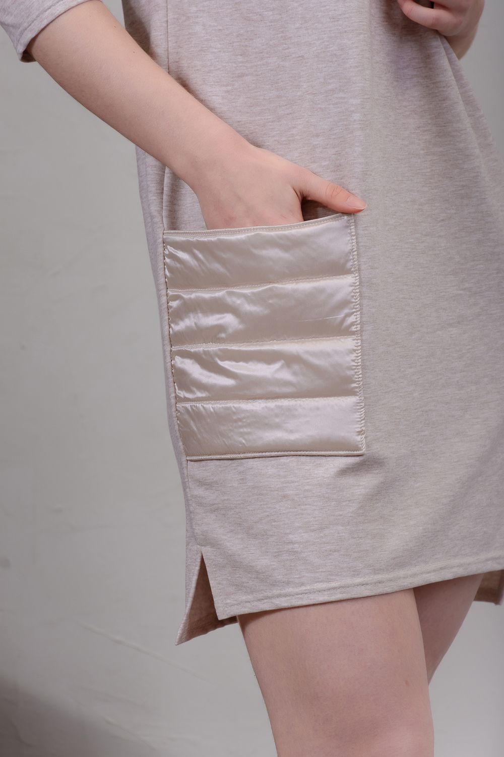 Платье молодёжное слегка приталенного силуэта, комбинированное - стёганые кокетка и карман из плащёвки на синтепоне. Горловина в виде стойки с декоративной молнией, рукав-реглан длина 3/4, спинка слегка удлинена, по бокам небольшие разрезы. Стёганые элементы в одежде - это тренд сезона, они придают платью некую изюминку, уют. Платье теплое, комфортное, подойдёт как для работы в офисе, так и для повседневного гардероба.