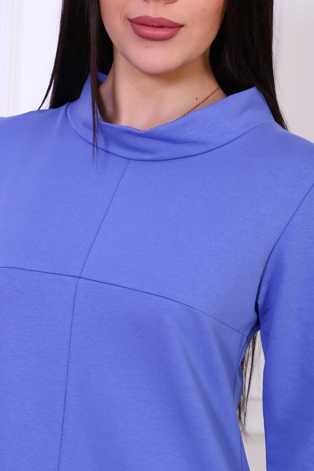 Платье женское из трикотажа футера с лайкрой качества карде, круглая горловина в виде стойки, втачной рукав 3/4 на манжете, по груди отрезная кокетка, в боковых швах удобные карманы. Модель А-силуэта смотрится очень женственно и универсально в плане скрытия недостатков фигуры, выглядит всегда модно и актуально.