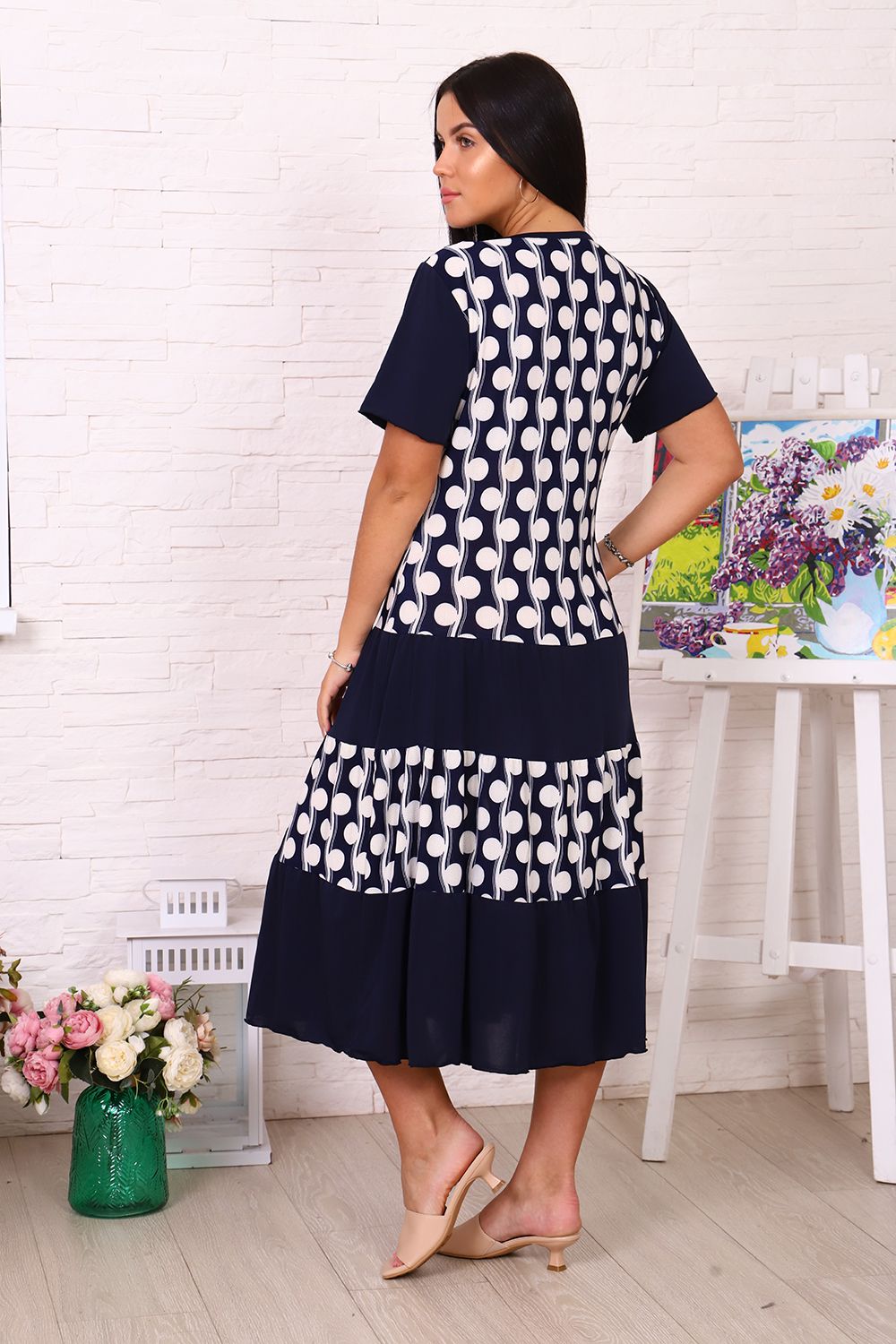 Повседневное платье с оборками, коротенький рукав, округлый вырез - отделан кантиком. Длина ниже колен.