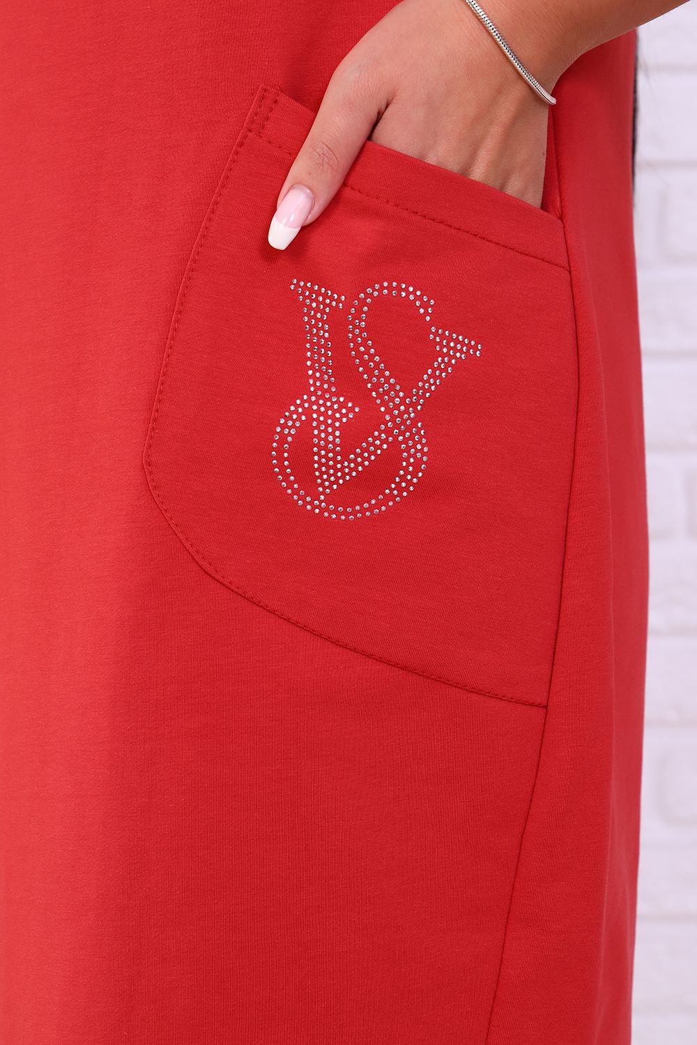 Платье прямого кроя, приталенное. На передней полочке 2 накладных кармана украшены декоративными стразами, на груди так же декоративные стразы. Низ передней полочки обработан декоративной резинкой. Округлая горловина. На спине скрытая молния. Рукав 3/4 на манжете-резинке. Спинка изделия длиннее передней полочки.