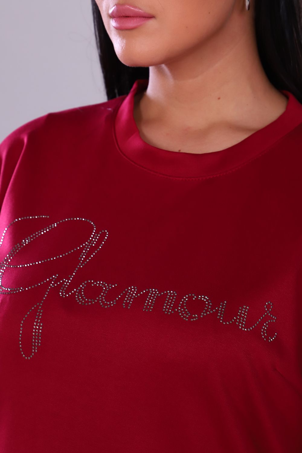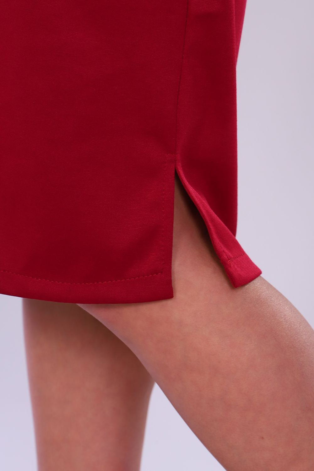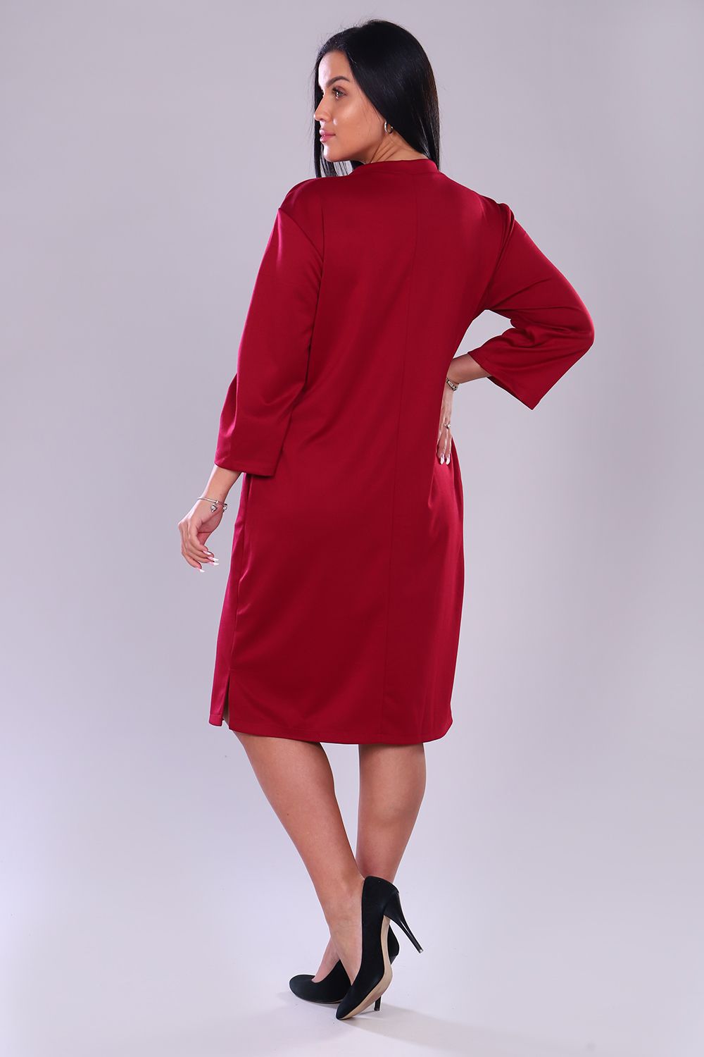 Платье женское прямого покроя. Округлый вырез отделан кантом. Рукав 7/8. Боковые карманы. По низу изделия с левой стороны разрез. На груди оригинальная наклейка из страз. Благодаря универсальности платье выглядит уместно в самых различных ситуациях.