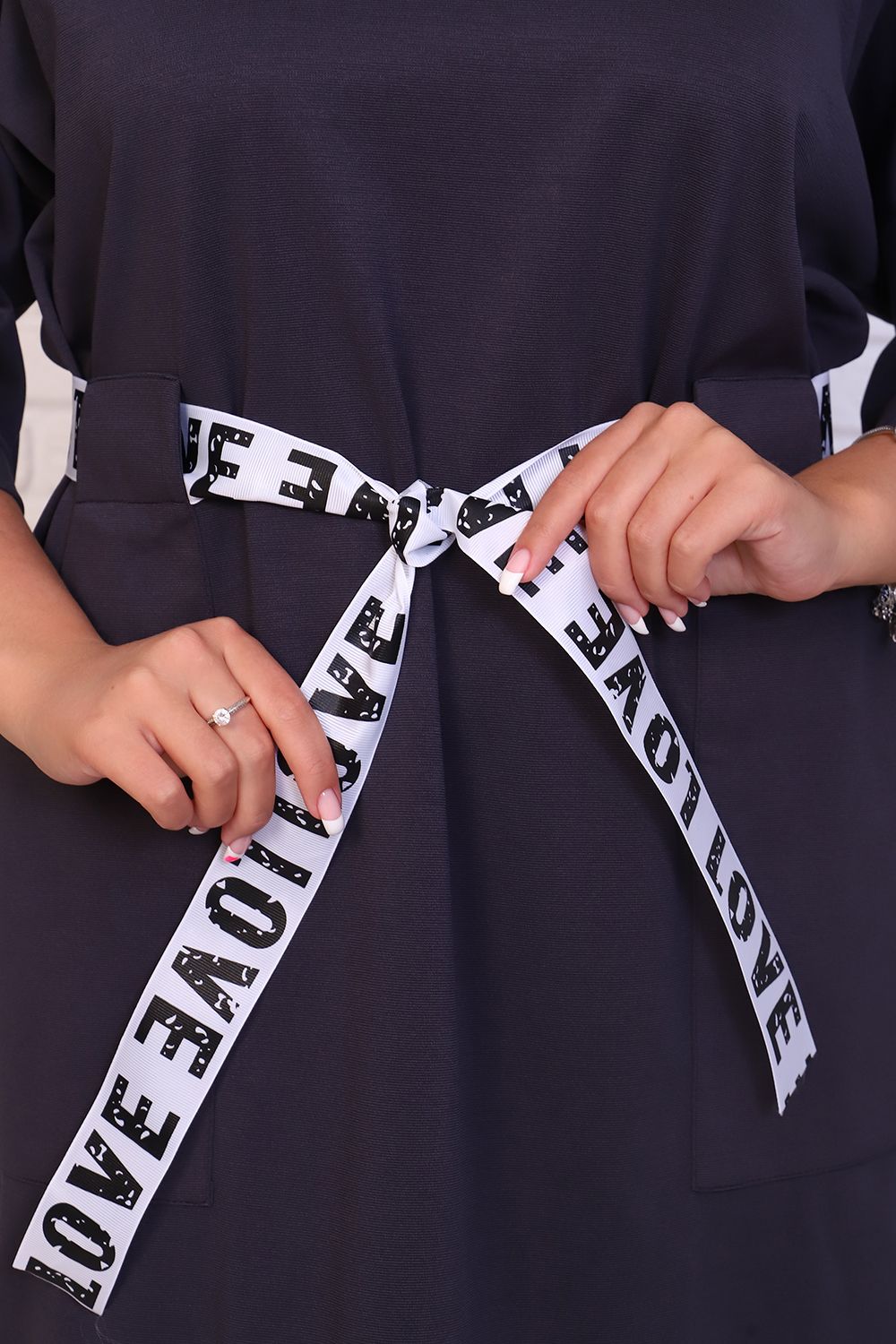 Платье женское прямого кроя. Горловина отделана кантом. Спущенный рукав на манжете. Фигурные накладные карманы. Через шлевки продет пояс из декоративной ленты. По низу изделия настрочена лента. Сбоку небольшой разрез.