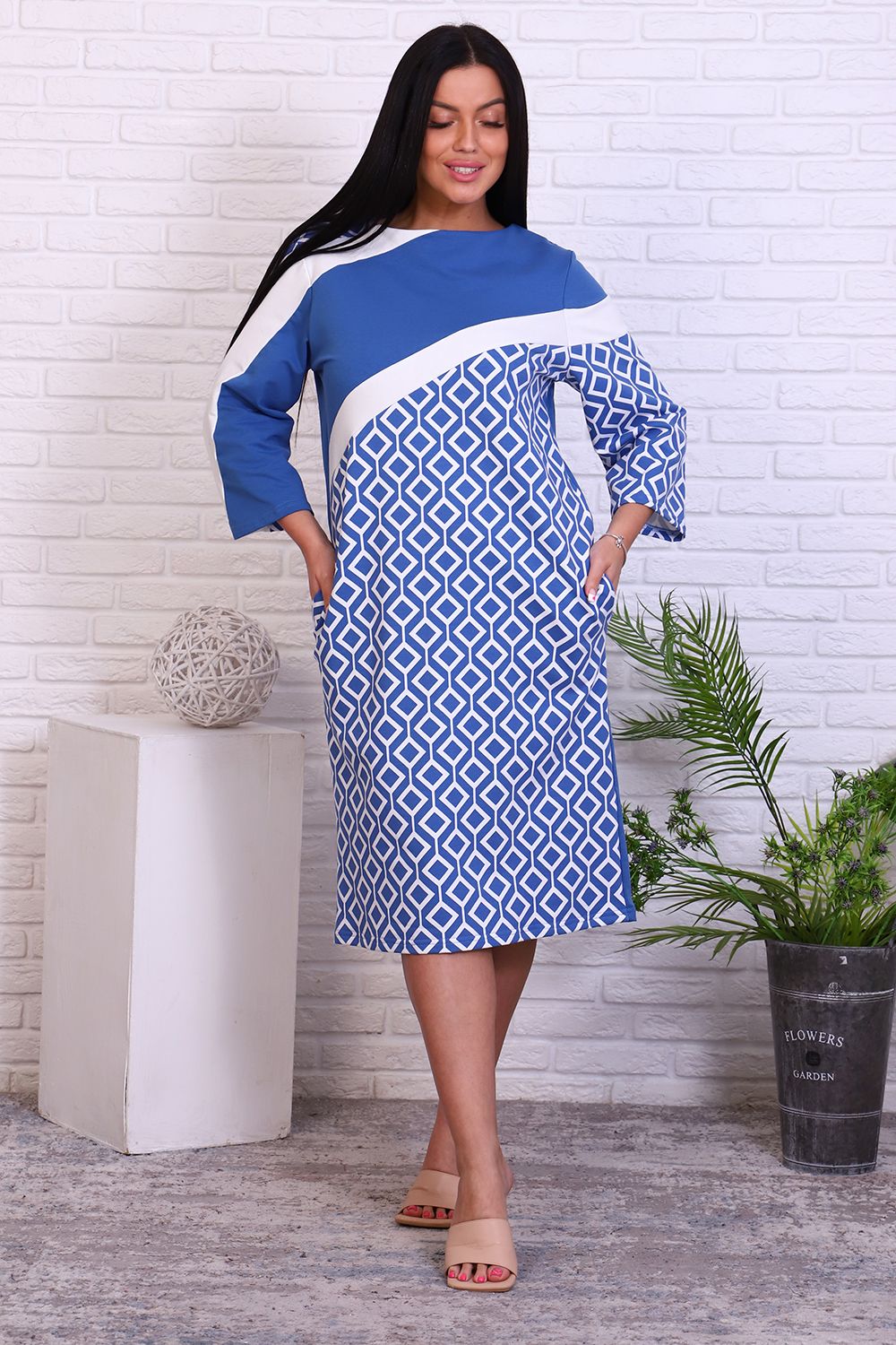Элегантное женское платье оригинального кроя из комбинированного футера. Платье прямого силуэта с карманами в боковых швах. На полочке и рукавах декоративные вставки однотонного цвета. Рукав 3/4. Платье подойдет как для офиса, так и для выхода в ресторан.