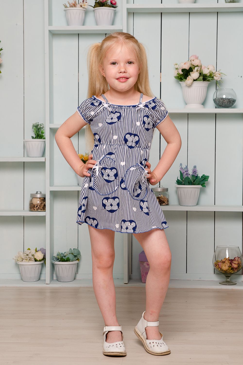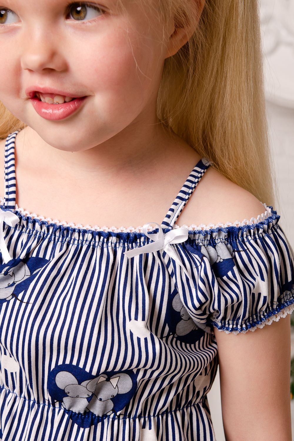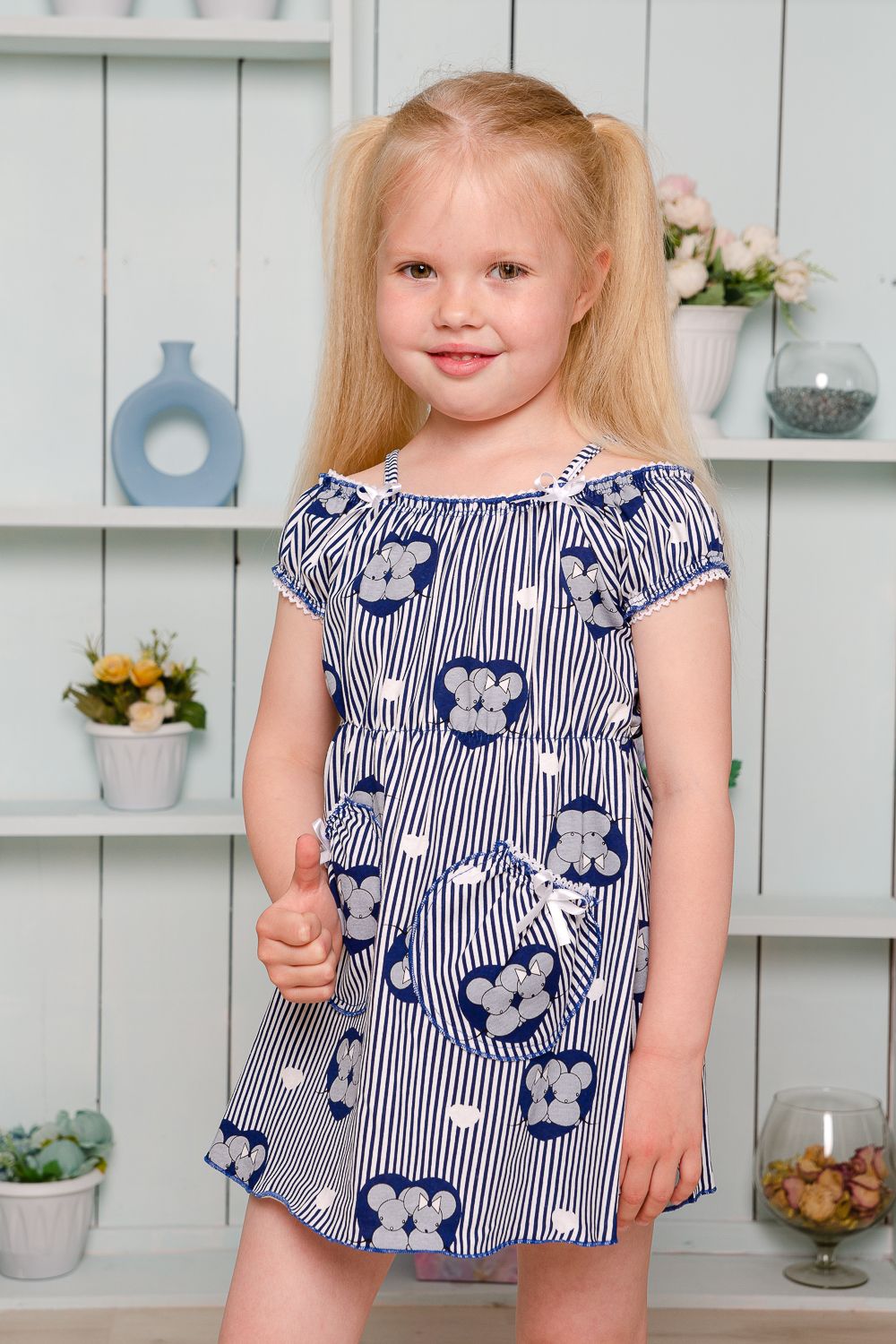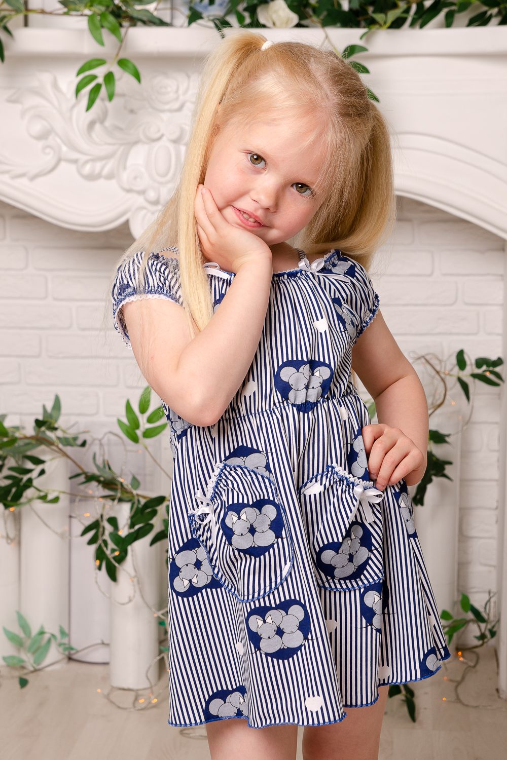 Платье детское летнее. Приталенного силуэта, на тонких бретелях. Верх платья оформлен декоративной кружевной резинкой. По линии талии изделие собрано на тонкую резинку. Снизу на полочке два накладных кармашка с бантиками из атласной тесьмы. Все срезы изделия обработаны декоративной краеобметочной строчкой.