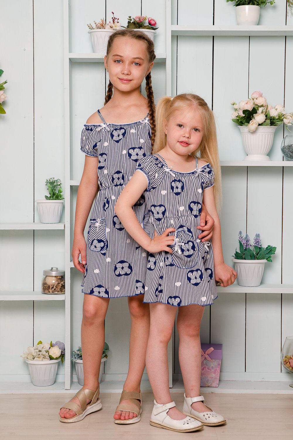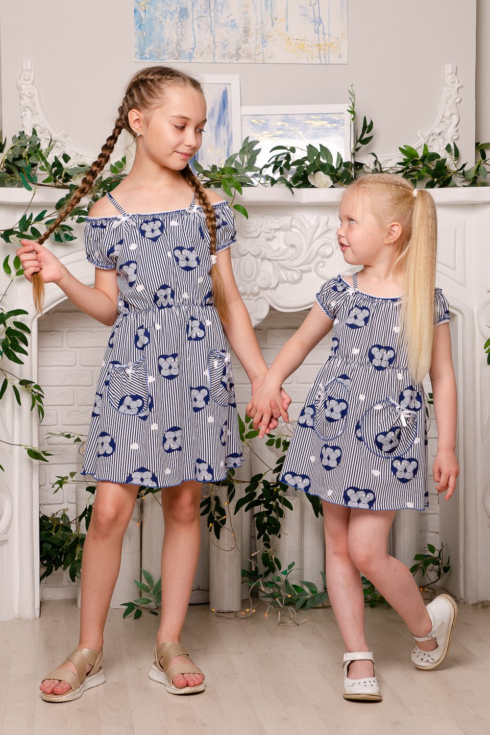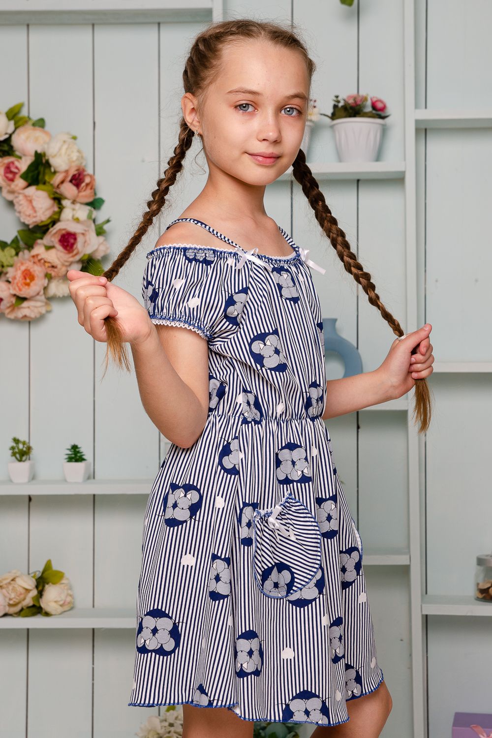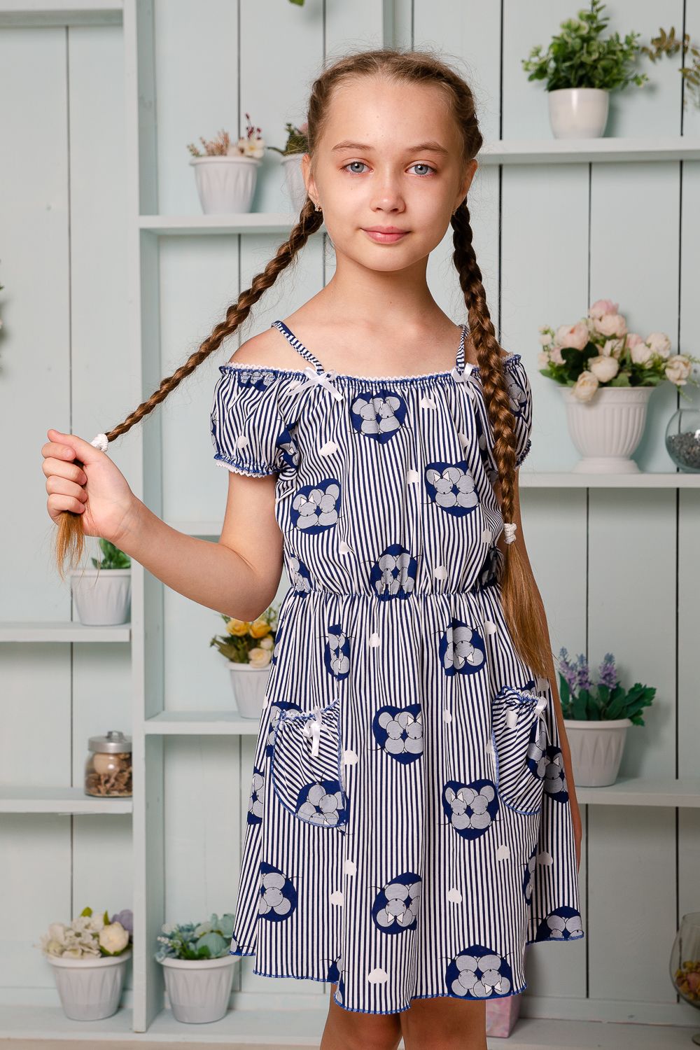 Платье детское летнее. Приталенного силуэта, на тонких бретелях. Верх платья оформлен декоративной кружевной резинкой. По линии талии изделие собрано на тонкую резинку. Снизу на полочке два накладных кармашка с бантиками из атласной тесьмы. Все срезы изделия обработаны декоративной краеобметочной строчкой.