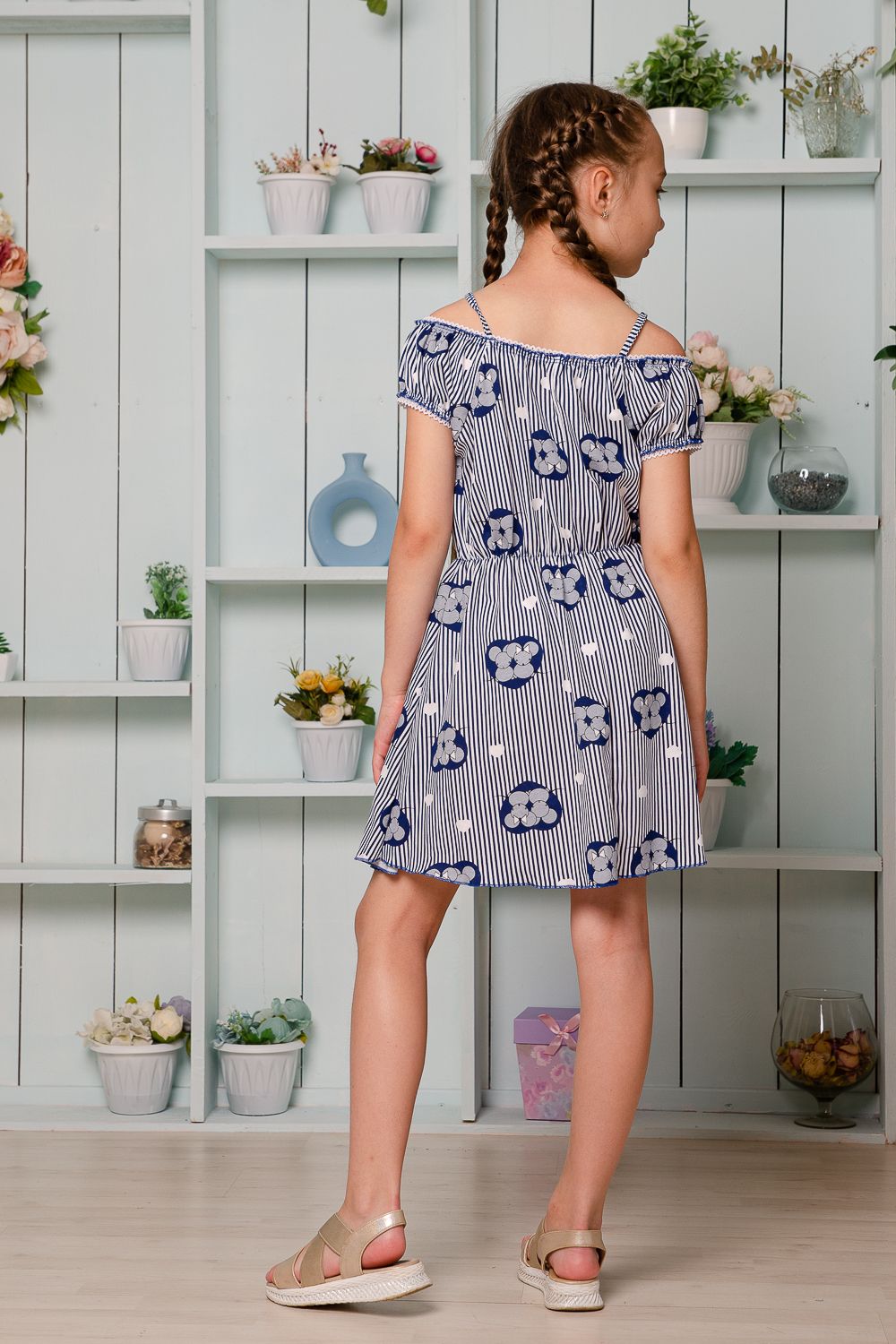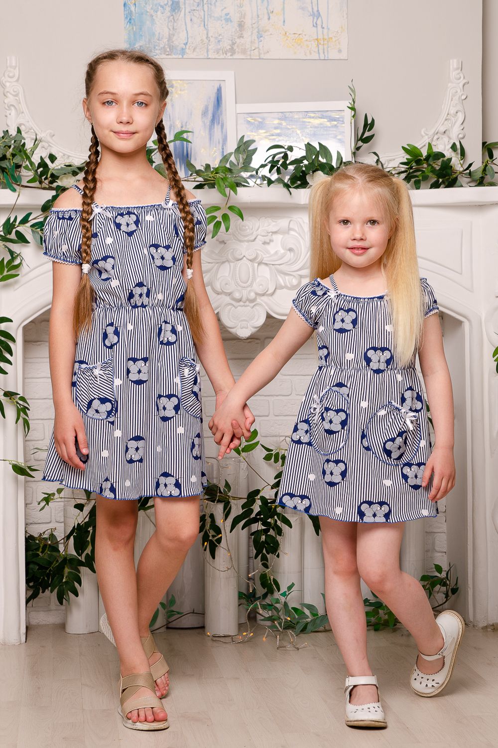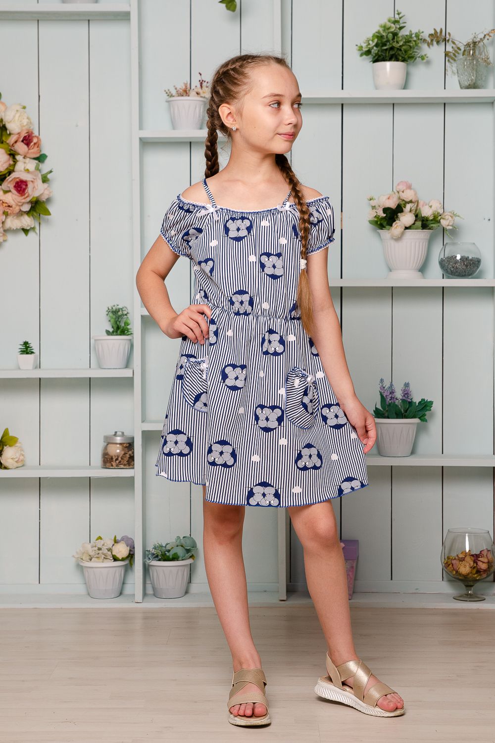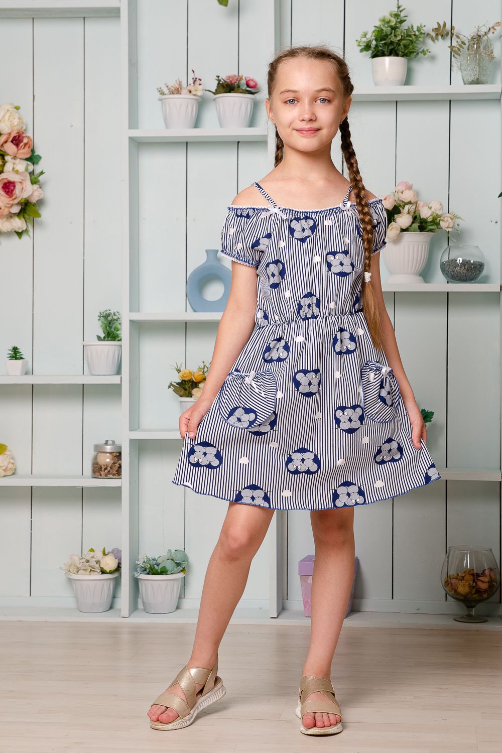 Платье детское летнее. Приталенного силуэта, на тонких бретелях. Верх платья оформлен декоративной кружевной резинкой. По линии талии изделие собрано на тонкую резинку. Снизу на полочке два накладных кармашка с бантиками из атласной тесьмы. Все срезы изделия обработаны декоративной краеобметочной строчкой.
