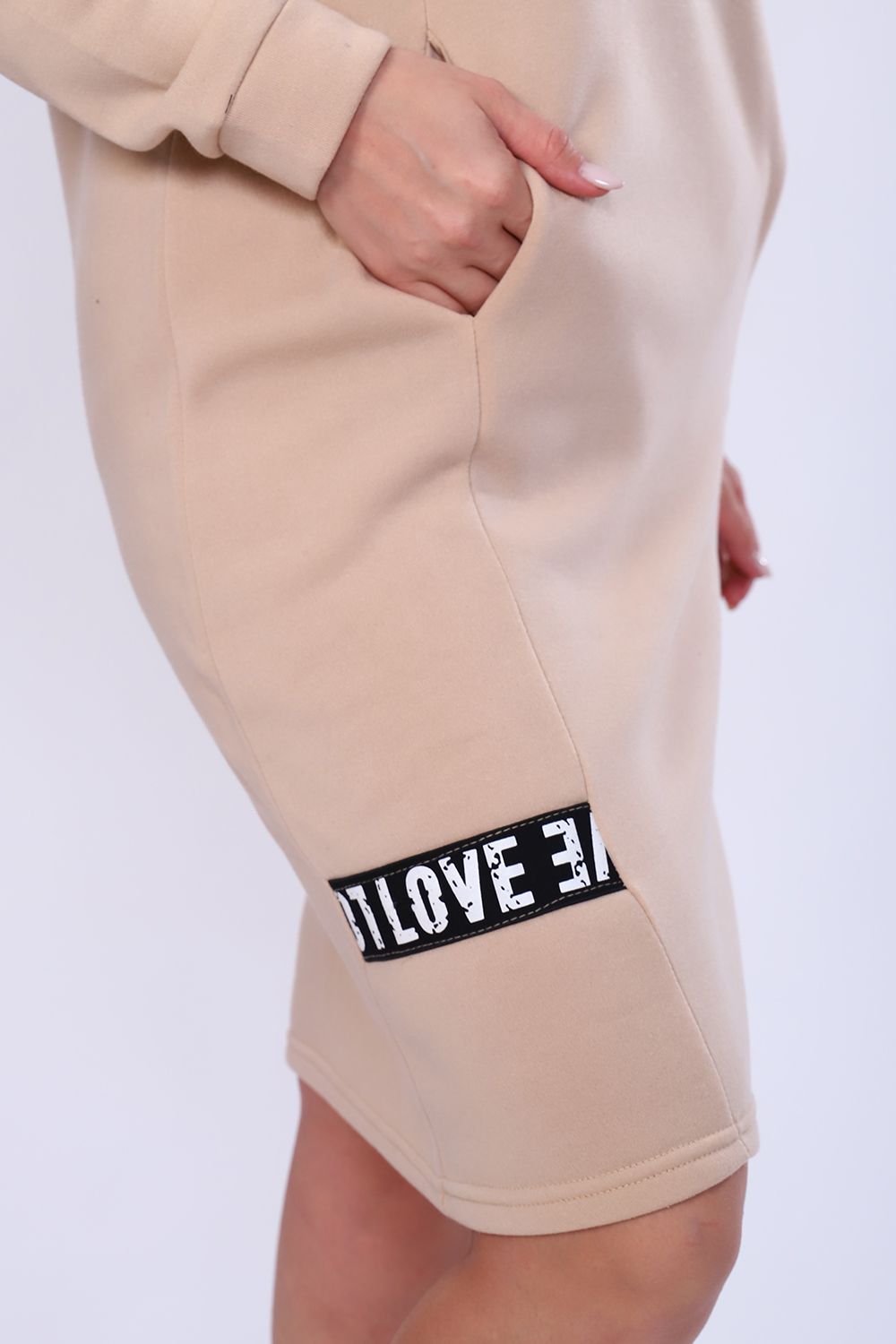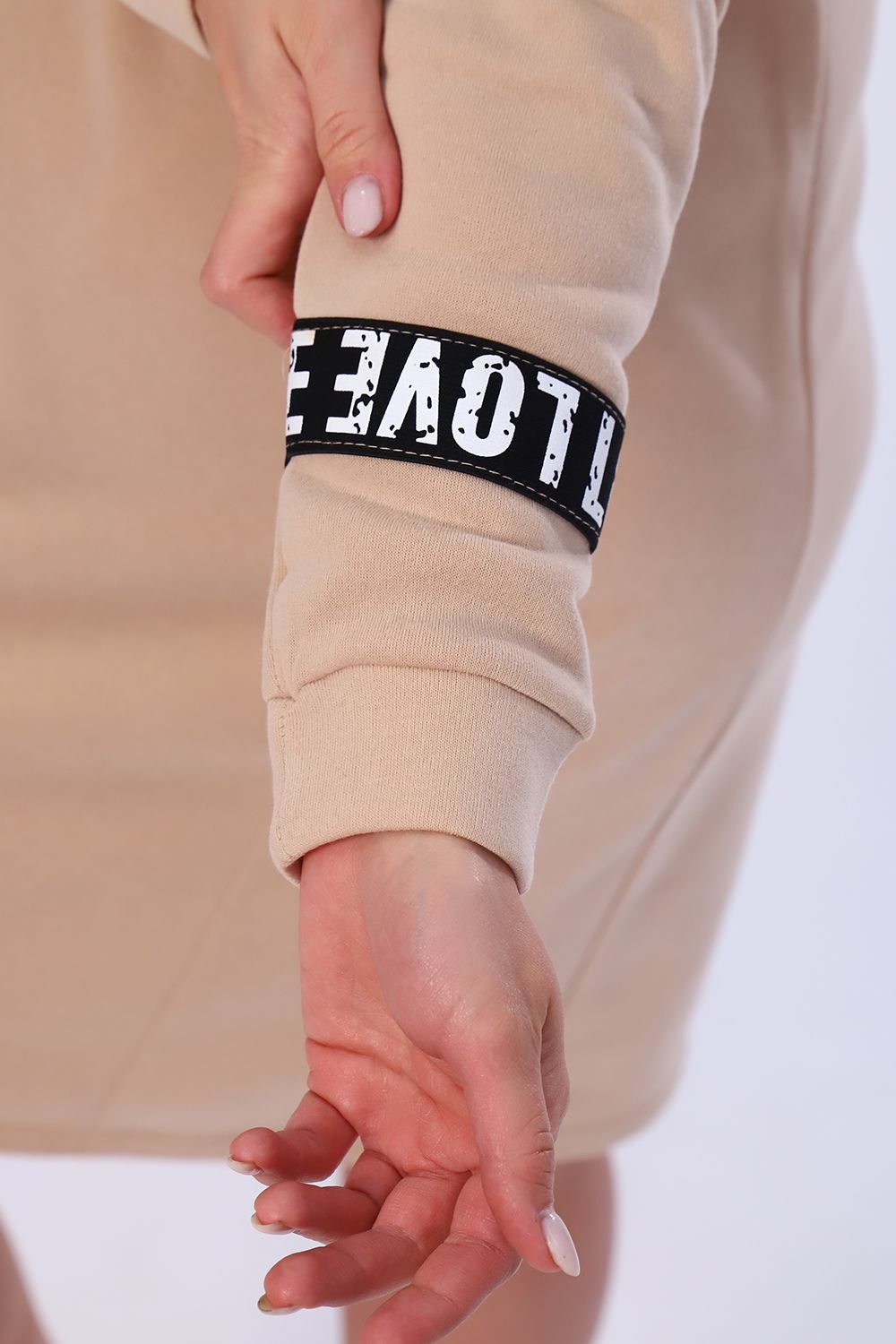 Комплект одежды платье + шапка. Платье прямого силуэта, с капюшоном на шнуровке через люверсы. Длинный рукав на манжетах, на одном рукаве декоративная надпись. На передней полочке внутренние карманы и декоративная надпись. Шапка с отворотом и декоративными ушками. Размер шапки 46-60. Удобно и практично.